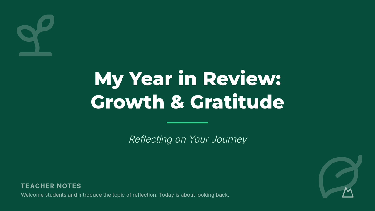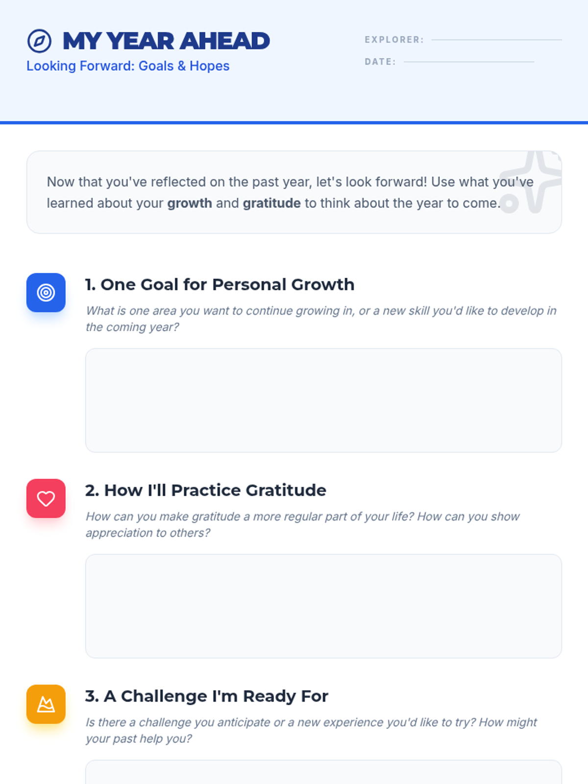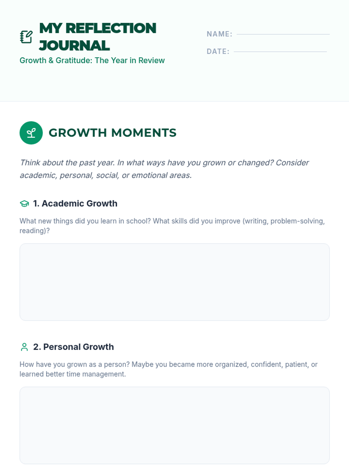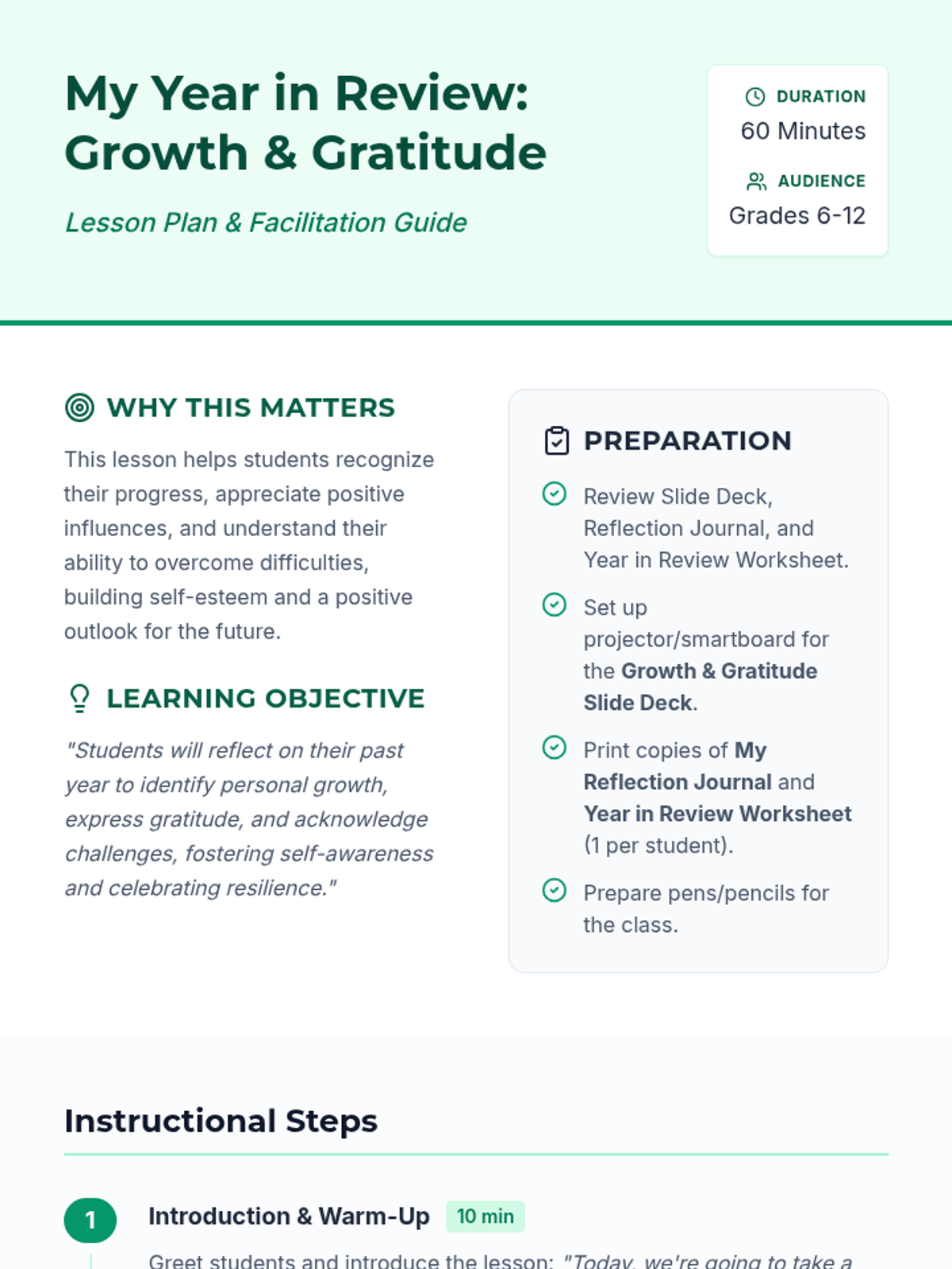 A 60-minute reflective lesson for middle and high school students to identify personal growth, express gratitude, and acknowledge challenges from the past year. Students use a structured journal and worksheet to foster self-awareness and celebrate resilience.
