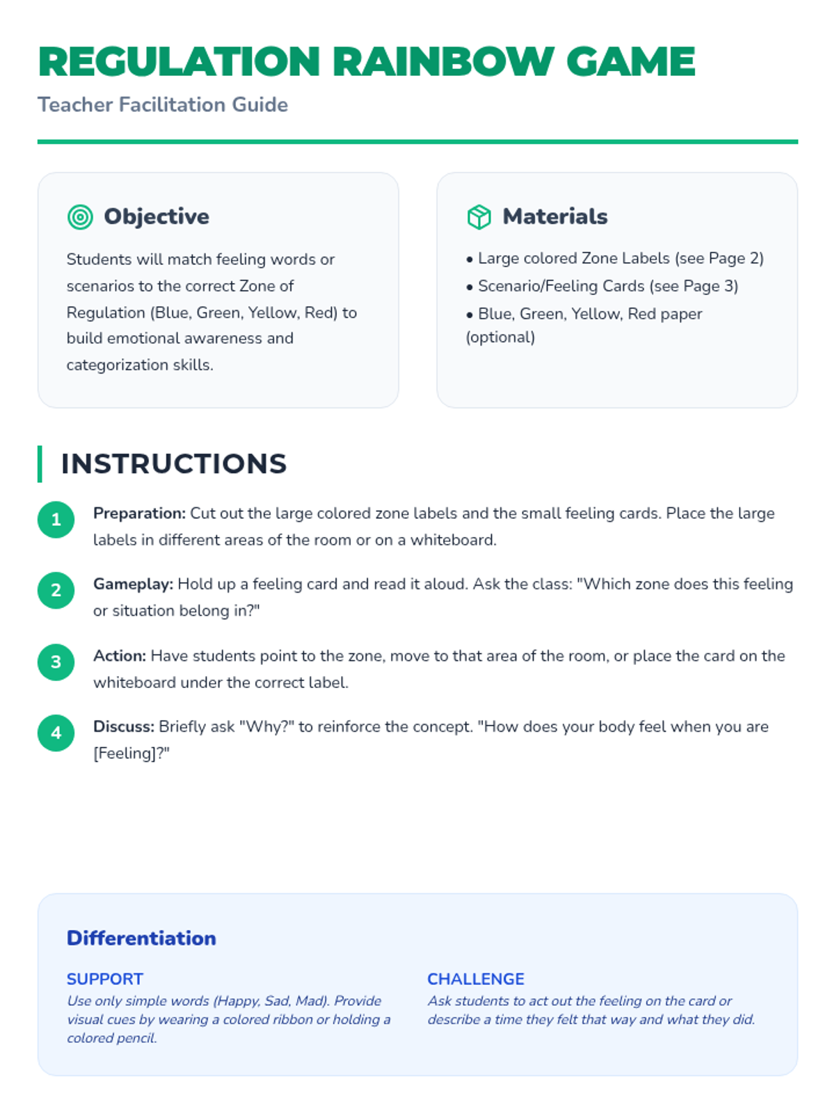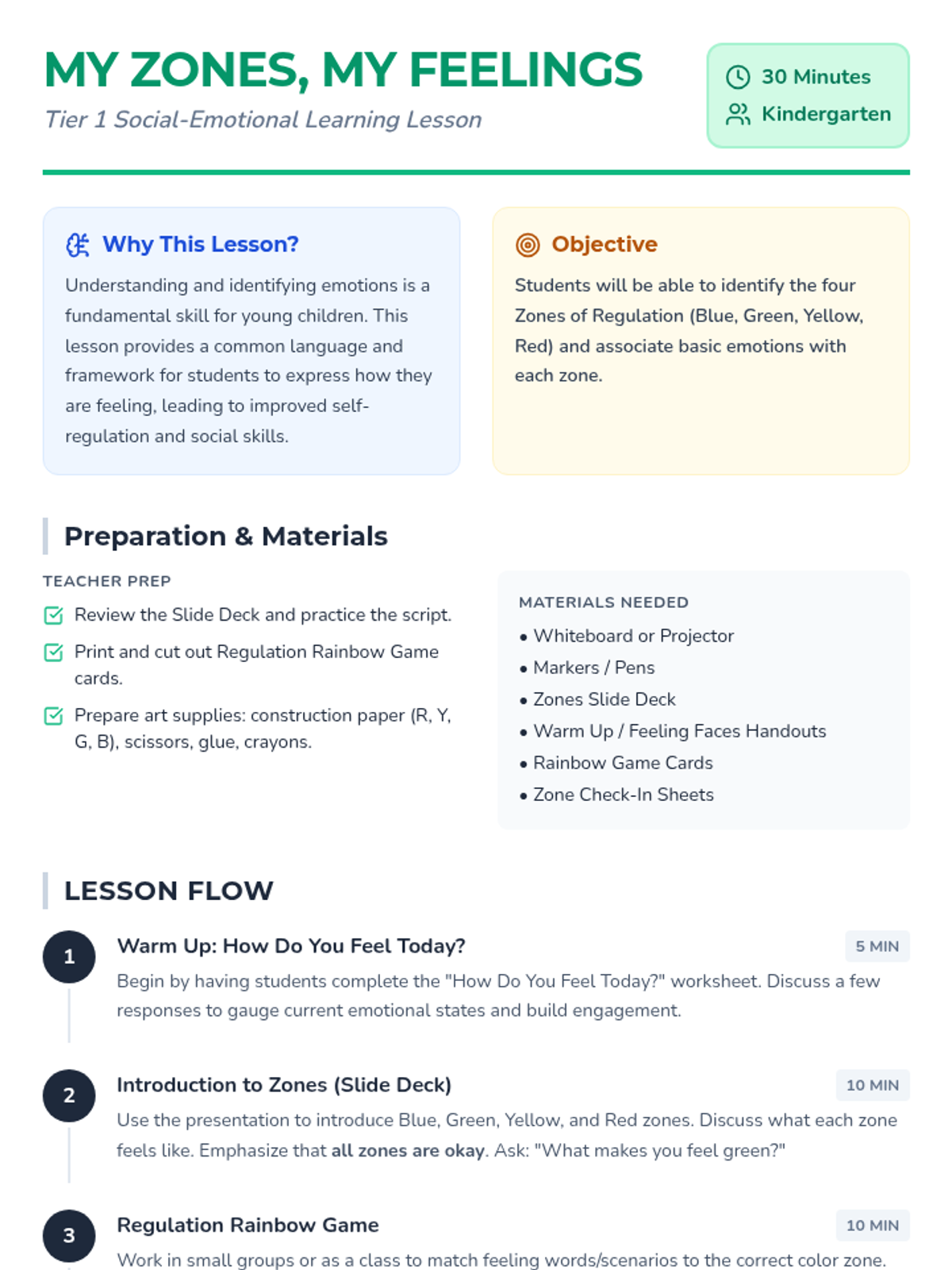 This lesson introduces Kindergarten students to the Zones of Regulation, helping them identify feelings and associate them with colored zones to foster emotional literacy.