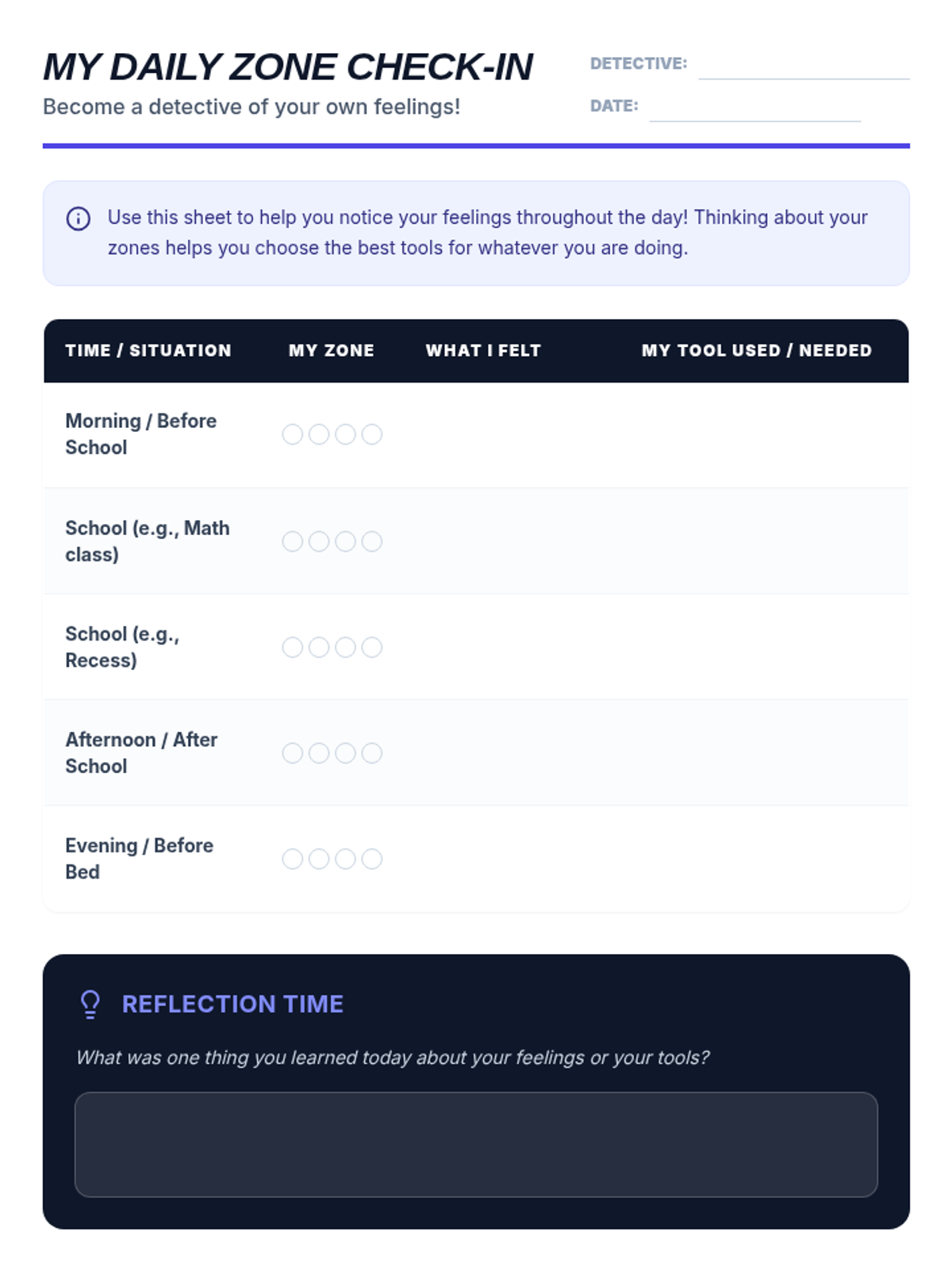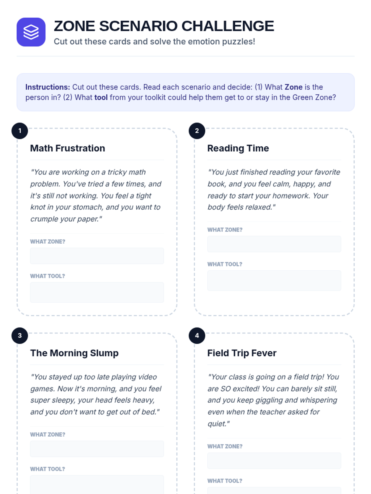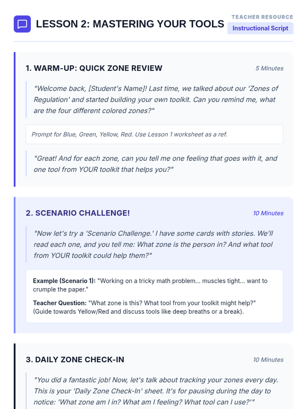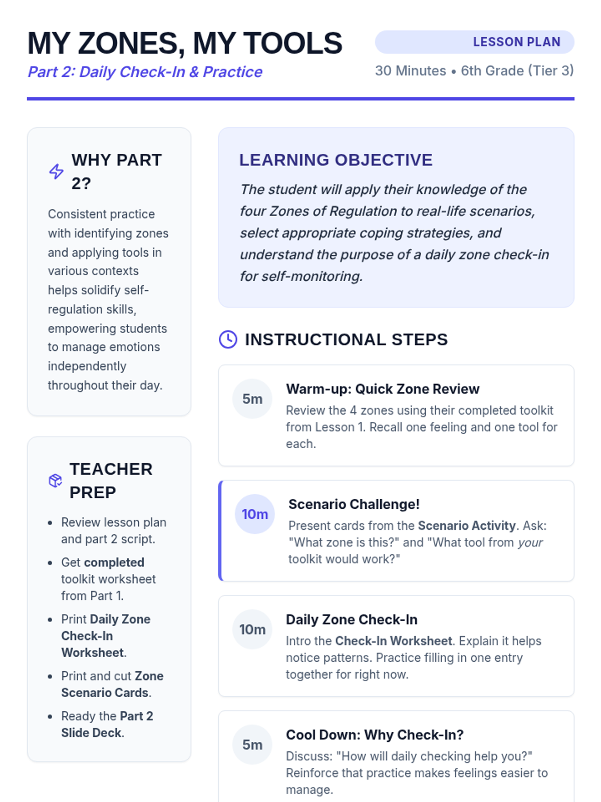 A follow-up 30-minute session focused on applying zone knowledge to real-world scenarios and implementing a daily check-in routine to monitor emotional states.