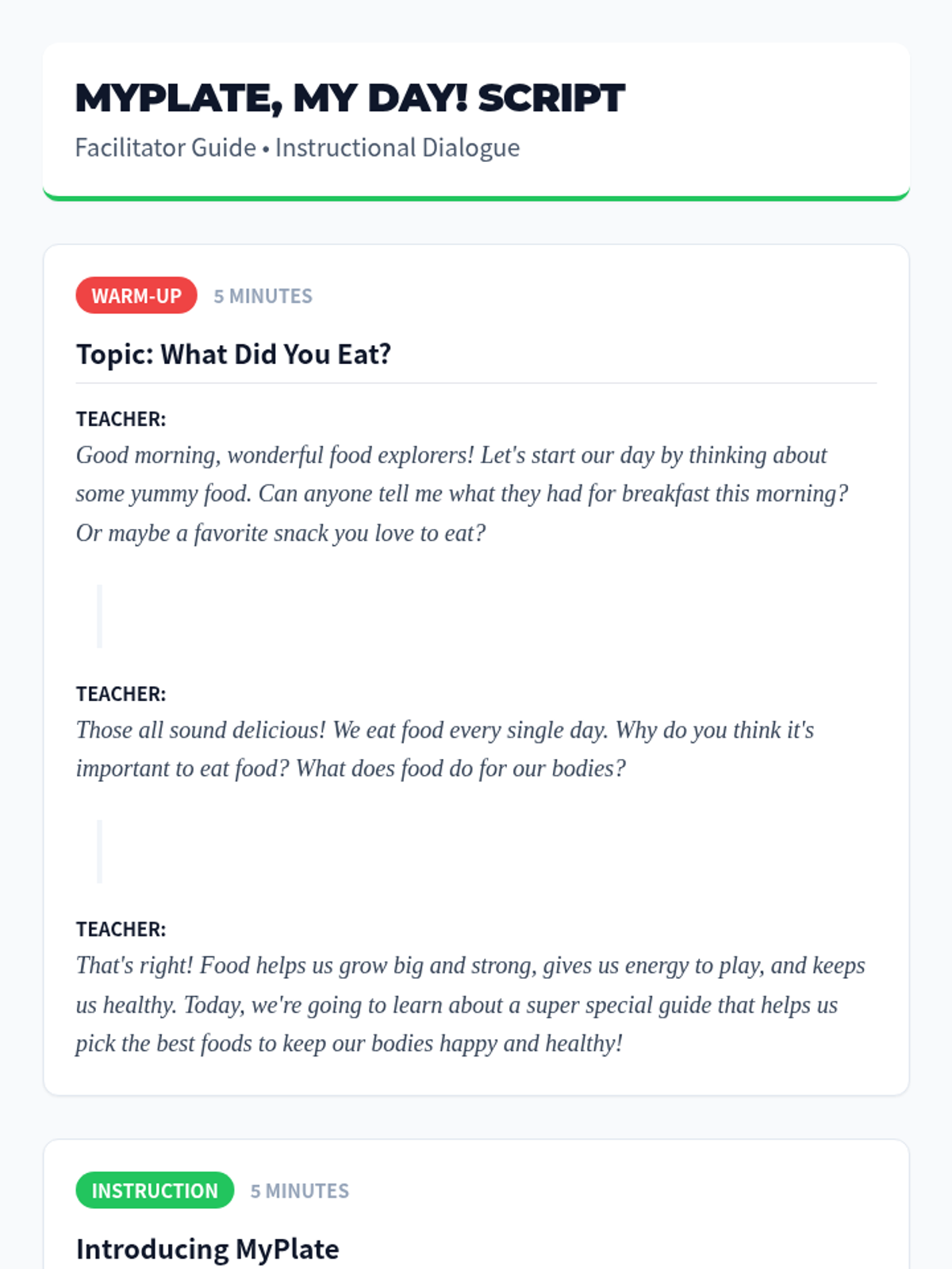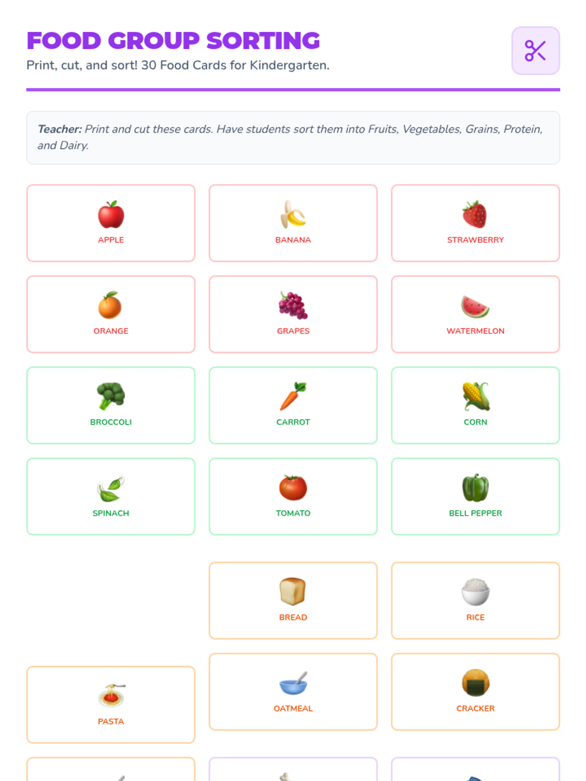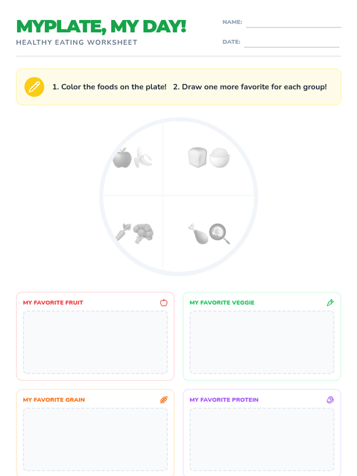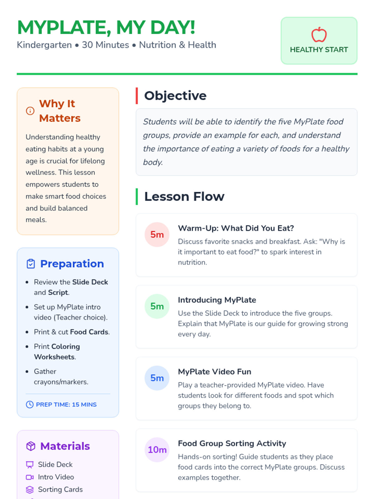 A 30-minute introductory lesson for kindergarteners about the MyPlate guidelines, featuring interactive sorting and creative coloring to learn the five food groups.