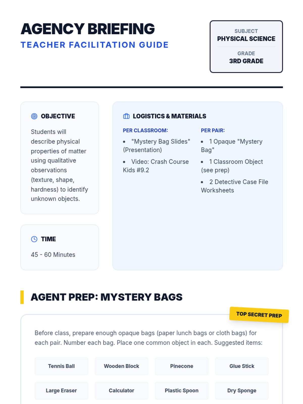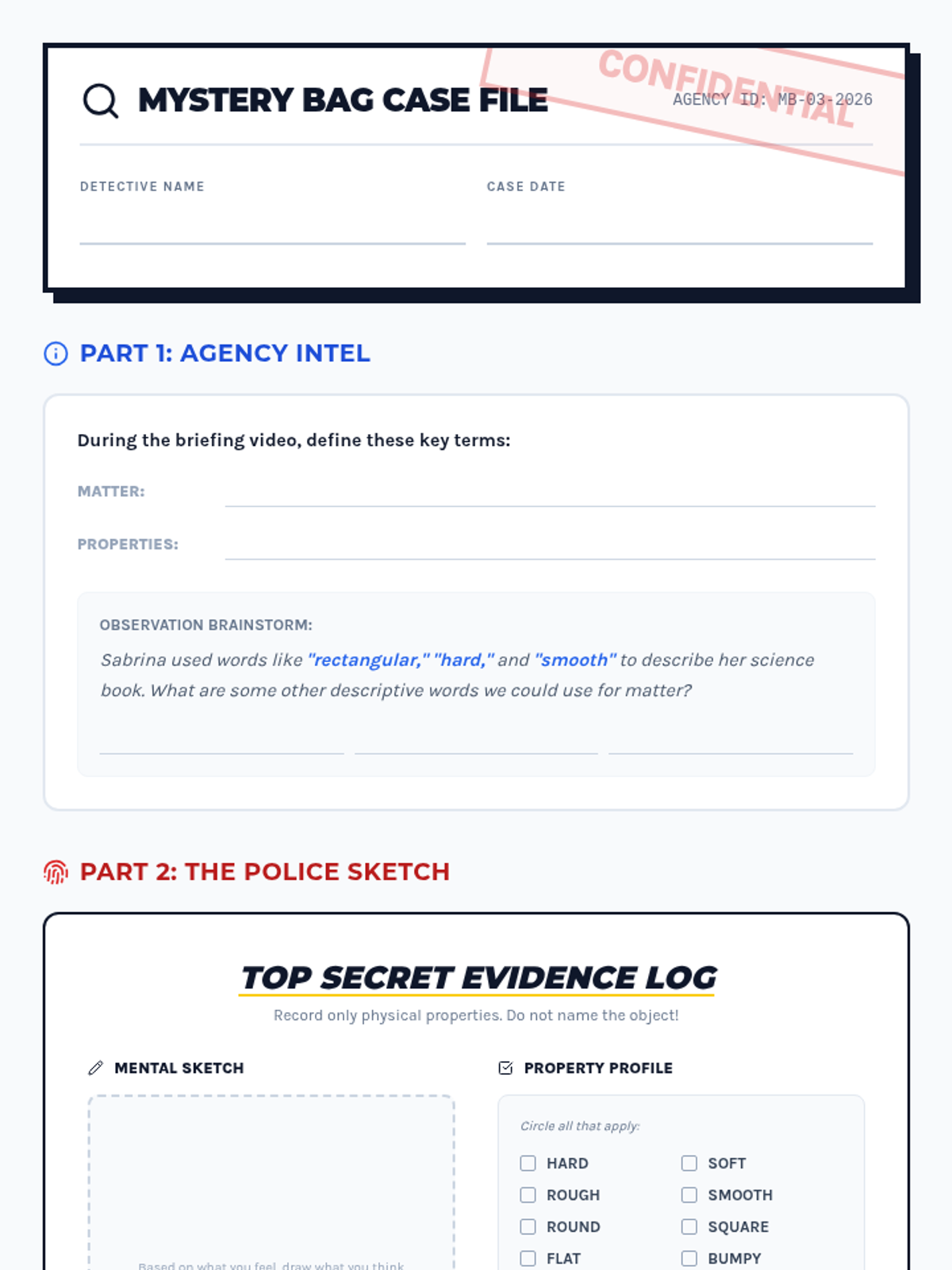 Students become detectives at 'The Mystery Bag Detective Agency,' using their senses to observe and describe the physical properties of matter. Through a mystery-themed investigation and a Crash Course Kids video, they learn to differentiate between qualitative observations and quantitative measurements.