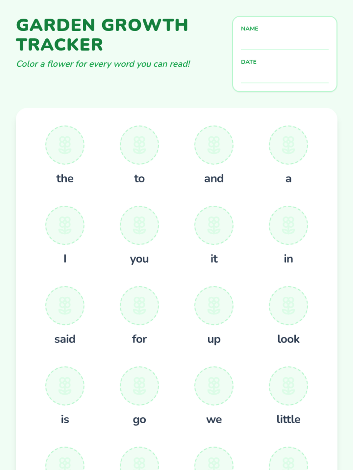A fun and engaging way for kindergarteners to master high-frequency sight words through themed flashcards and a progress tracker. This lesson focuses on the first 20 essential sight words to build early reading confidence.
