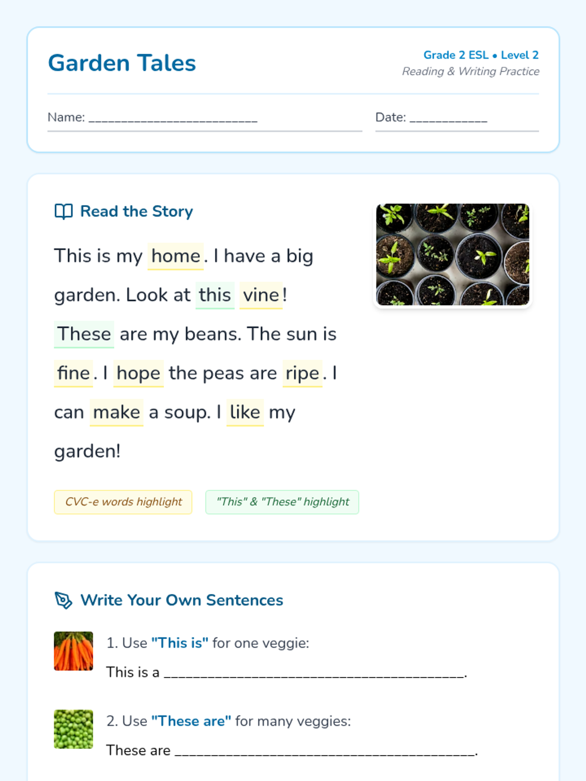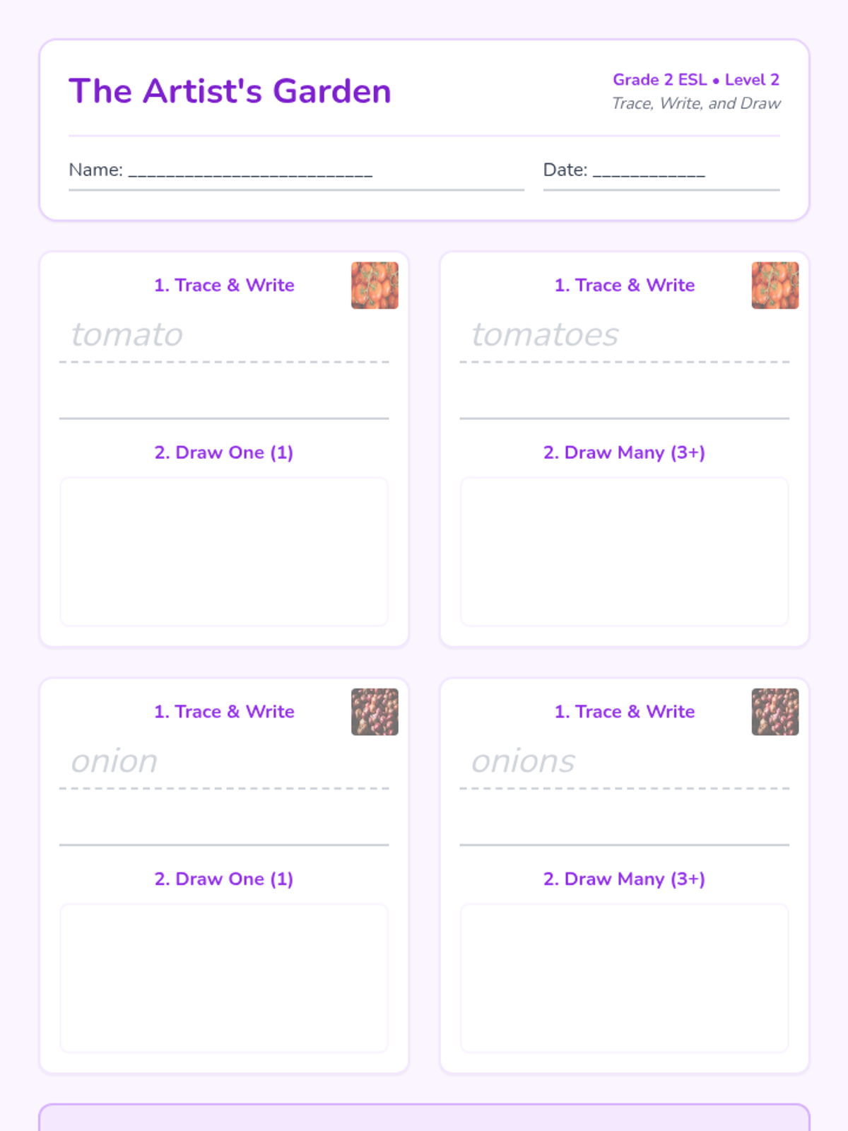 A series of engaging worksheets designed for Grade 2 ESL students to master singular and plural vegetable vocabulary through matching, sorting, writing, and drawing.
