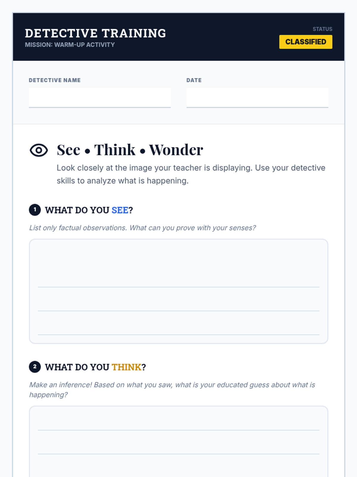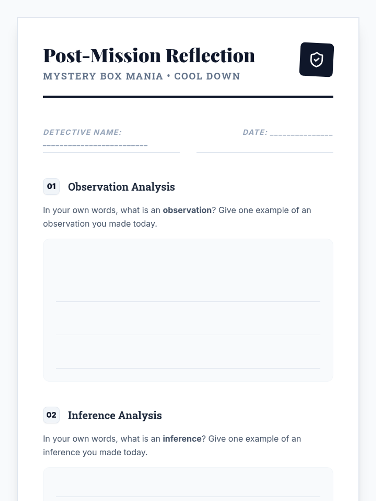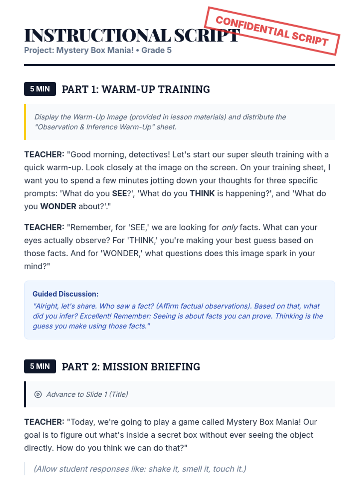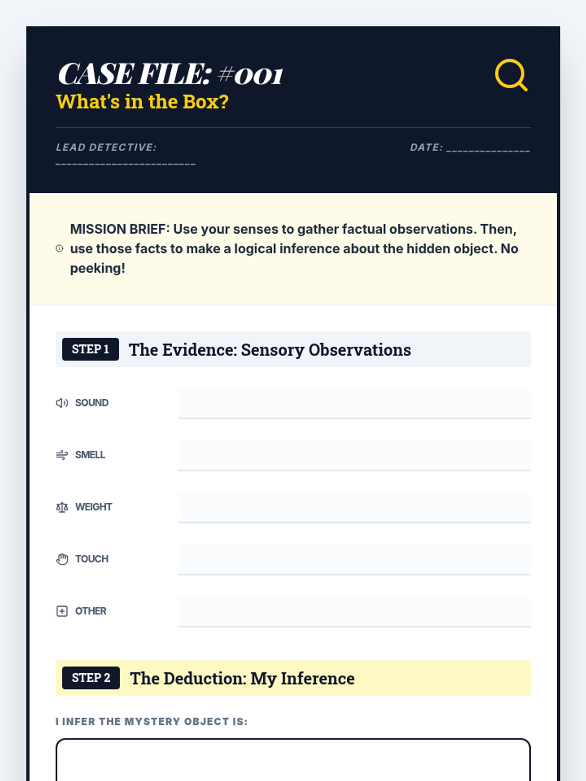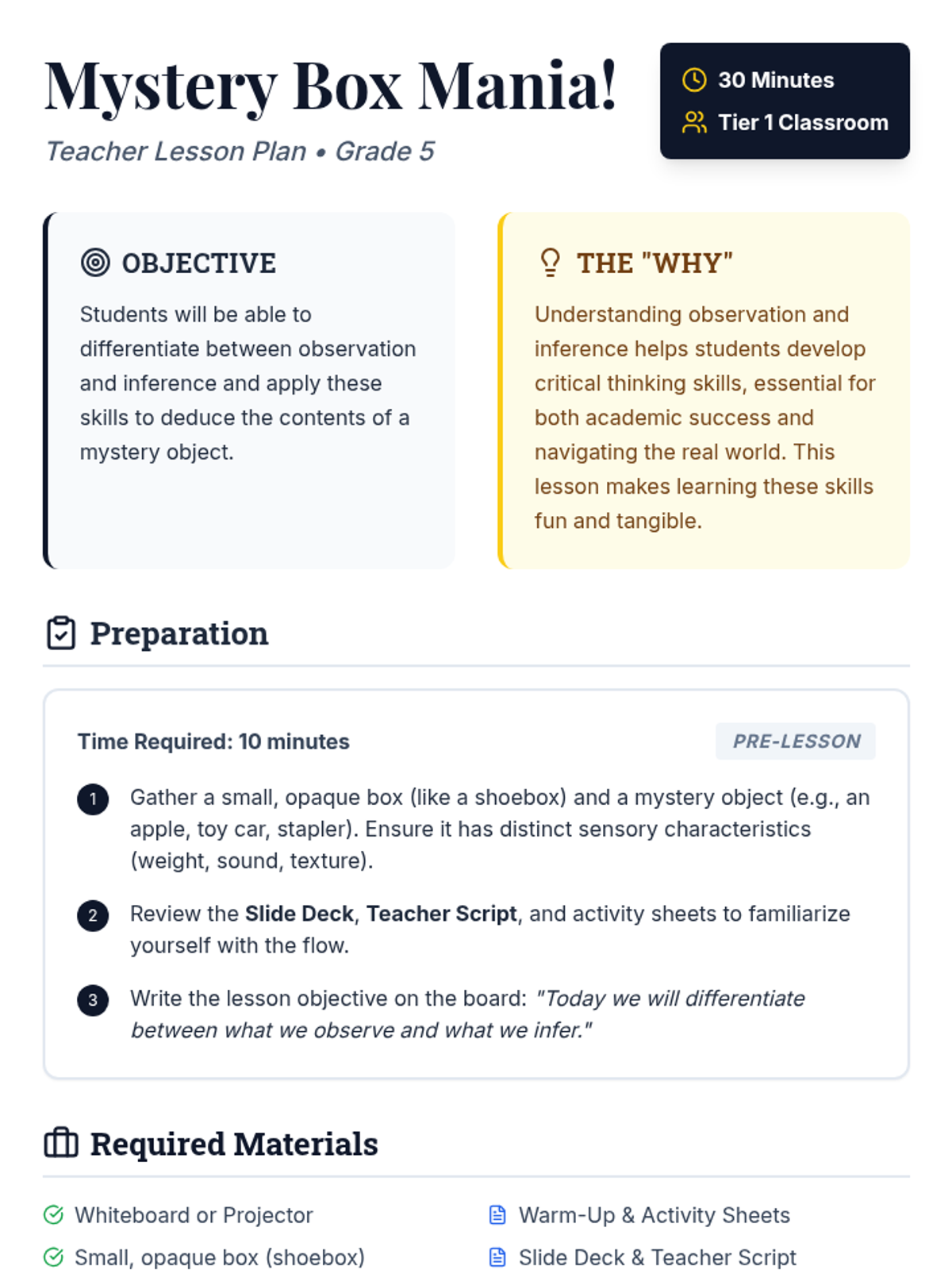 A 30-minute interactive lesson for 5th graders to master the difference between observation and inference through a hands-on mystery box challenge. Students act as detectives, gathering sensory clues and justifying their deductions based on factual evidence.