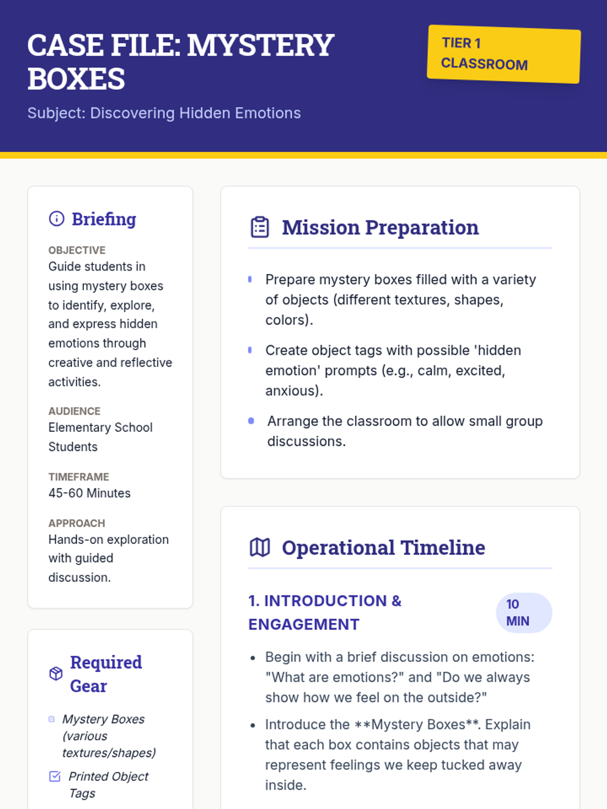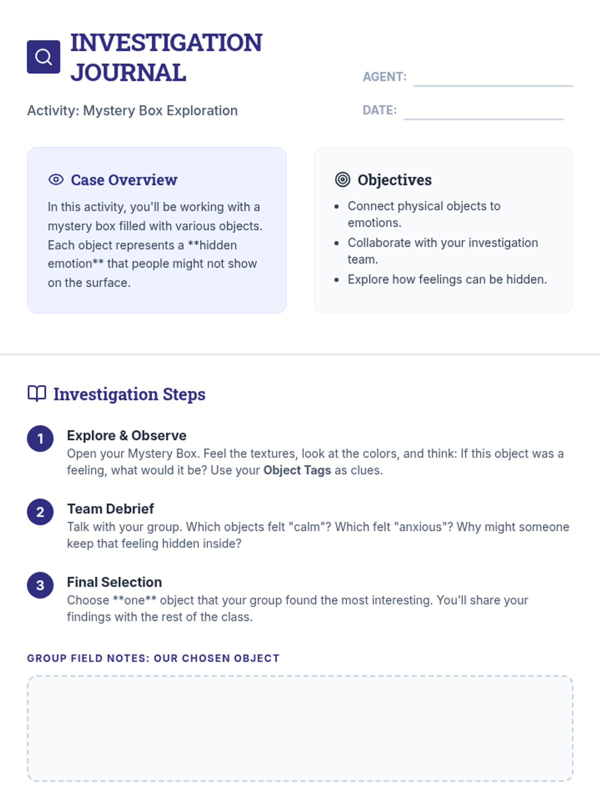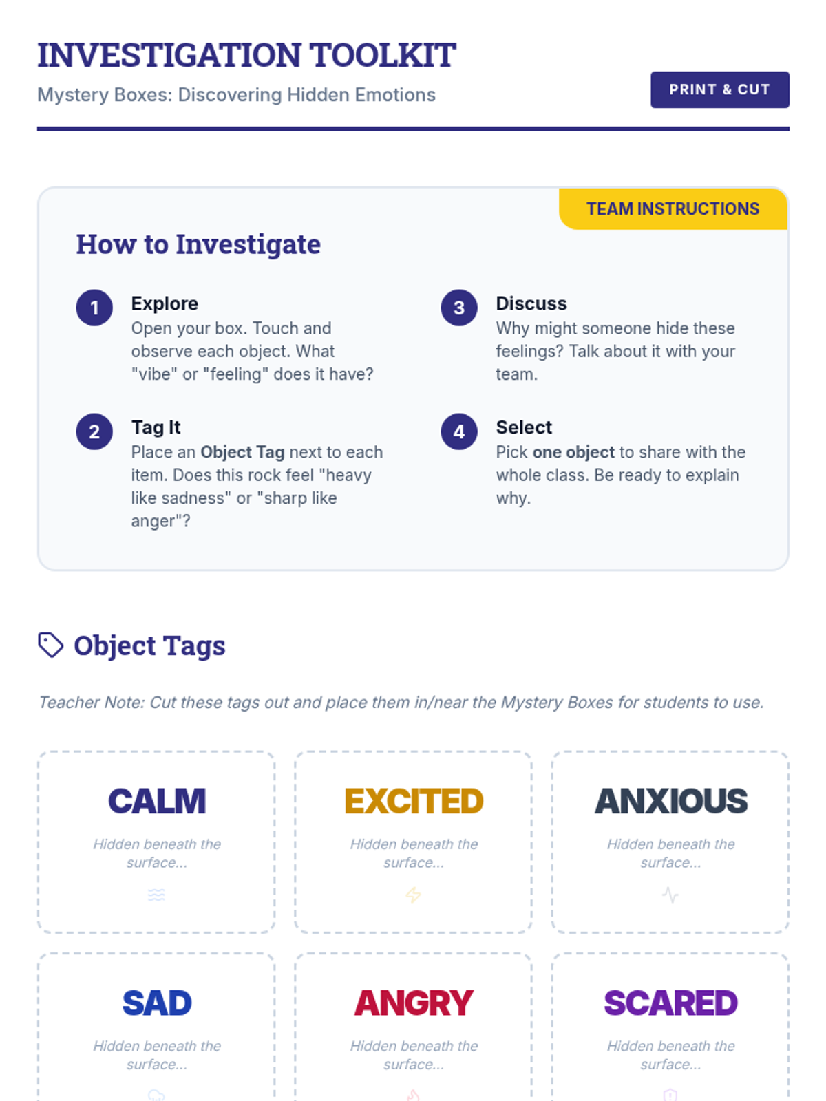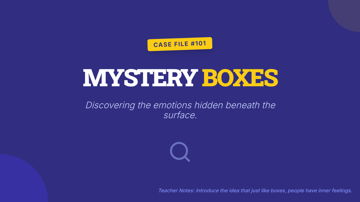 A hands-on SEL lesson where students use mystery boxes filled with objects to explore the concept of hidden emotions, building empathy and emotional awareness.