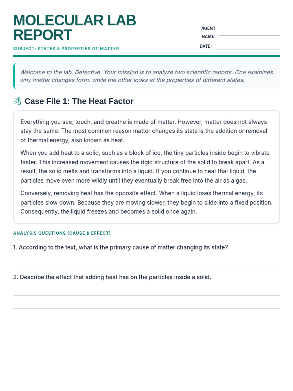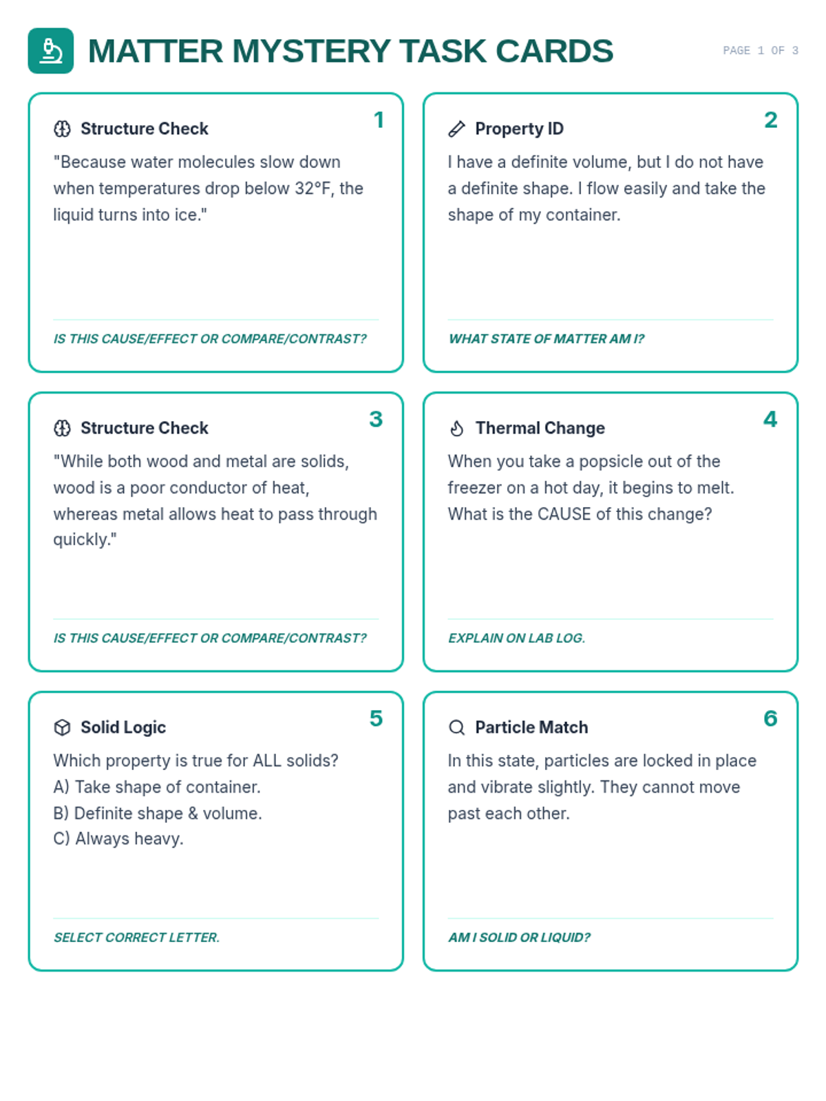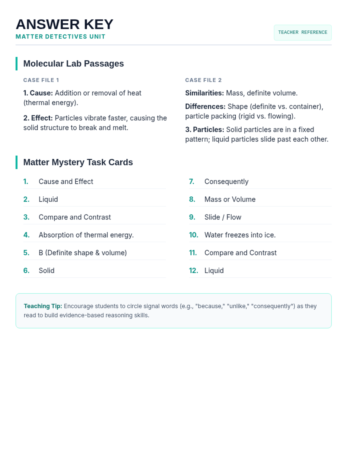 A focused lesson on matter's properties and states, using cause-and-effect and compare-and-contrast text structures to build literacy skills.