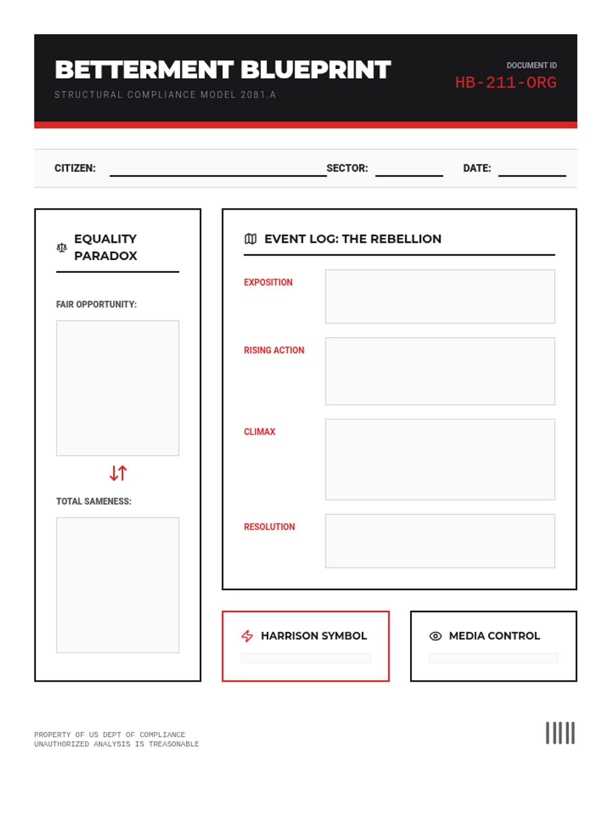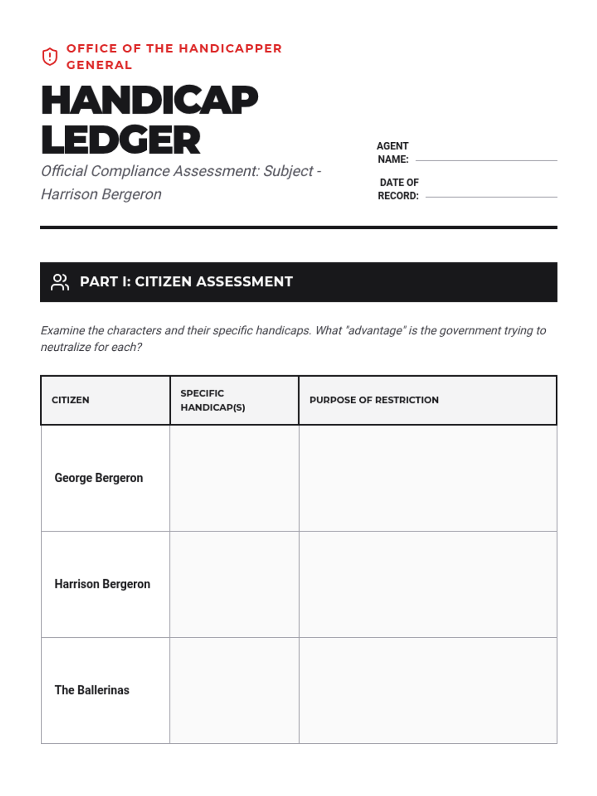 An English 11 lesson exploring Kurt Vonnegut's 'Harrison Bergeron', focusing on the themes of equality, government control, and the cost of sameness through satire.