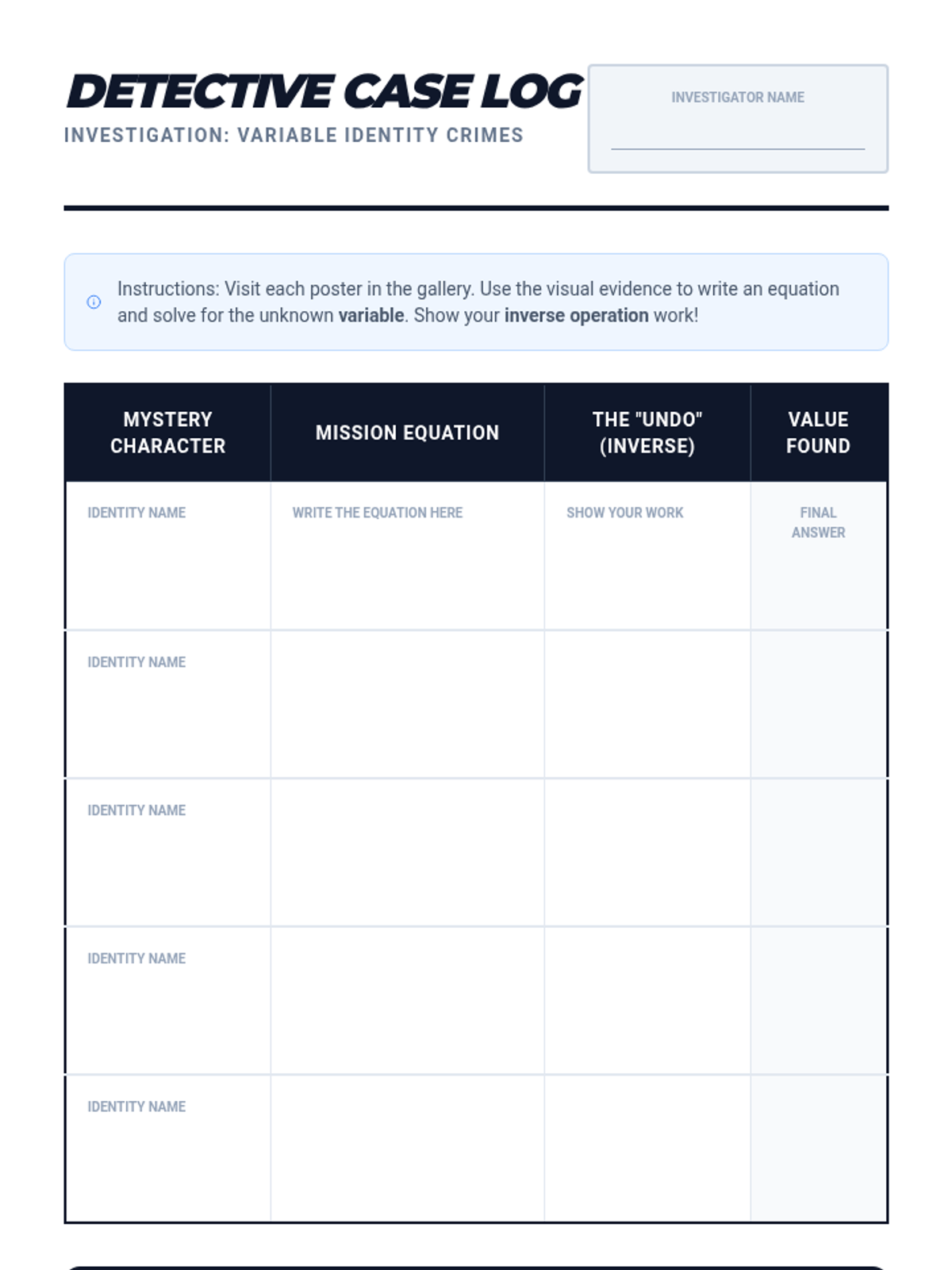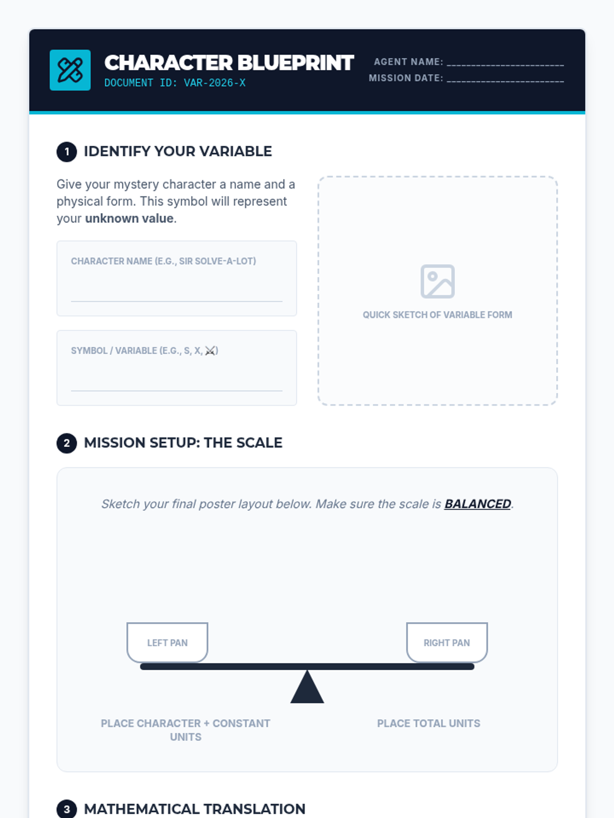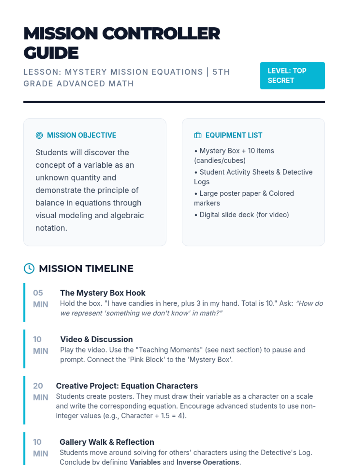 Students discover the concept of variables and the principle of balancing equations through a mystery-box hook, a video demonstration, and a creative 'Equation Character' project. Designed for 5th-grade advanced learners to bridge concrete manipulation and abstract algebraic thinking.