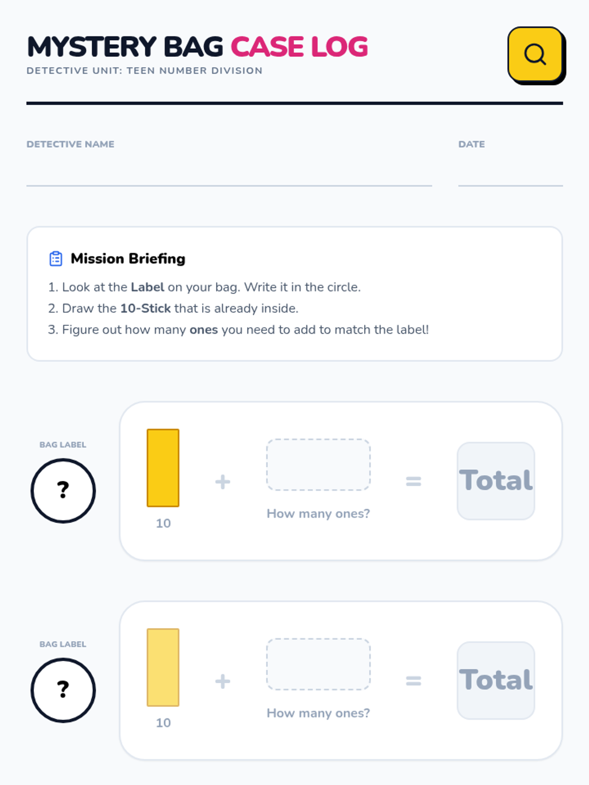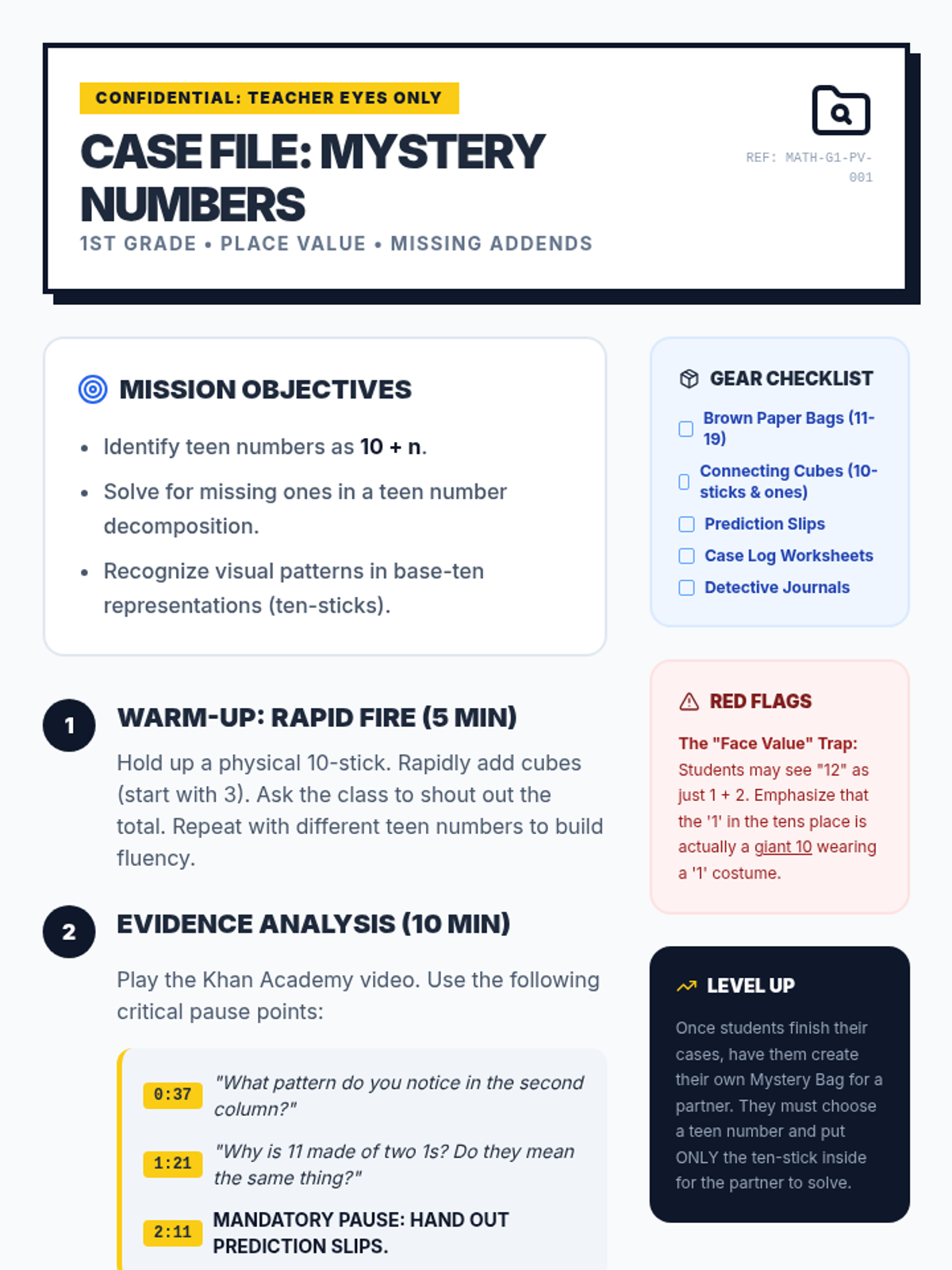 A 1st-grade lesson where students use place value knowledge (10 + some ones) to solve missing addend problems using 'Mystery Bags' and a Khan Academy video.