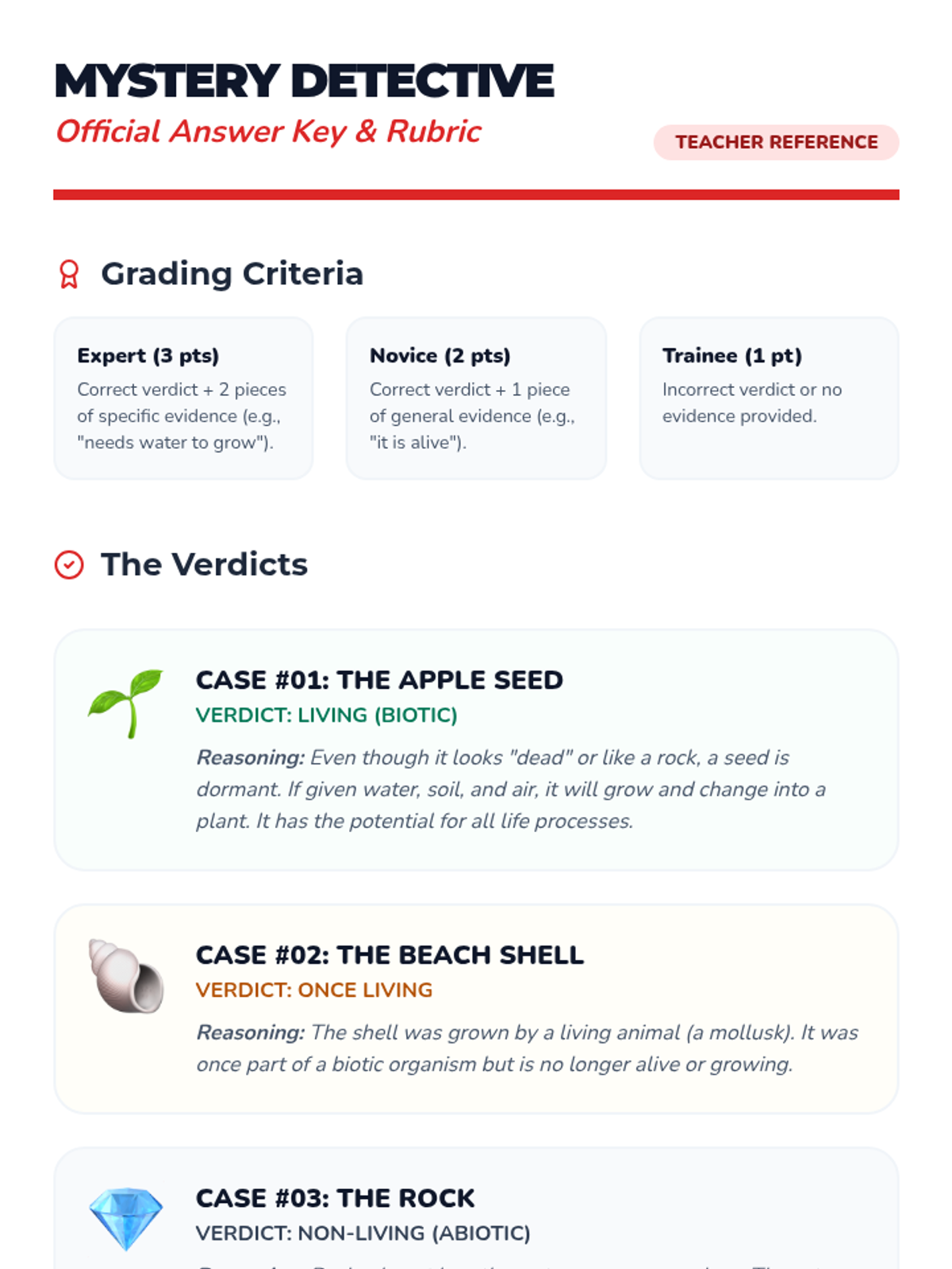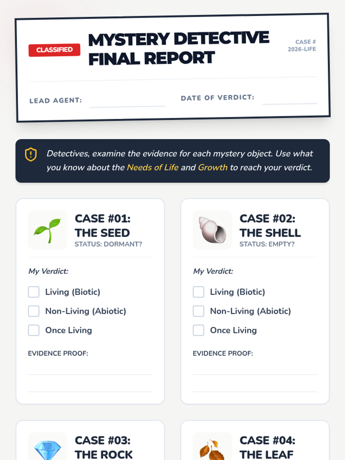 A mastery assessment where students use evidence to classify 'mystery objects' that challenge their initial assumptions.
