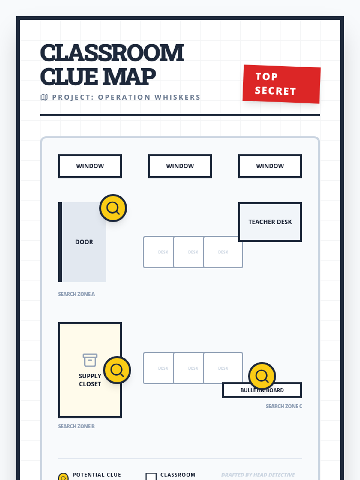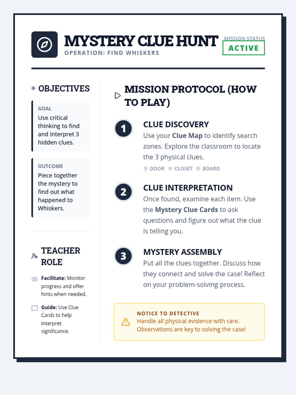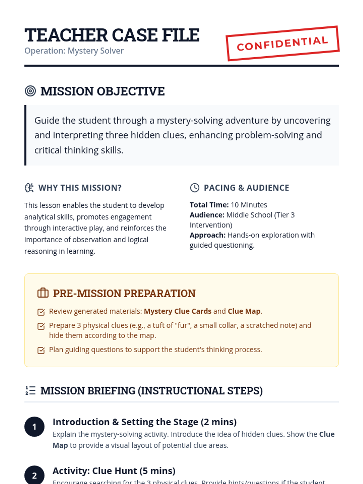 A specialized Tier 3 lesson designed for a middle school student with autism to develop critical thinking and problem-solving skills through a hands-on classroom mystery. The student will use a map and clue cards to locate and interpret three physical clues, eventually solving 'The Case of the Missing Classroom Pet'.