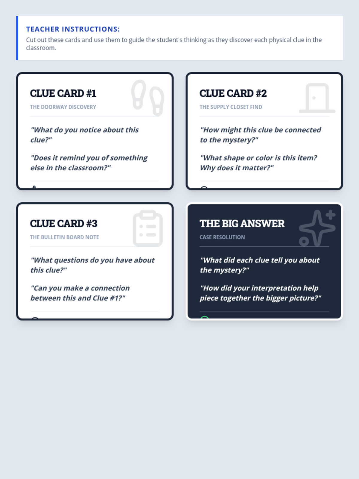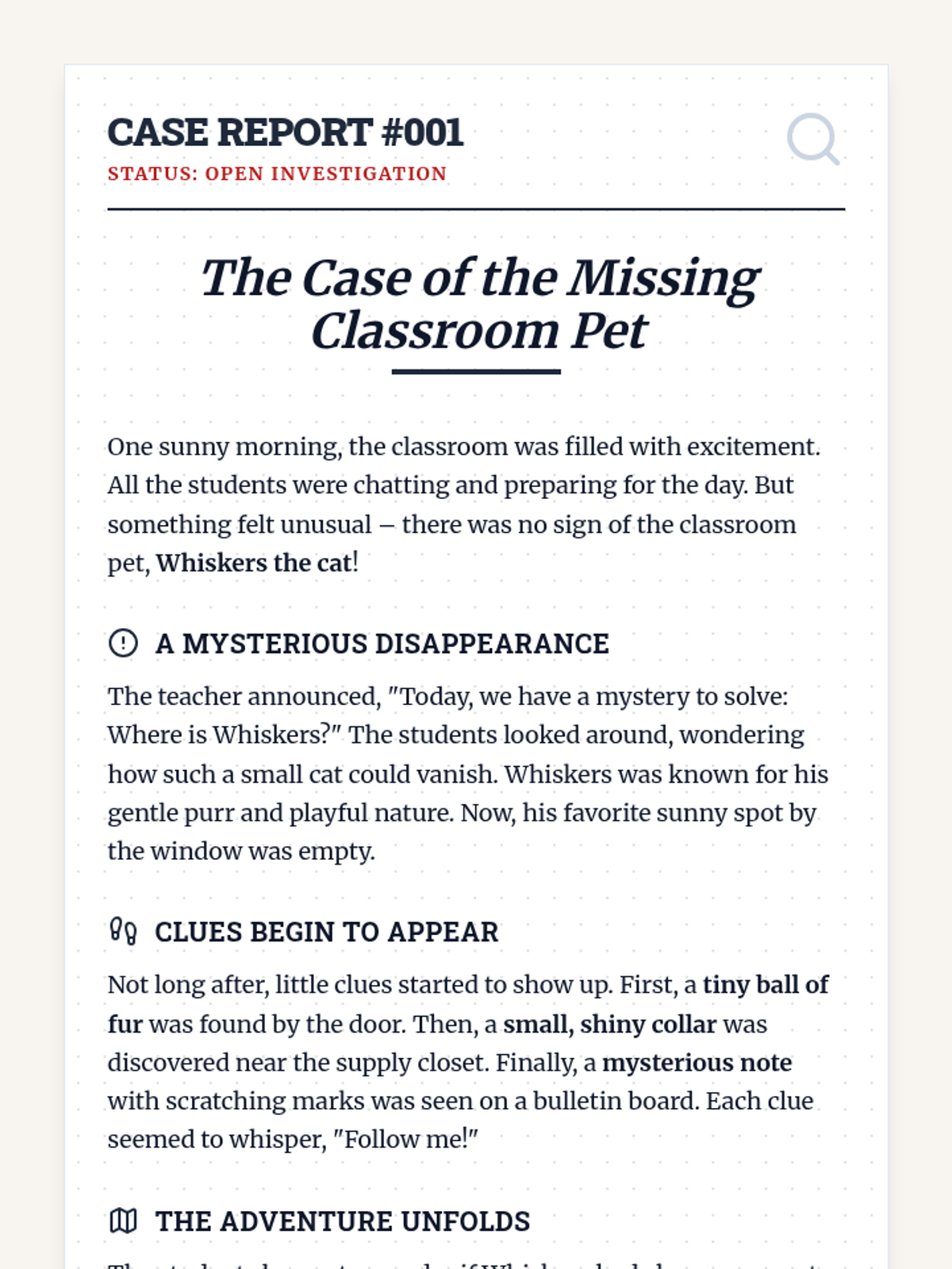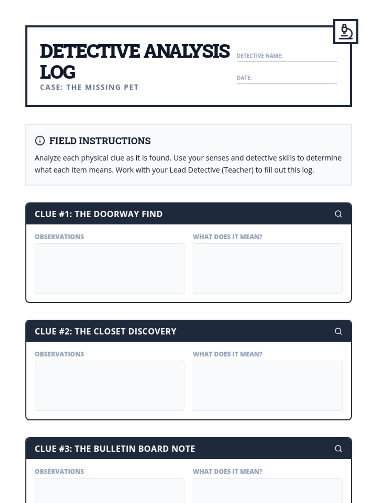 A specialized Tier 3 lesson designed for a middle school student with autism to develop critical thinking and problem-solving skills through a hands-on classroom mystery. The student will use a map and clue cards to locate and interpret three physical clues, eventually solving 'The Case of the Missing Classroom Pet'.