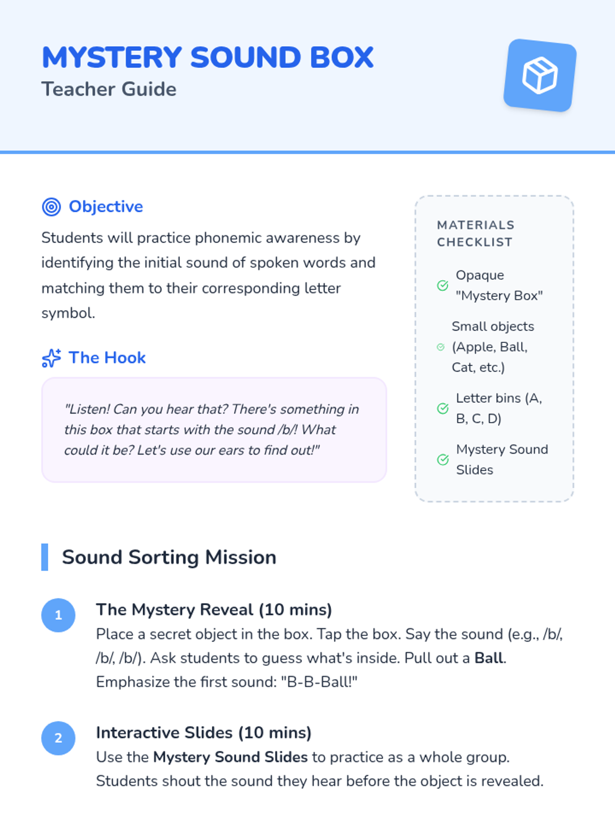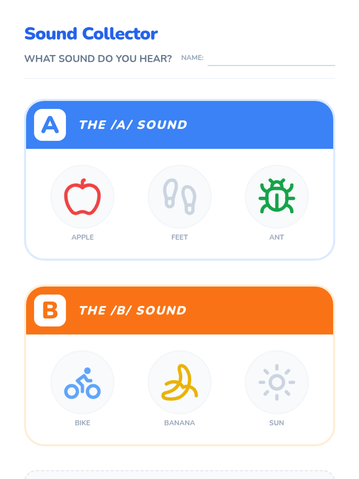 Students develop phonemic awareness by identifying the initial sounds of objects and sorting them into corresponding letter bins.