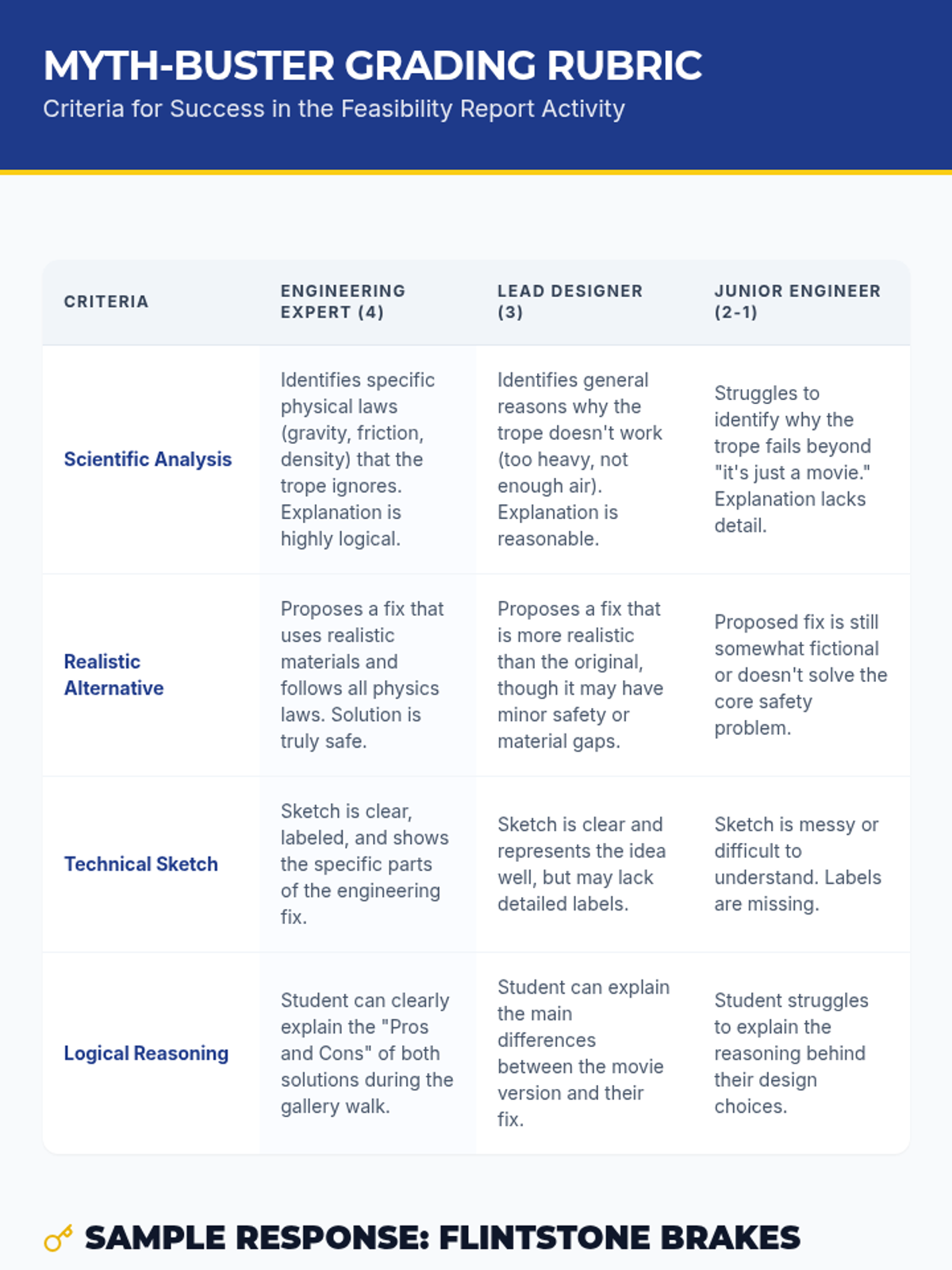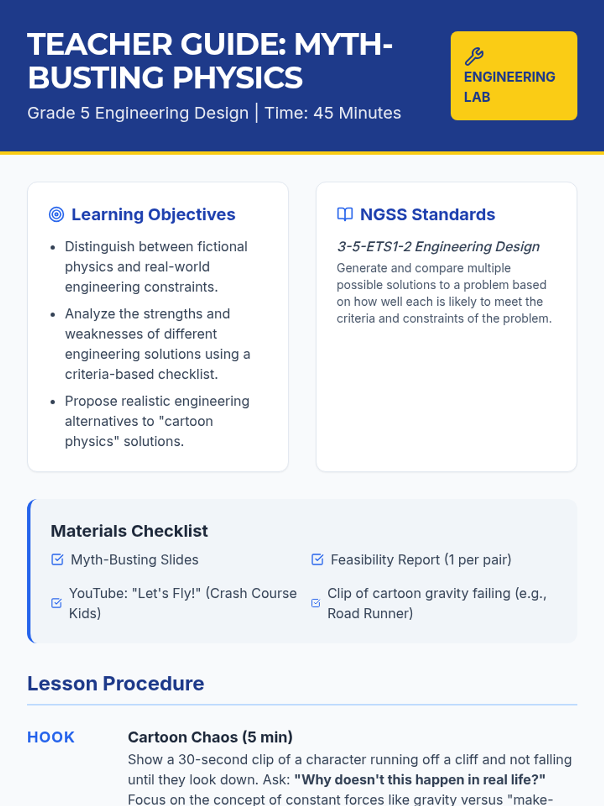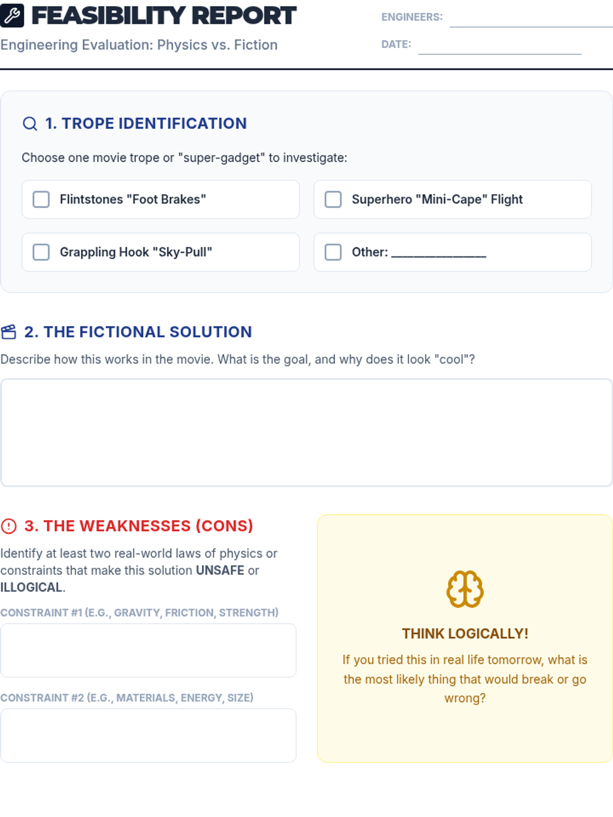 A 5th-grade science and engineering lesson where students analyze movie tropes to distinguish between 'cartoon physics' and real-world engineering constraints, culminating in a feasibility report for fictional gadgets.