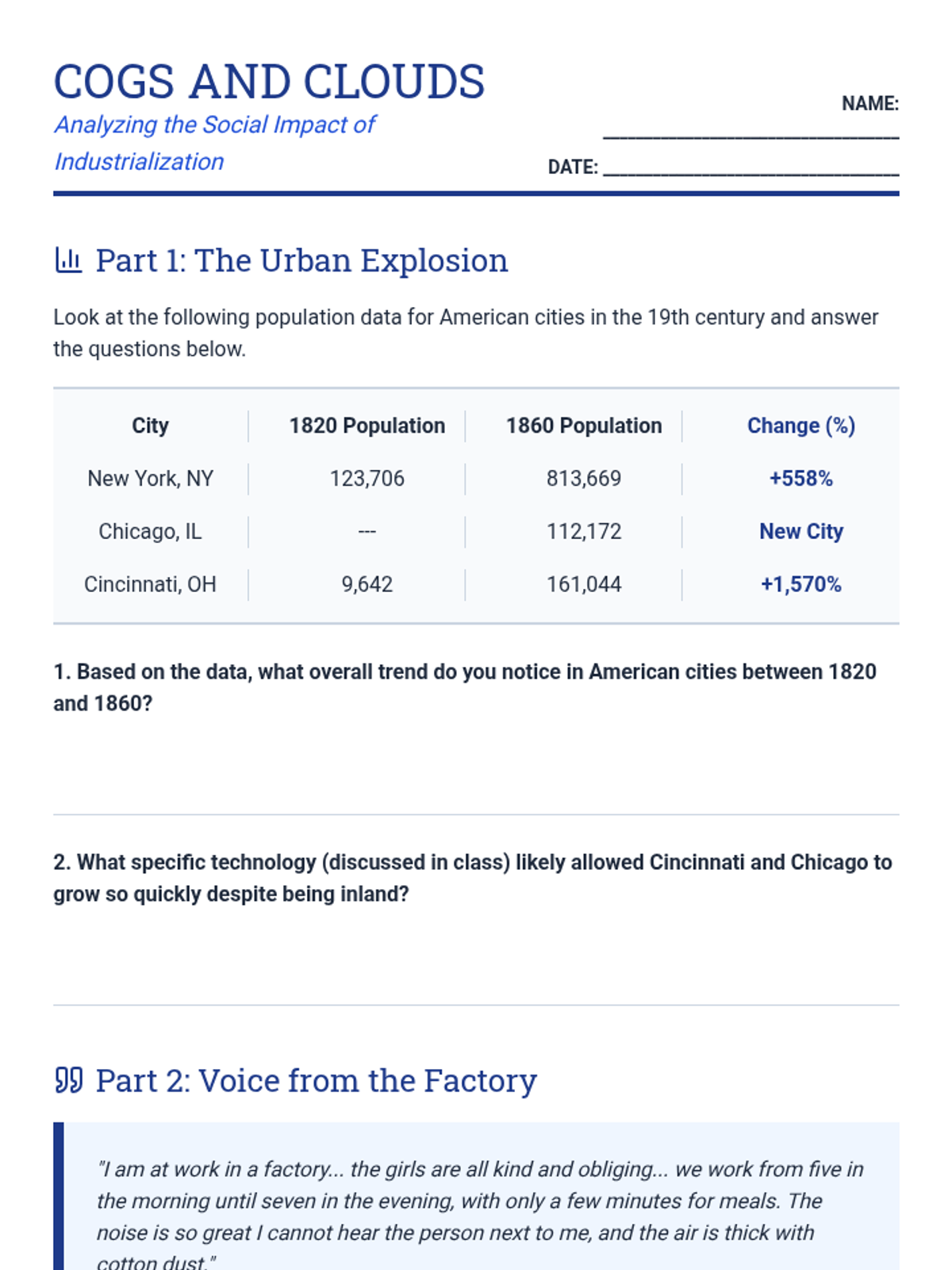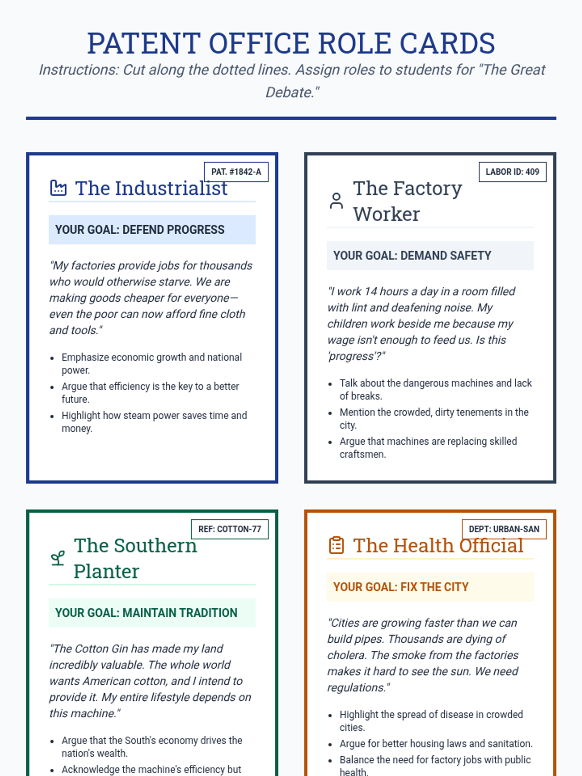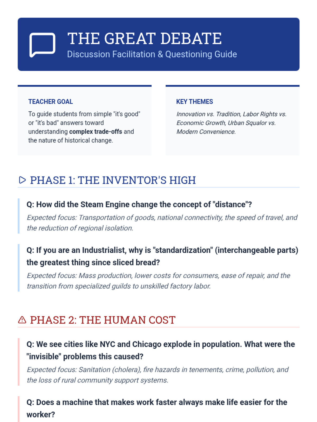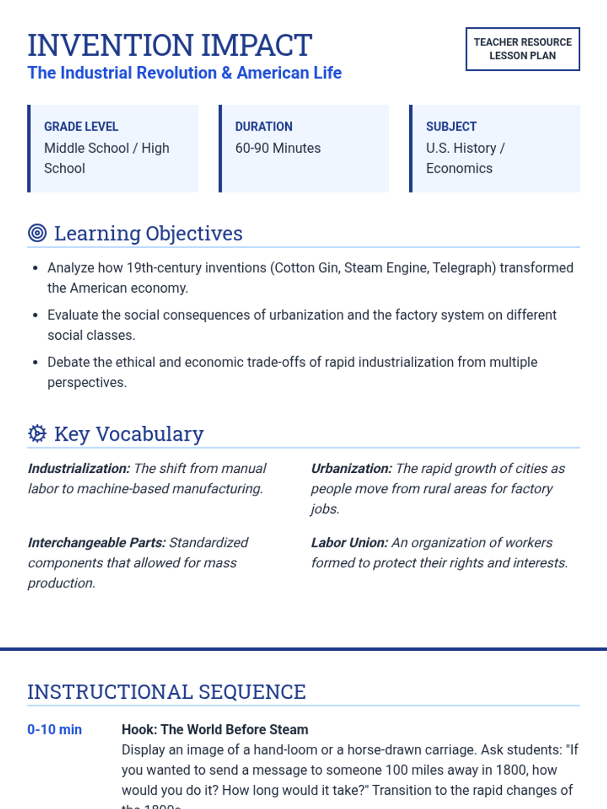 A comprehensive lesson exploring the socio-economic transformations of the 19th-century Industrial Revolution through the lens of innovation, labor, and urbanization. Students engage in role-play to debate the impacts of new technologies.