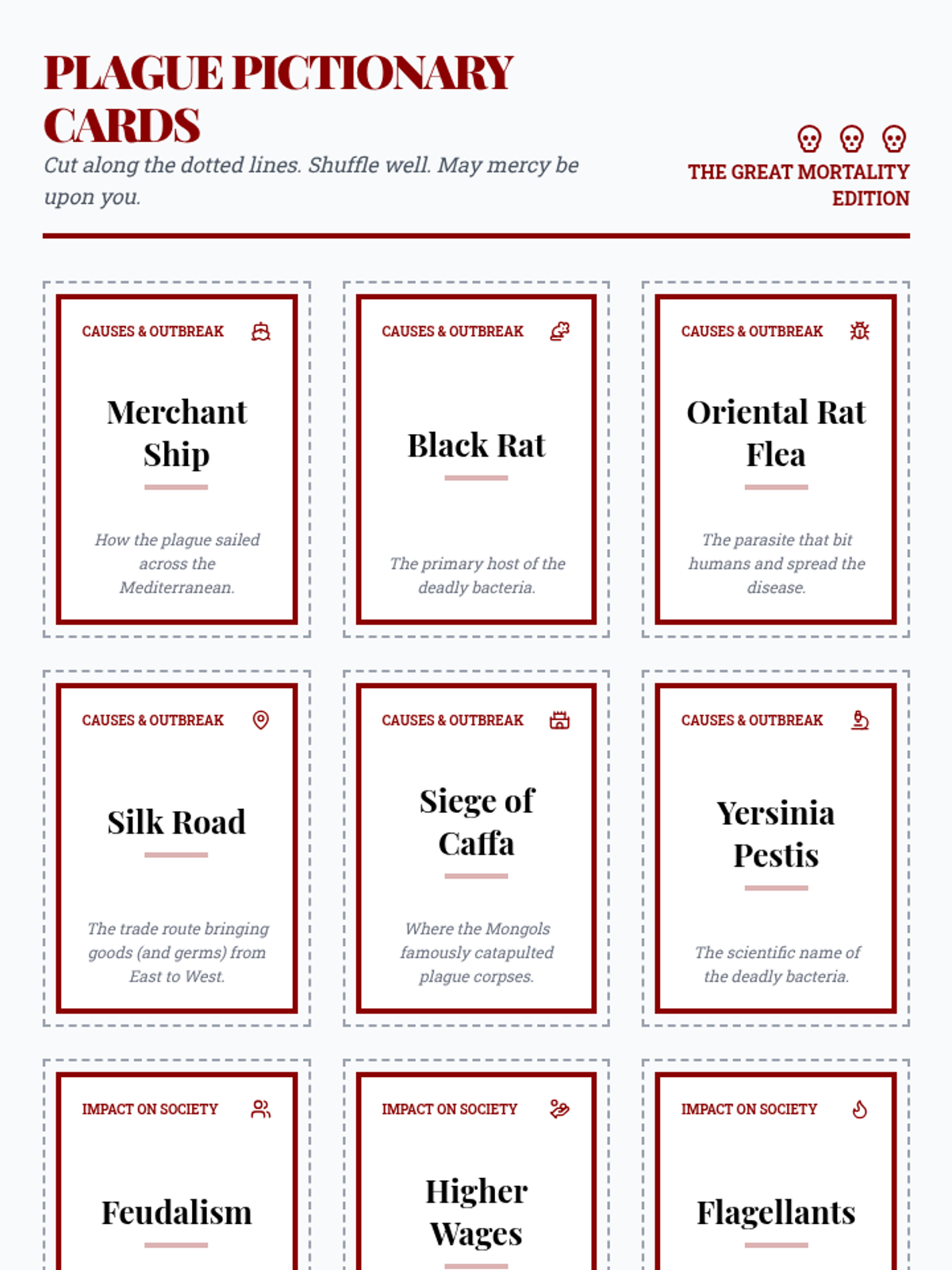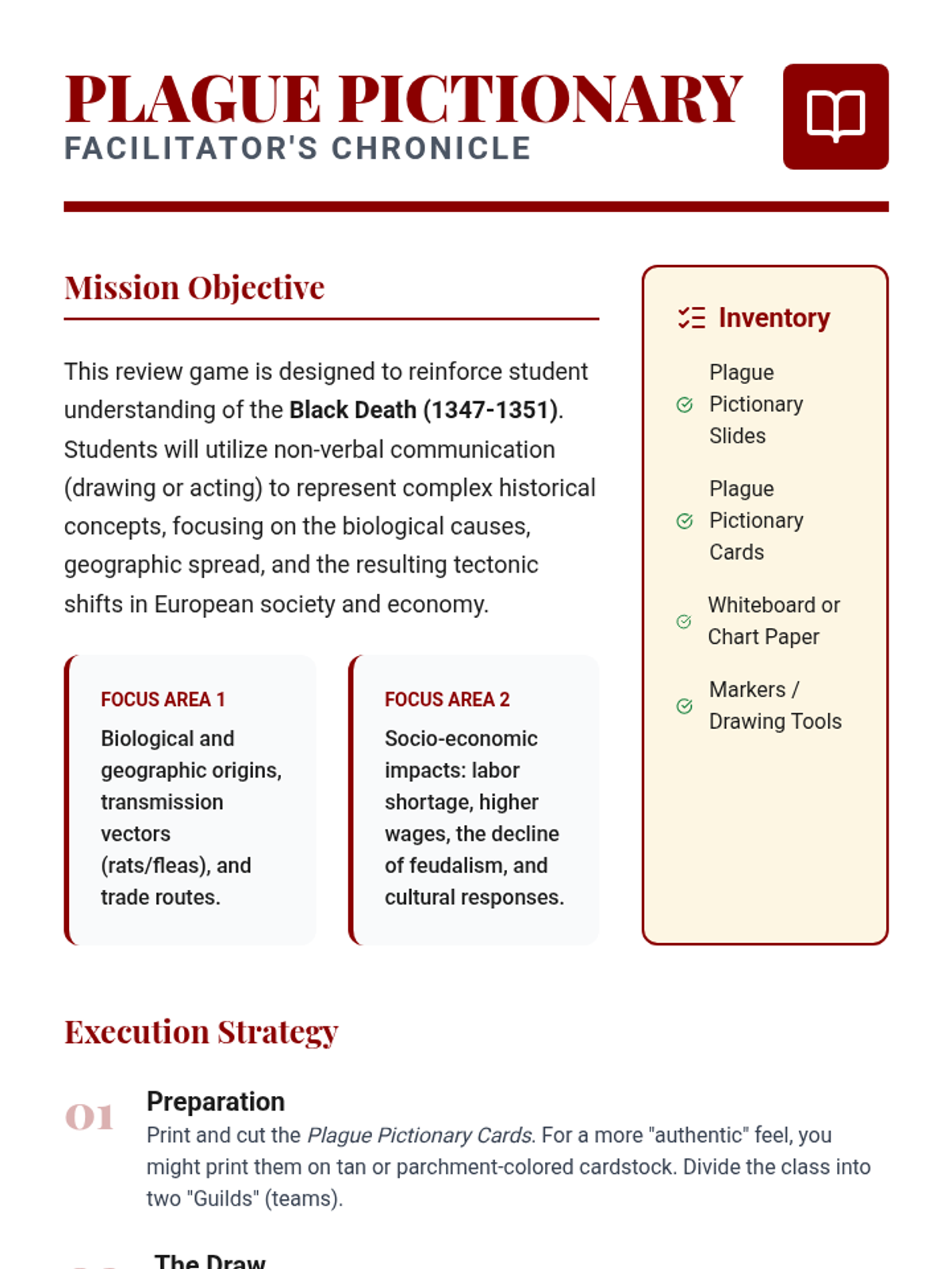 A fast-paced review game lesson focusing on the causes, spread, and societal impacts of the Black Death through drawing and acting.