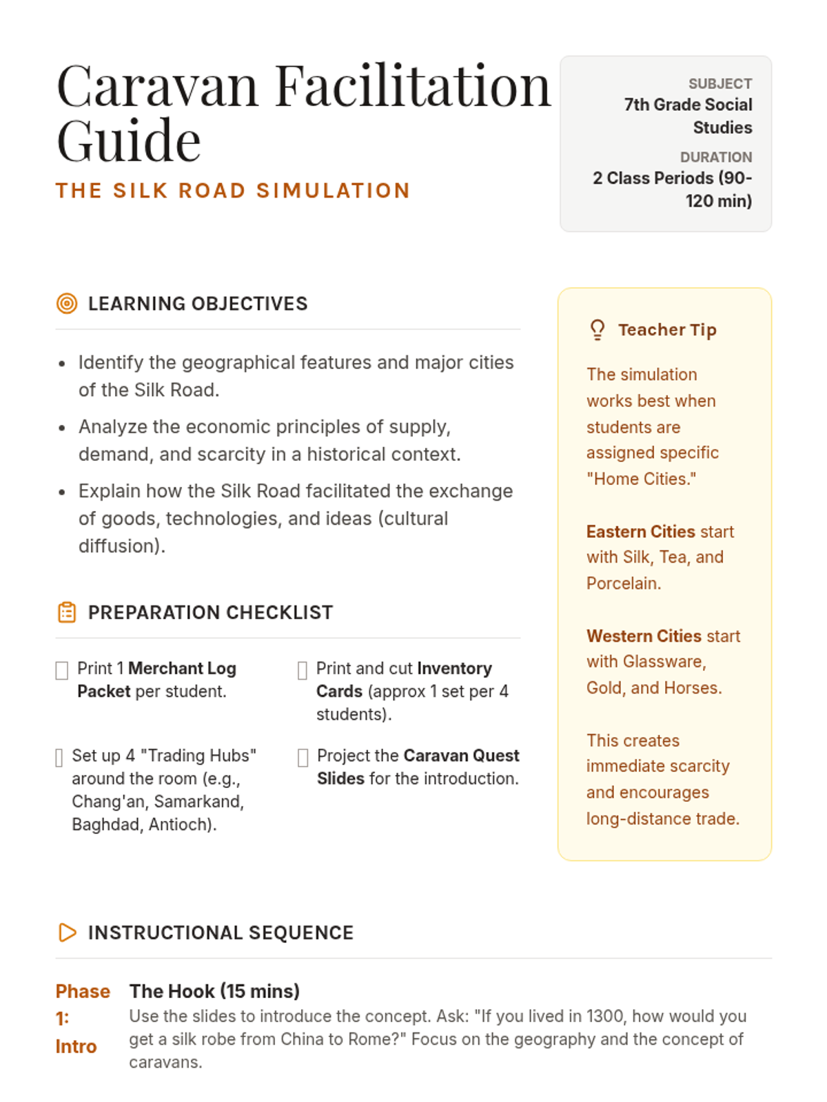 A comprehensive activity-based lesson on the Silk Road, focusing on trade, geography, and cultural exchange through a merchant simulation.