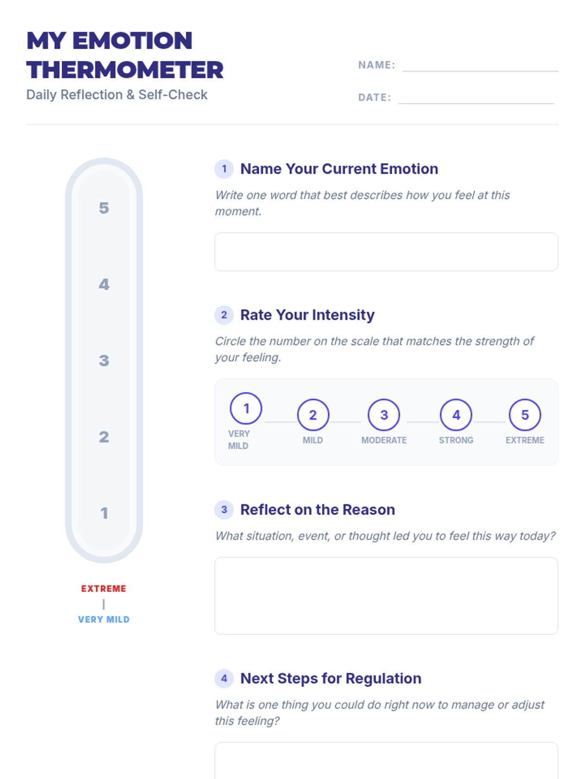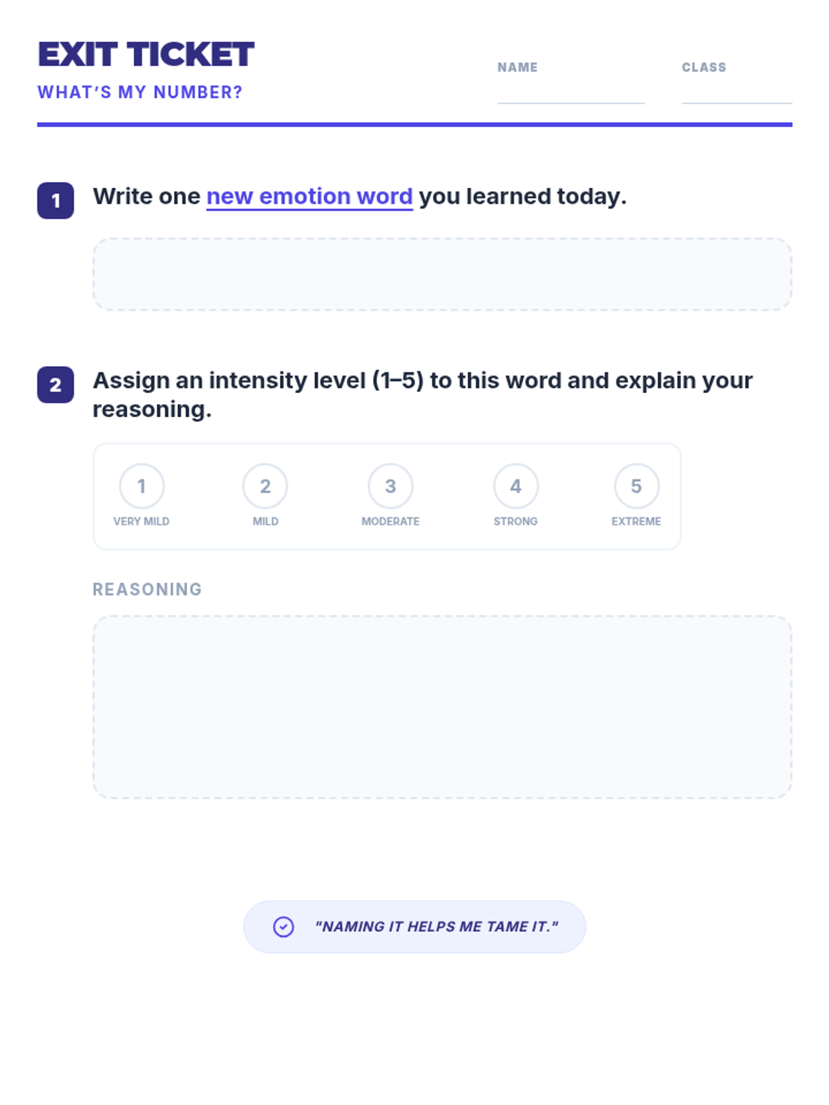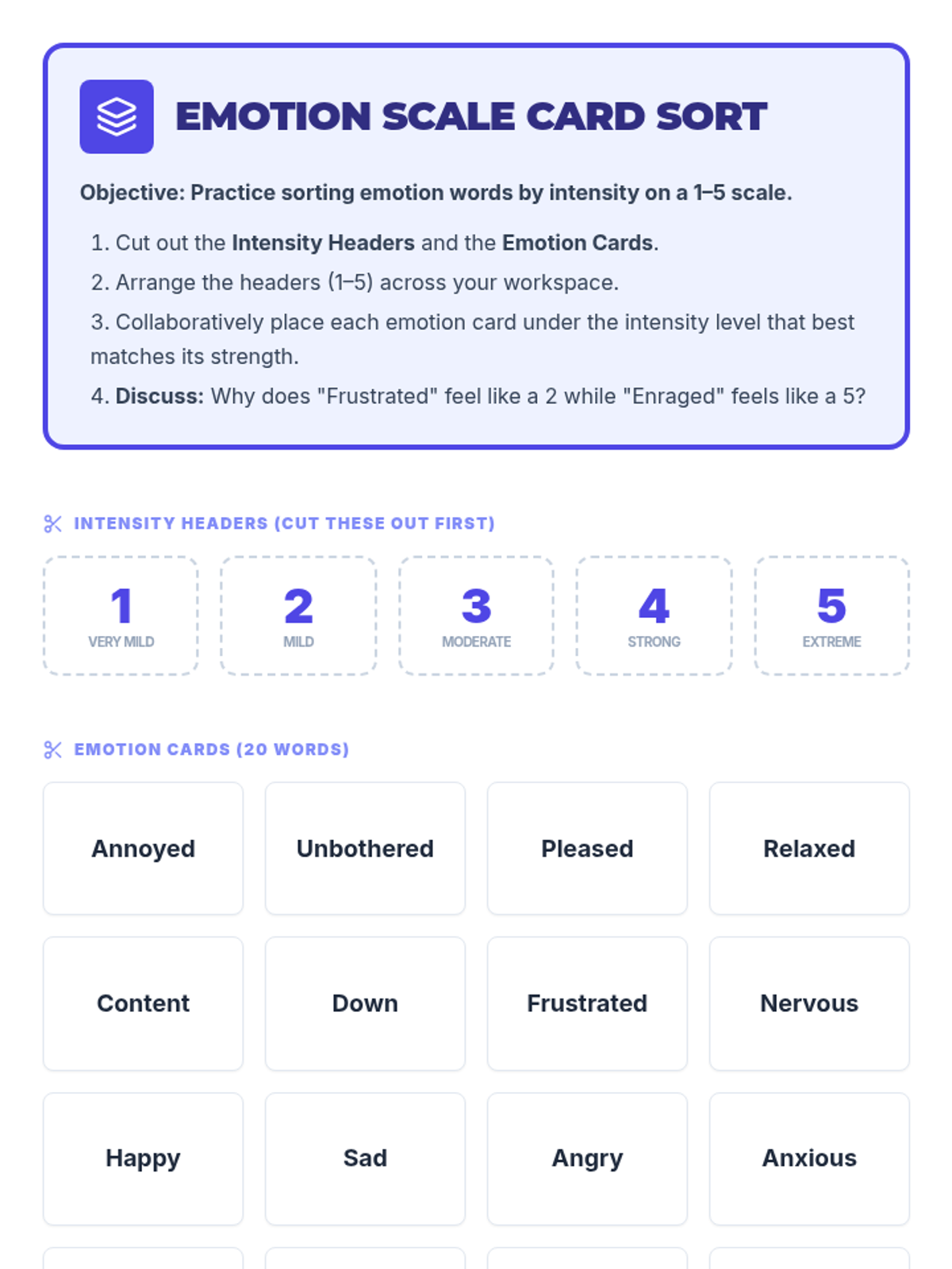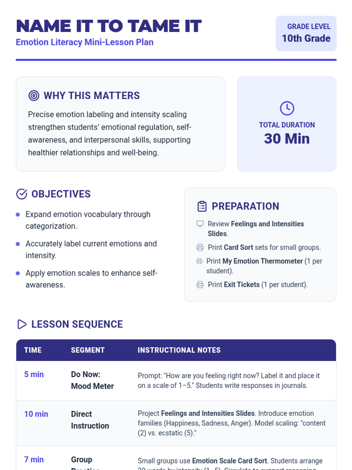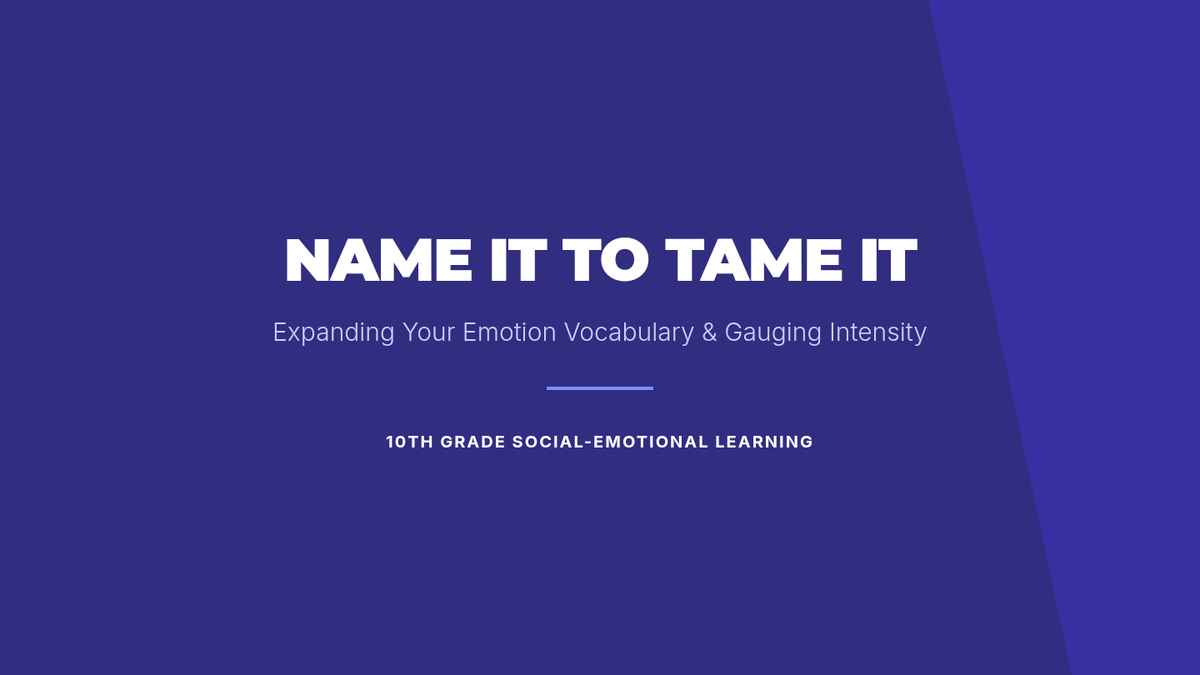 A 30-minute lesson for 10th graders focused on expanding emotional vocabulary and understanding feeling intensity using a 1–5 scale. Students engage in a card sort activity and personal reflection to improve emotional self-awareness and regulation.