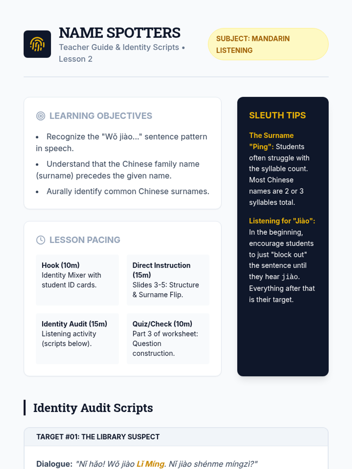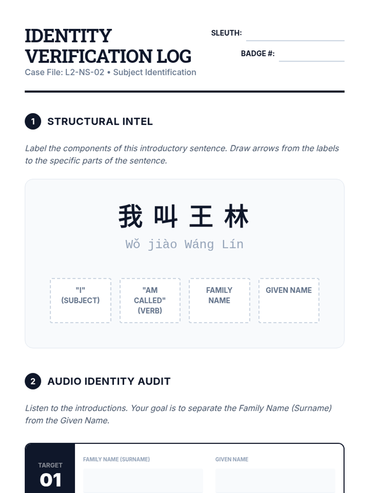 Focusing on name structures, students practice identifying Chinese surnames and given names within introductory sentences.