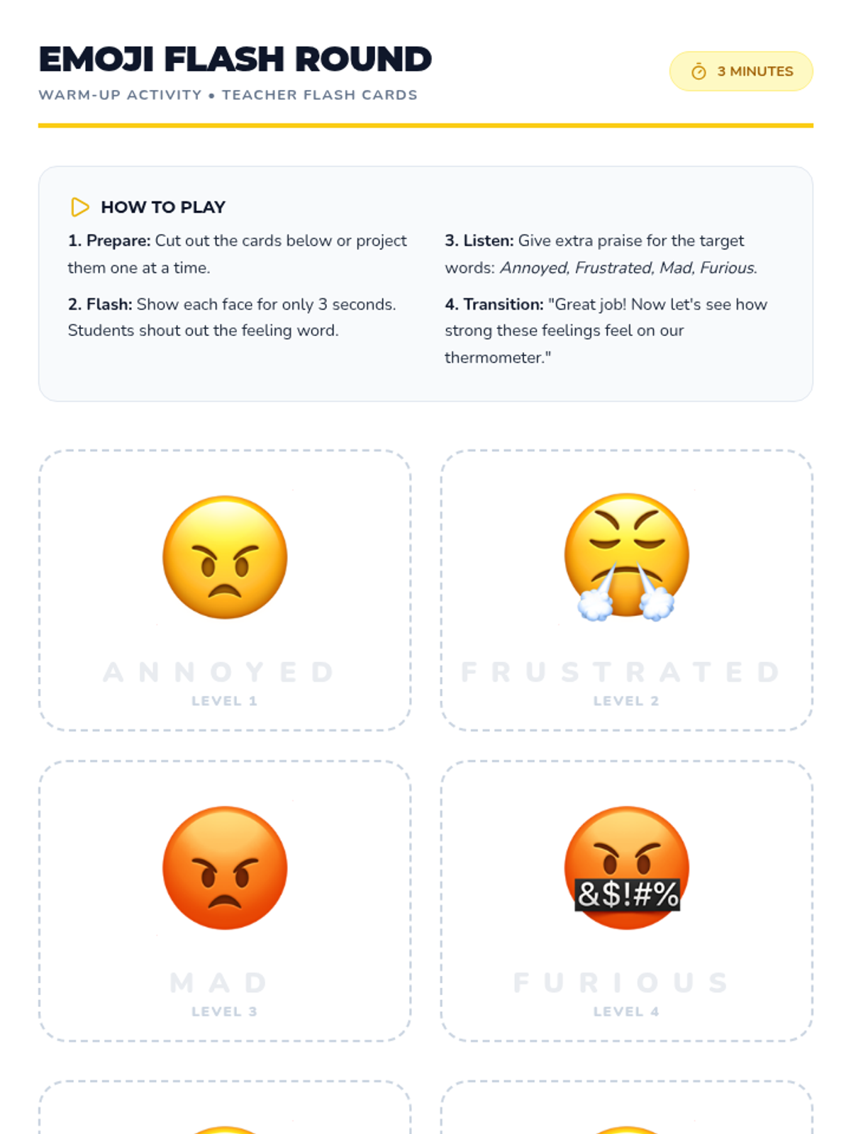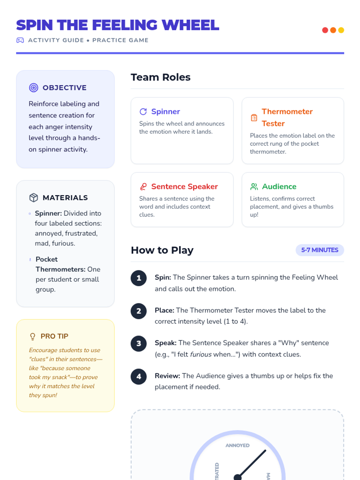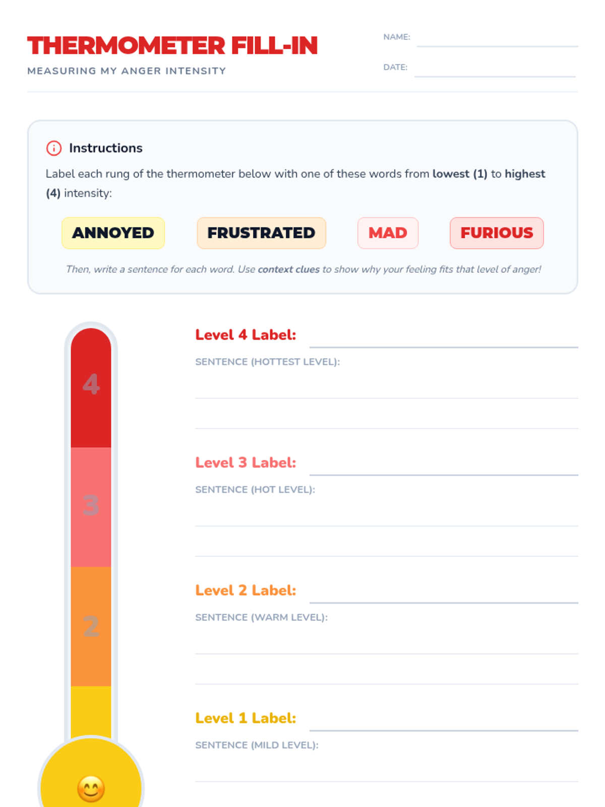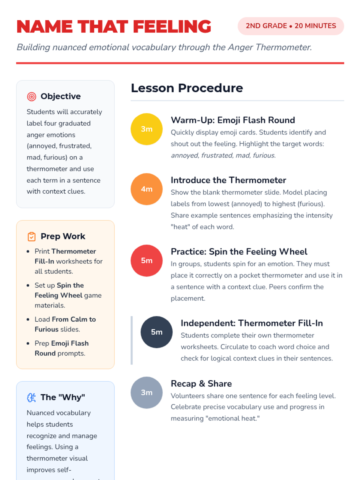 A 20-minute 2nd grade lesson helping students identify and label graduated anger emotions (annoyed, frustrated, mad, furious) using a thermometer visual and context clues.
