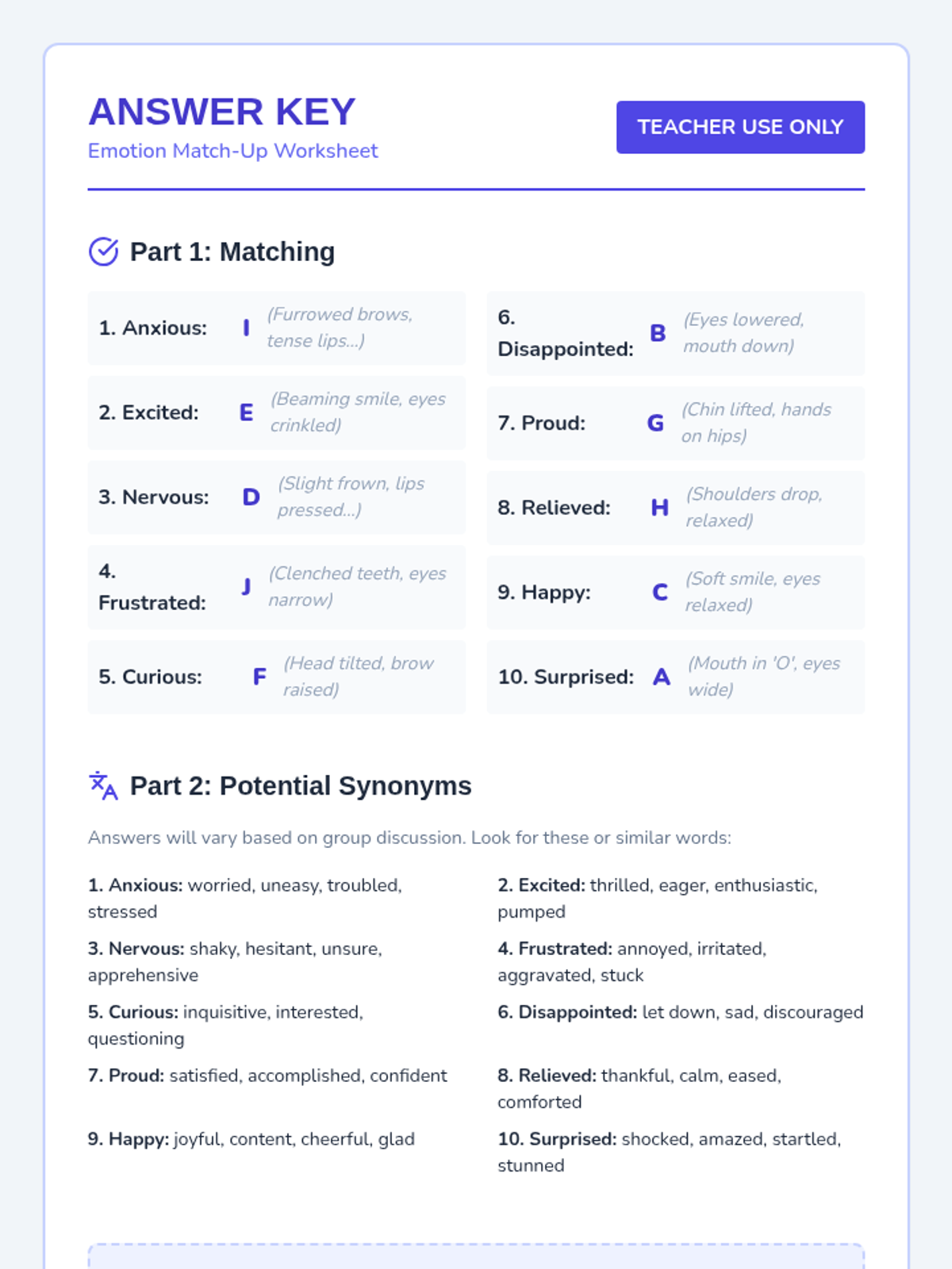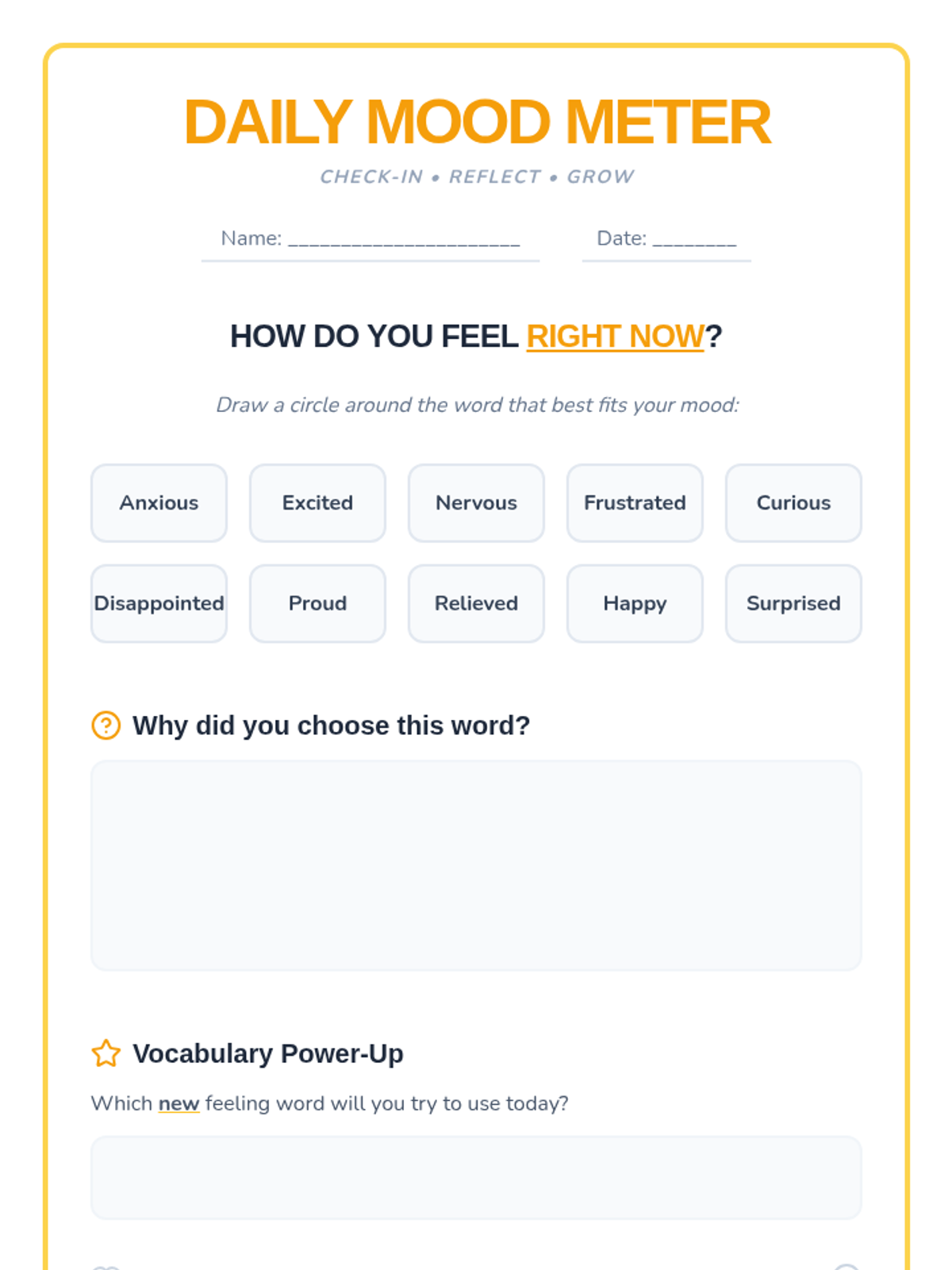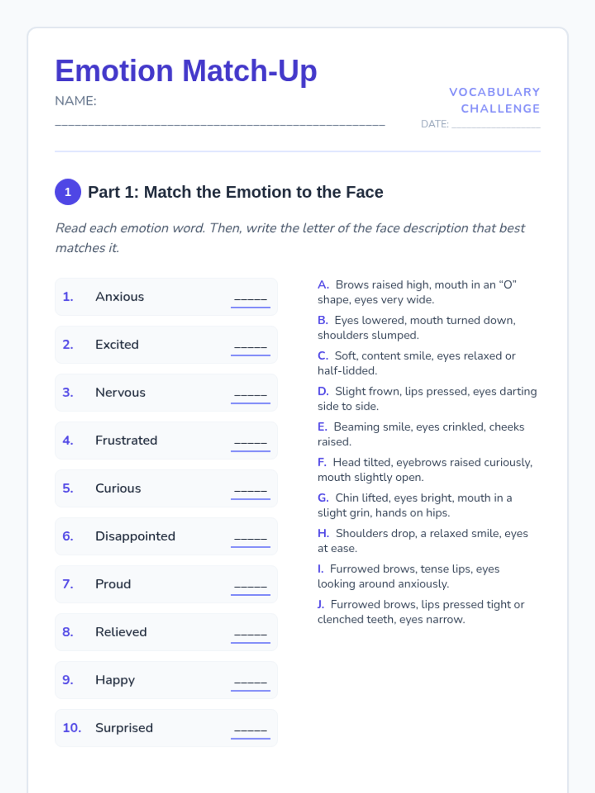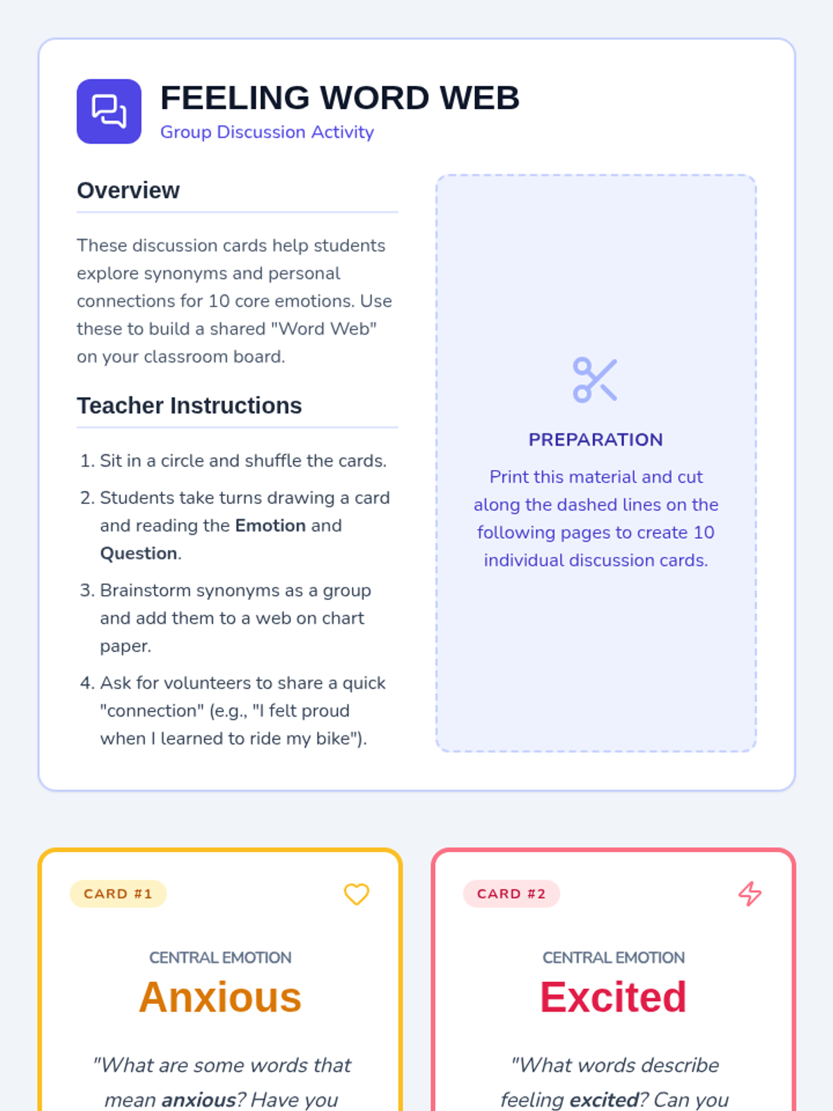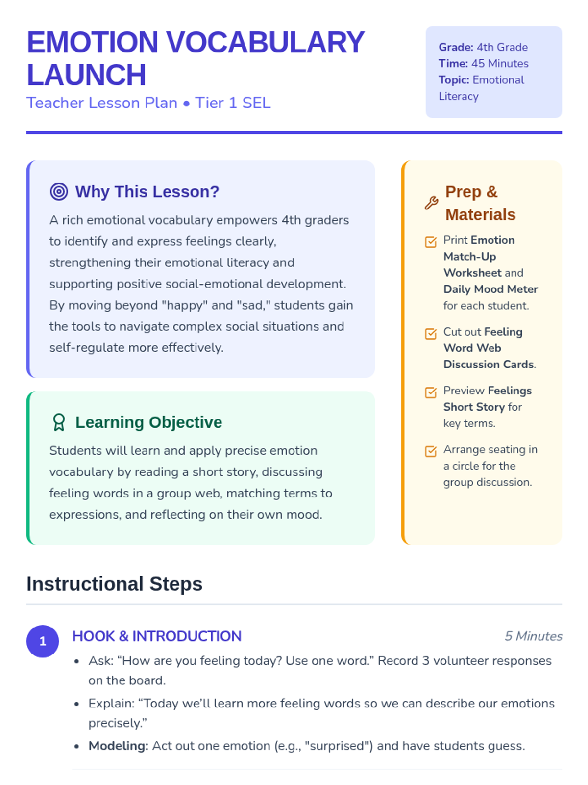 A 45-minute Tier 1 lesson for 4th grade that introduces precise emotional vocabulary through storytelling, collaborative discussion, and self-reflection. Students move beyond basic feeling words to more nuanced descriptions like 'anxious', 'proud', and 'relieved'.
