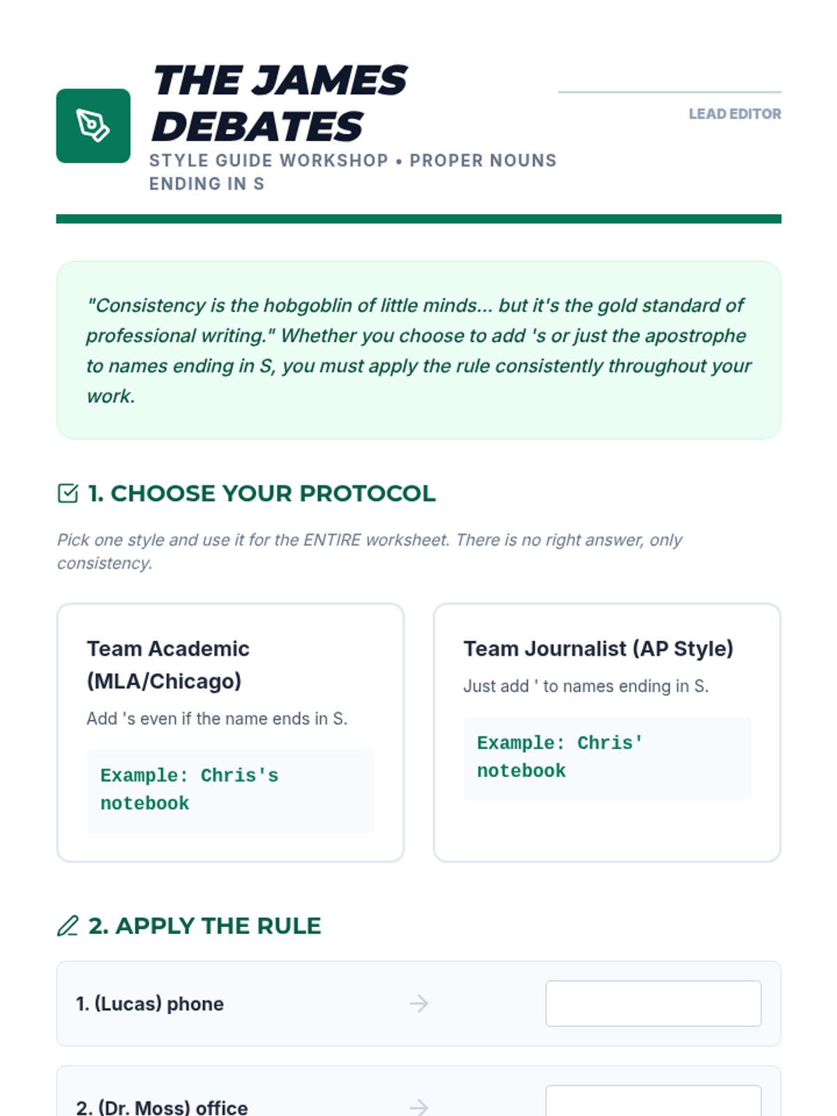 Students explore the nuances of punctuating proper nouns ending in 's' and learn to apply style guide consistency.