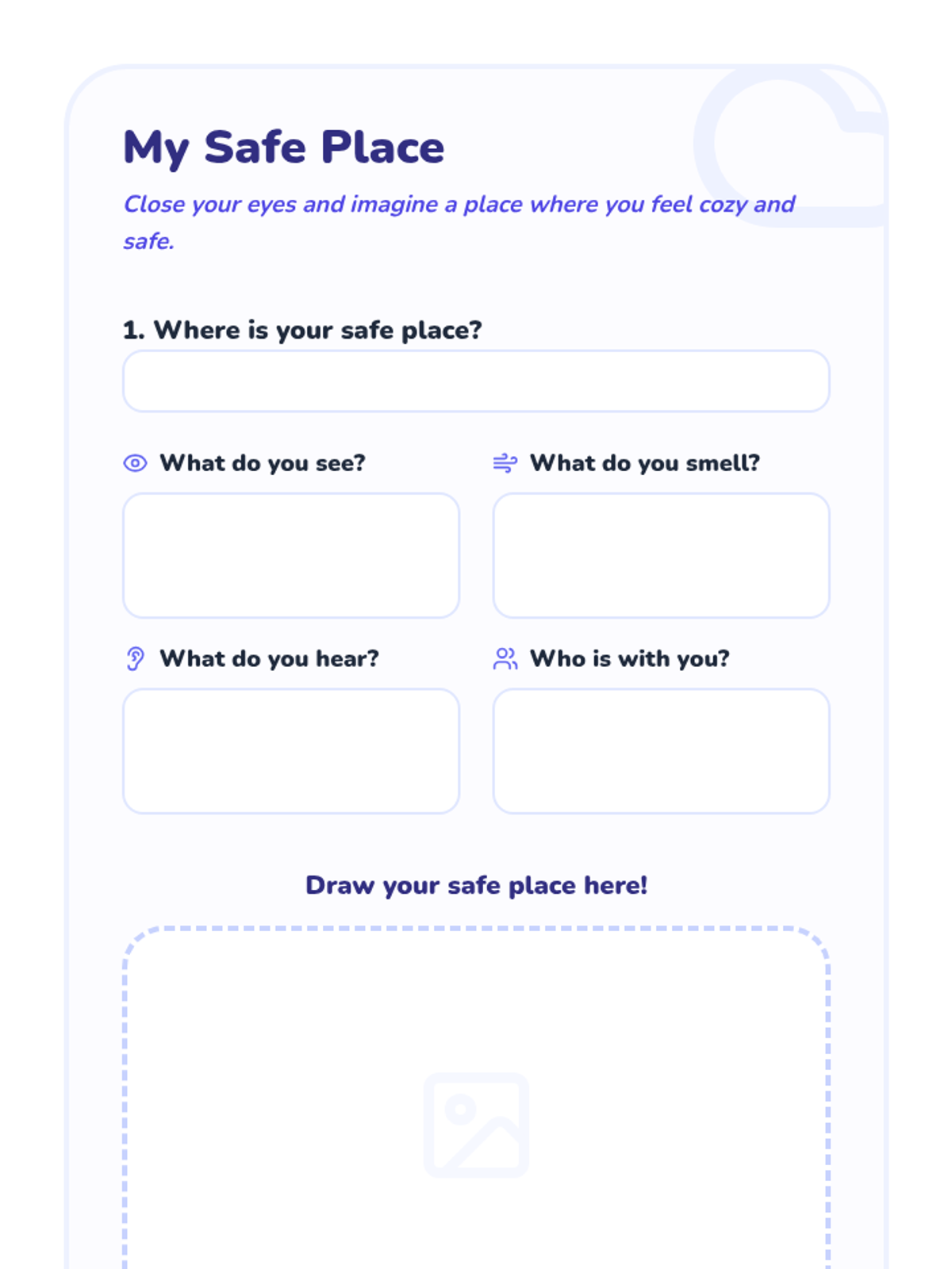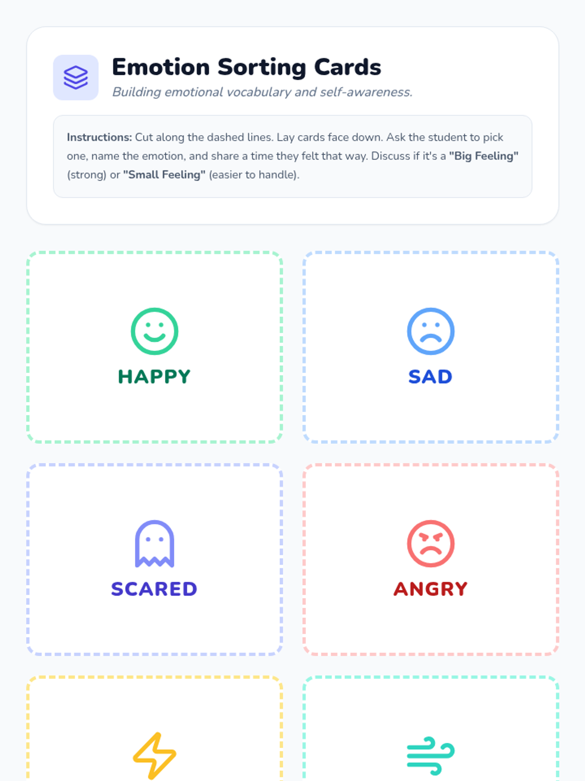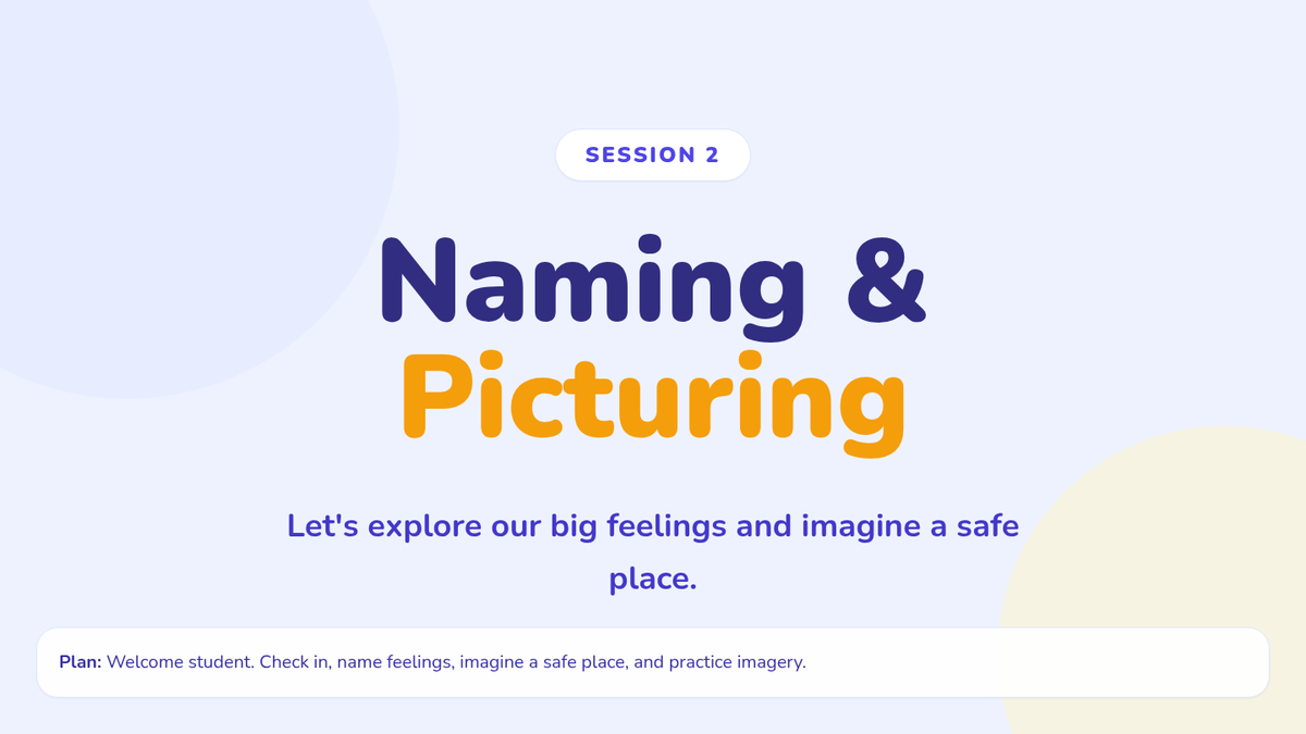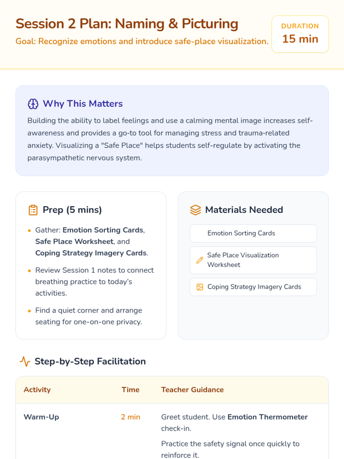 Building the ability to label feelings and use a calming mental image increases self-awareness and provides a go‐to tool for managing stress and trauma‐related anxiety.