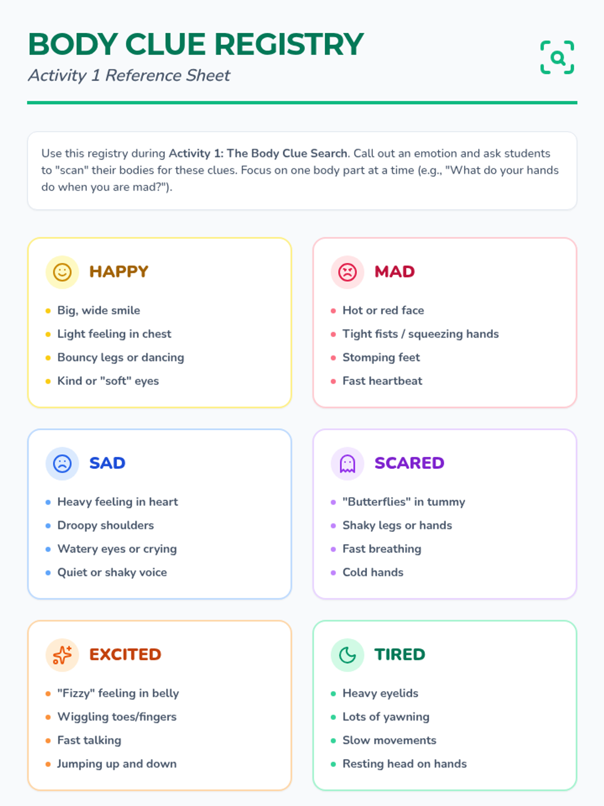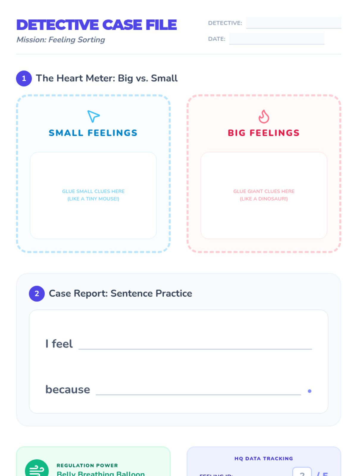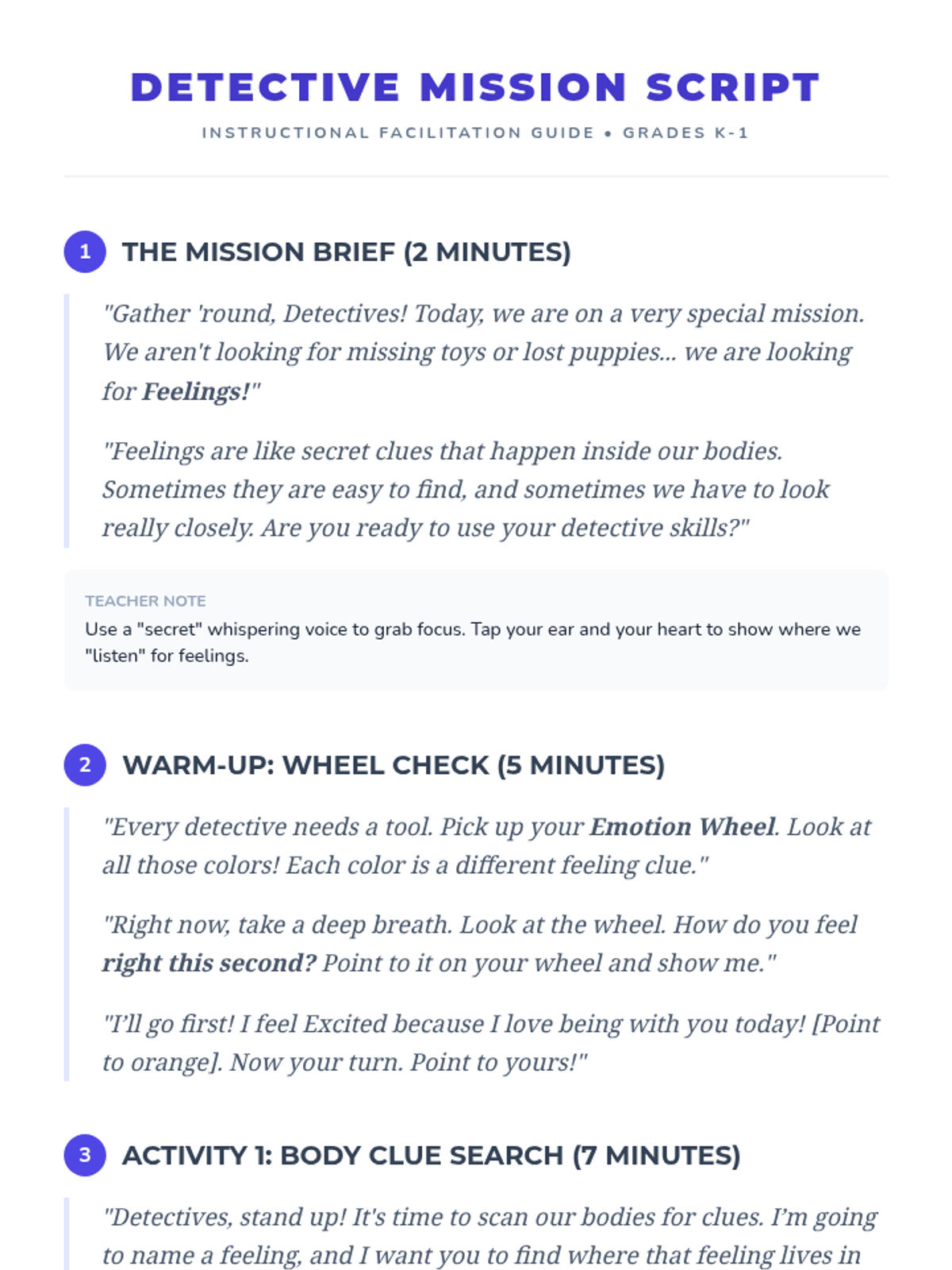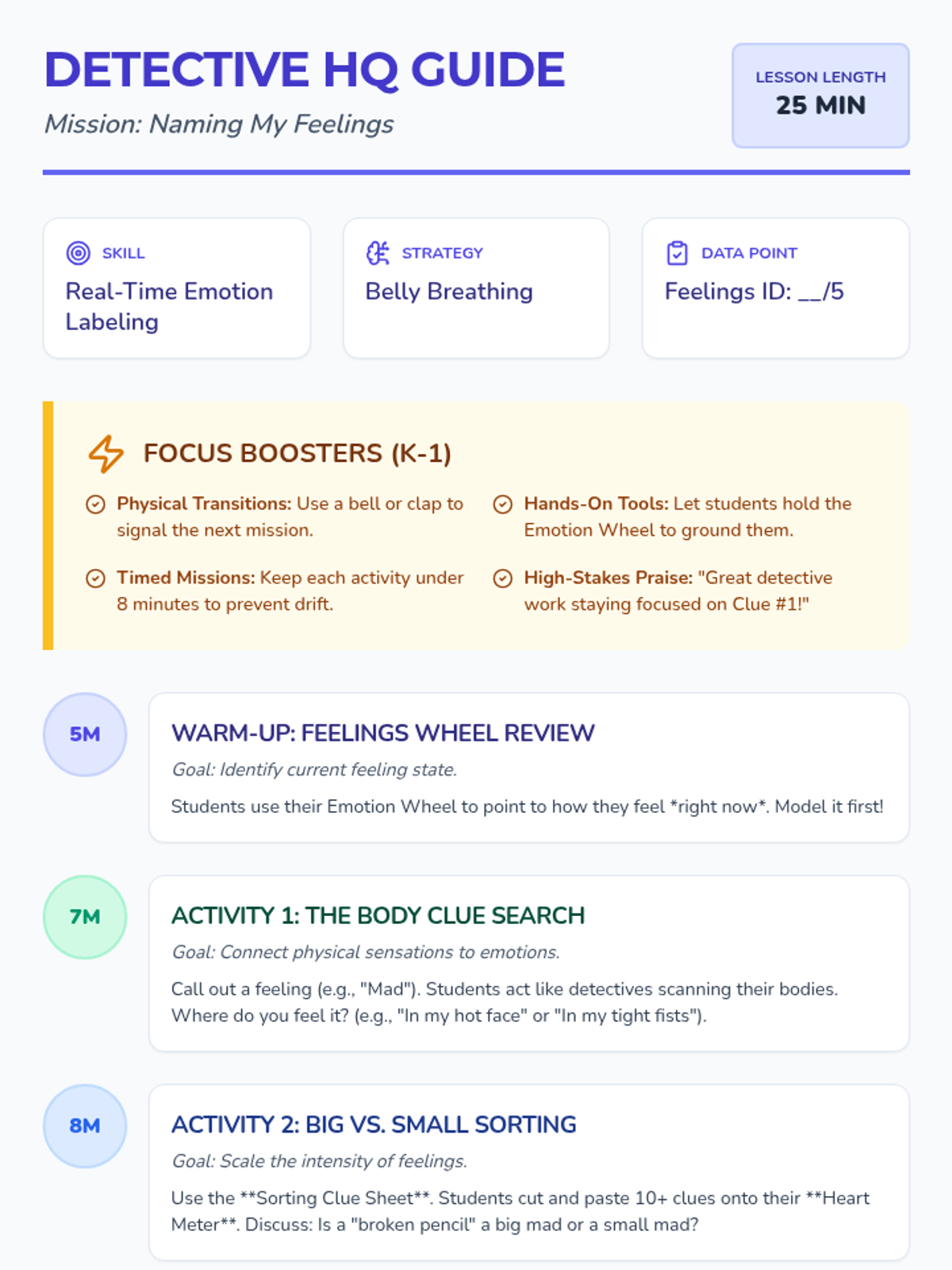A 25-minute social-emotional learning lesson for K-1 students focused on identifying and labeling emotions through play-based activities and sorting exercises. Includes strategies for students with focus difficulties.