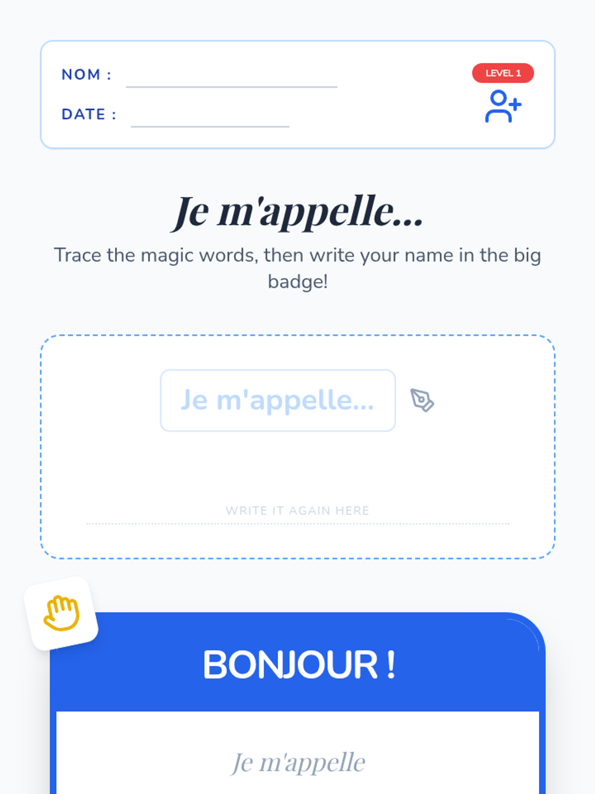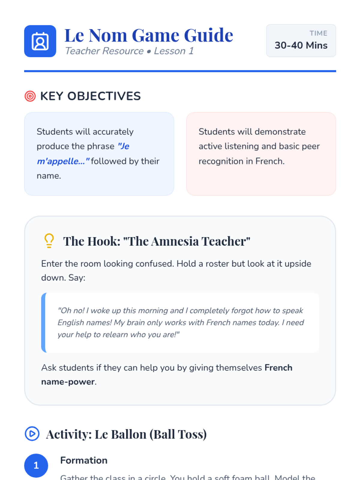 Students learn to introduce themselves using the phrase 'Je m'appelle...' and practice through a playful ball-toss game.