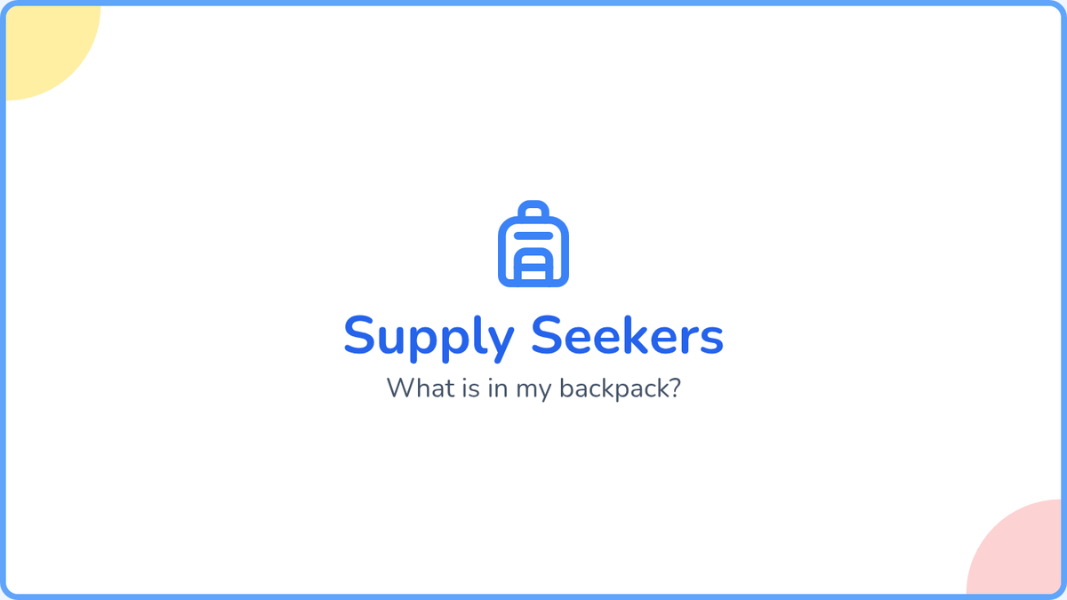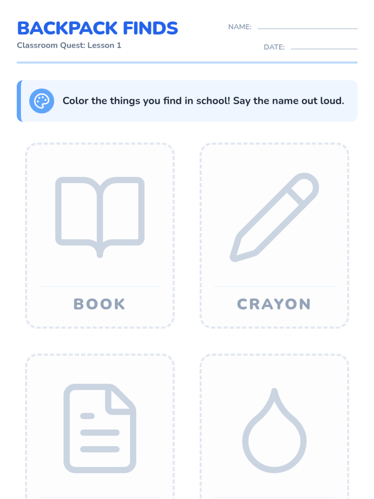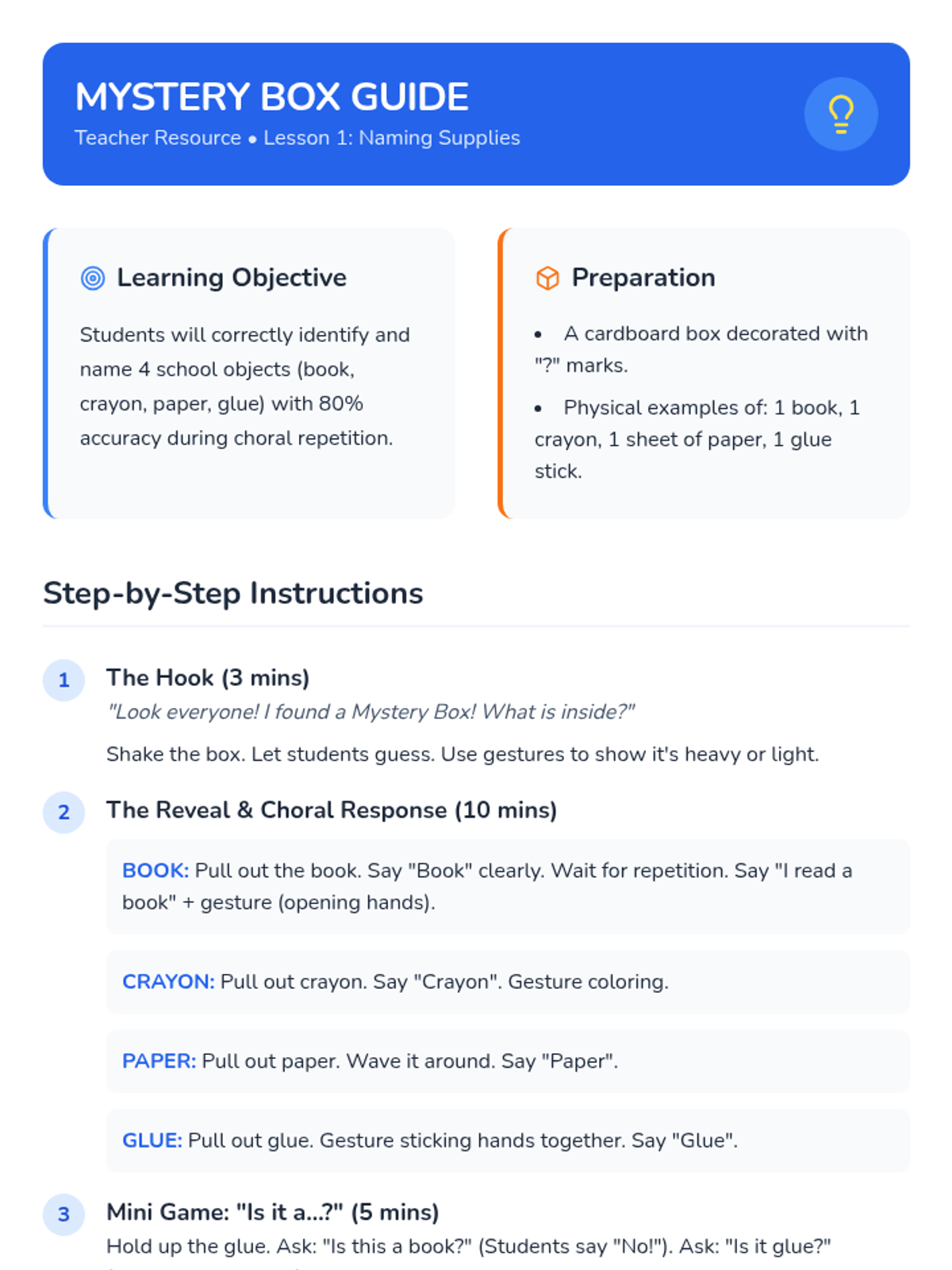 Students identify and name core school supplies like books, crayons, and glue using a 'mystery box' approach.