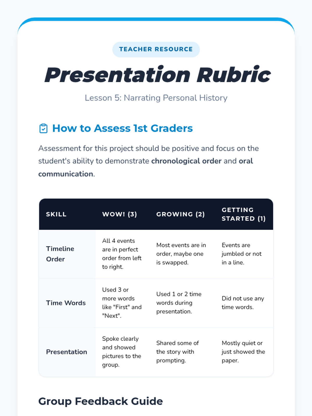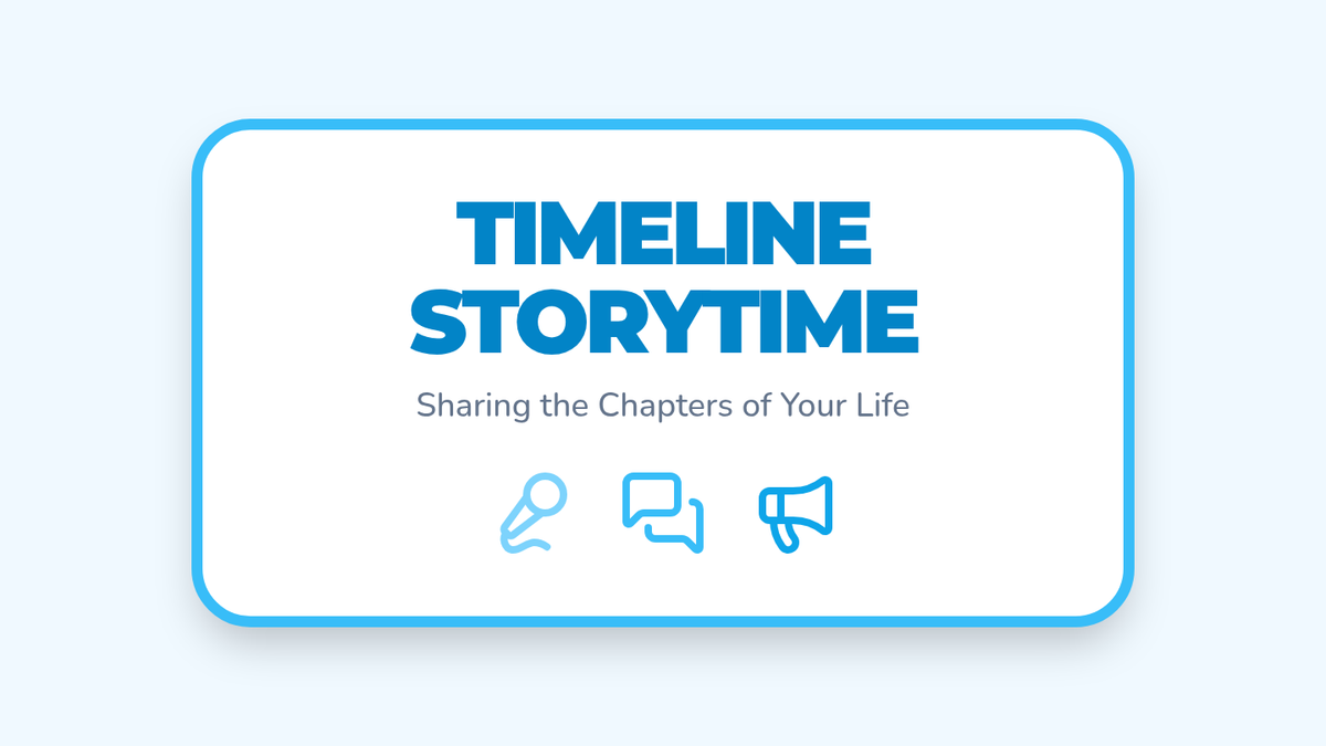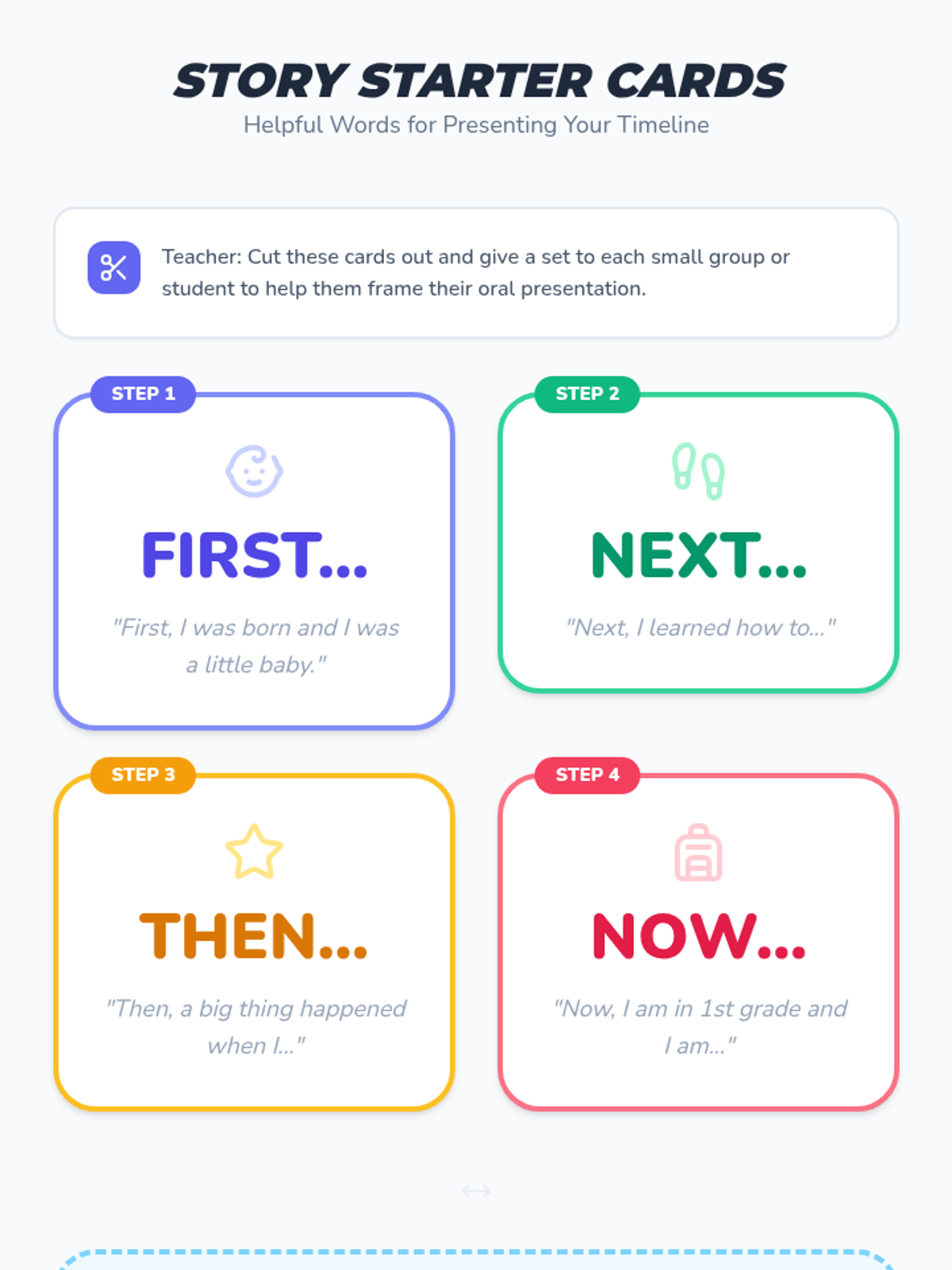Students share their completed timelines with peers, using time-order words like 'first', 'then', and 'now' to describe their life sequence.