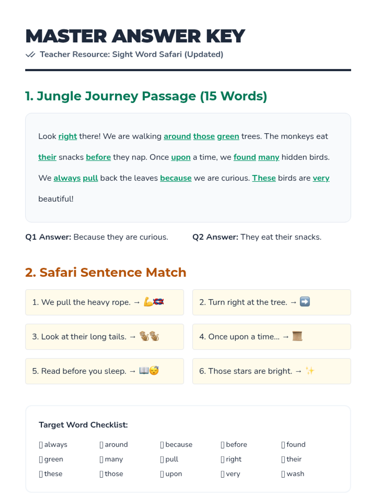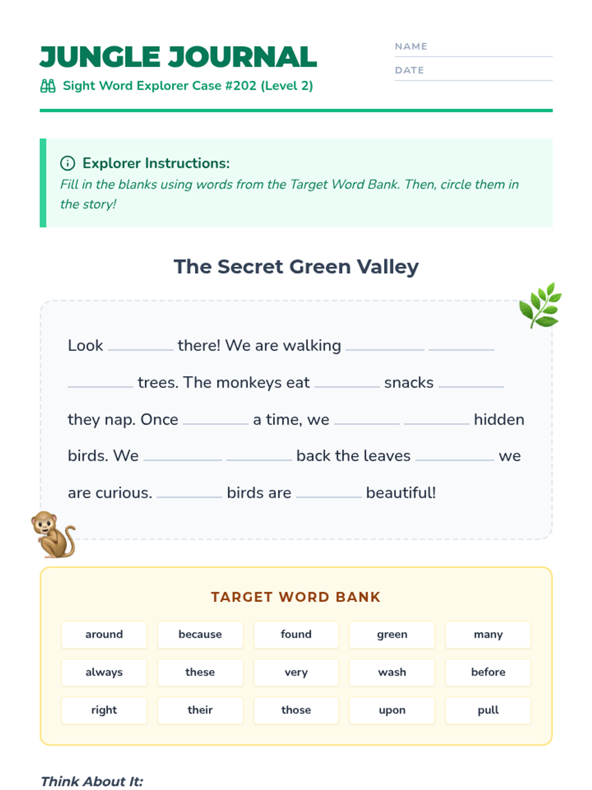 A 2nd grade sight word exploration set in a jungle safari theme. Students practice reading a passage and matching sentences to visual cues to reinforce high-frequency word recognition.