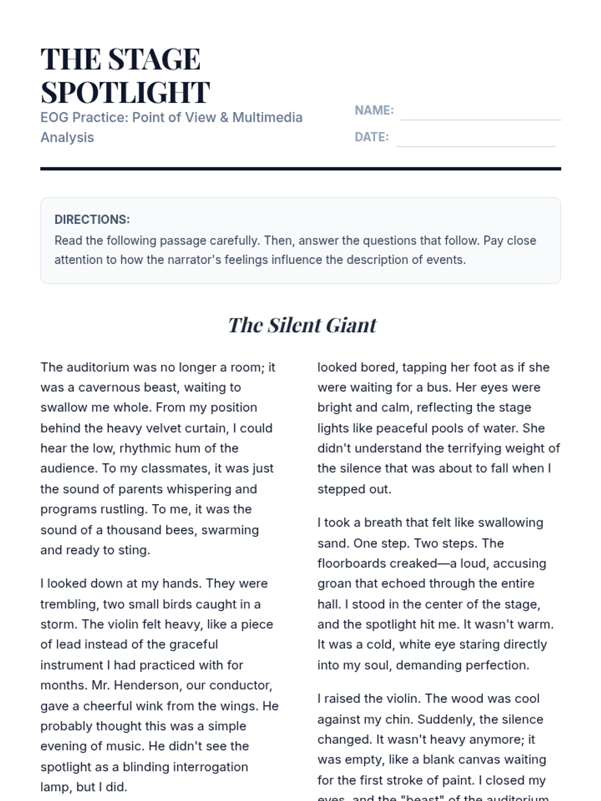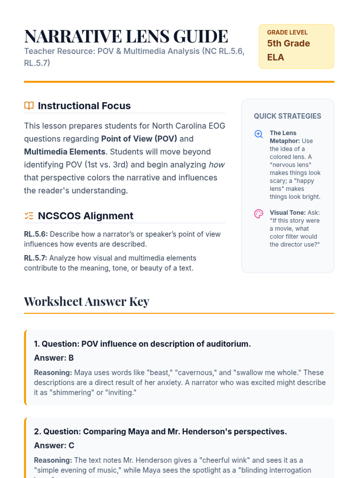 A comprehensive EOG prep lesson focusing on RL.5.6 (Point of View) and RL.5.7 (Multimedia Elements). Students will learn to identify how a narrator's perspective shapes a story and how visual elements enhance the reading experience.
