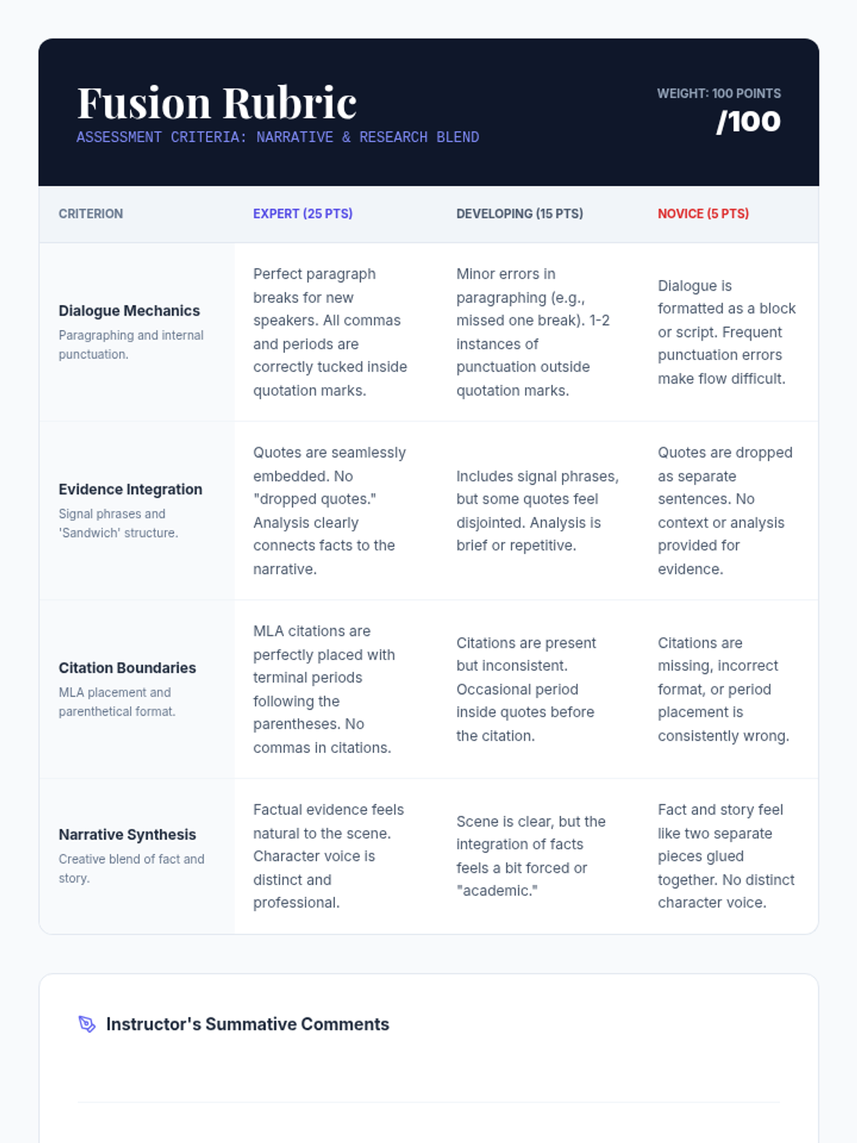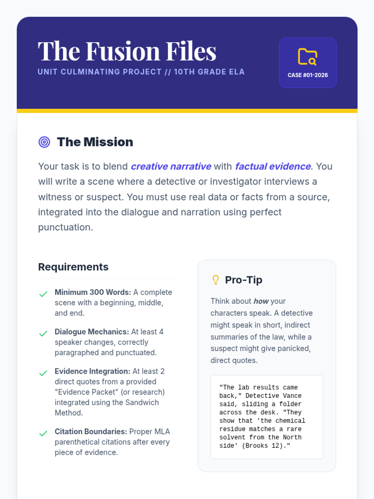 A culminating project where students blend narrative dialogue with cited research evidence. They apply all mechanical skills in a creative 'detective report' format.