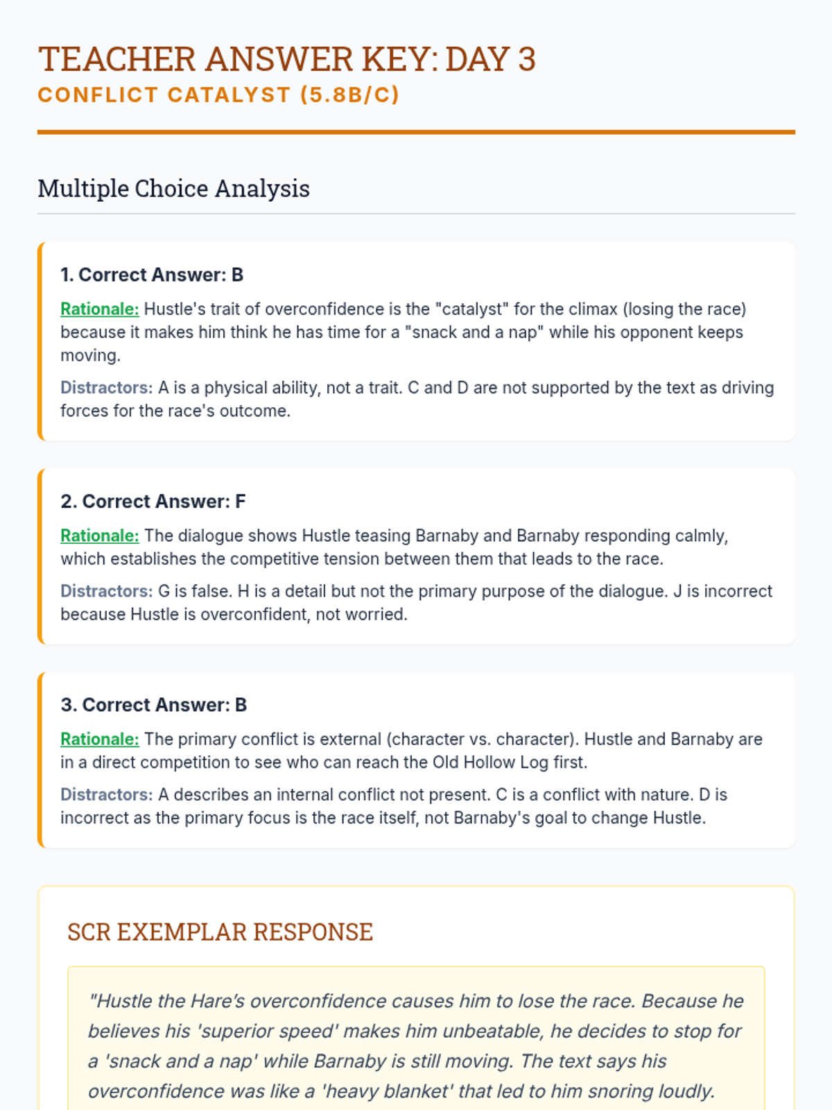 Day 3 integrates both character and plot (5.8B/C) using traditional literature (a fable). Students examine how a character's traits and choices create the conflict and lead to the climax.