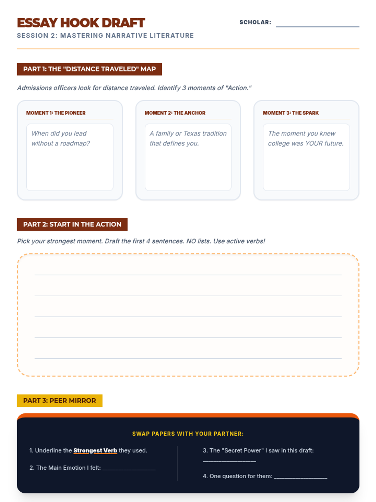 Focuses on the personal statement literature, specifically Texas Essay A, helping students draft narrative hooks that showcase first-gen resilience.