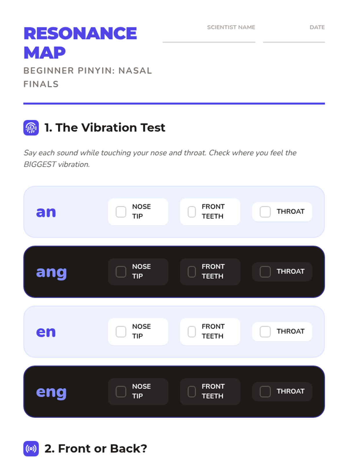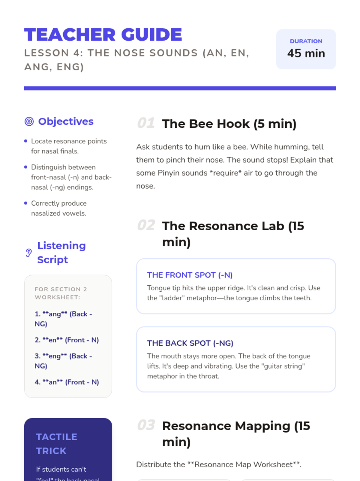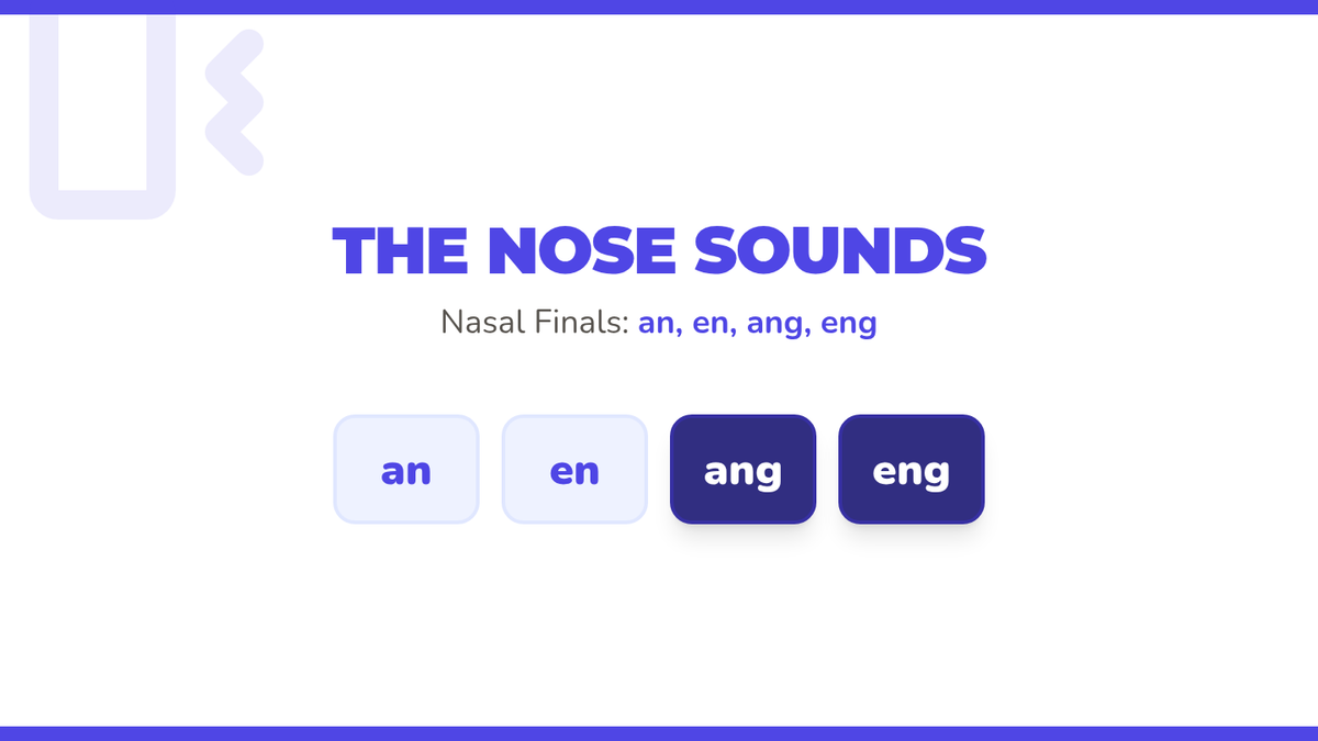 Learners investigate nasal resonance for 'an, en, ang, eng' sounds, distinguishing between front and back nasal endings.