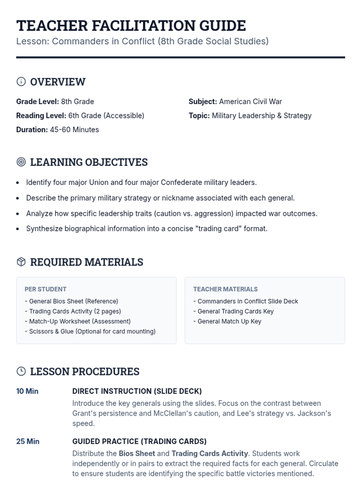 A lesson introducing eighth-grade students to the primary military leaders of the Union and Confederacy during the American Civil War, written at an accessible reading level. Students read biographies of key generals and create informational trading cards to demonstrate their understanding.
