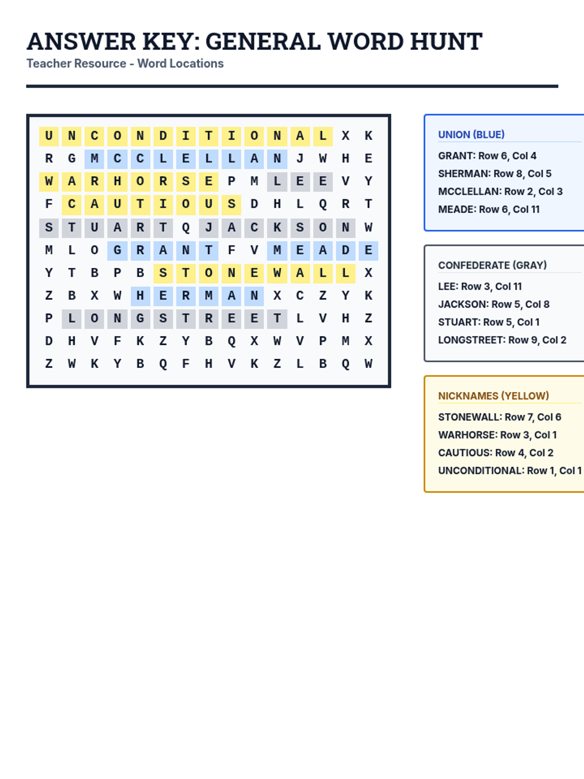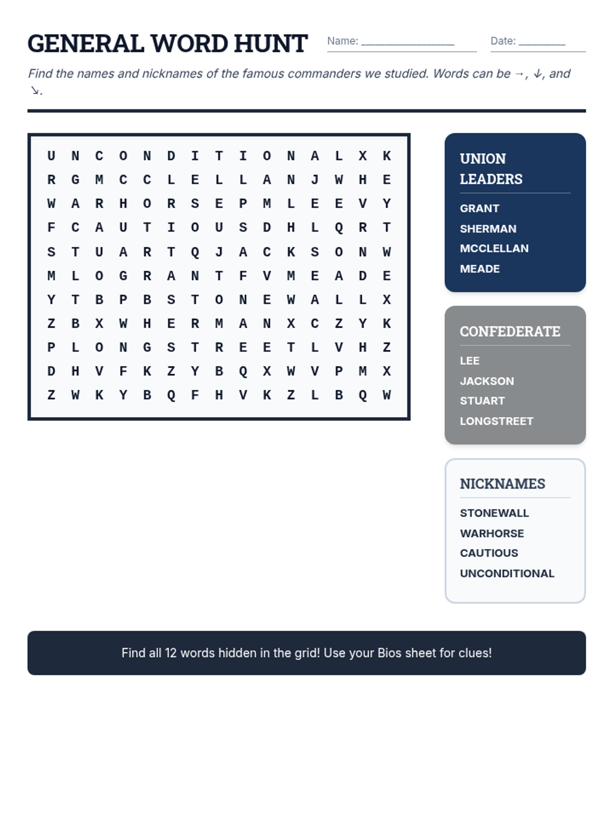 A lesson exploring the leadership, strategies, and impact of the top 5 Union and Confederate generals during the American Civil War through biographical analysis and graphic organizers.