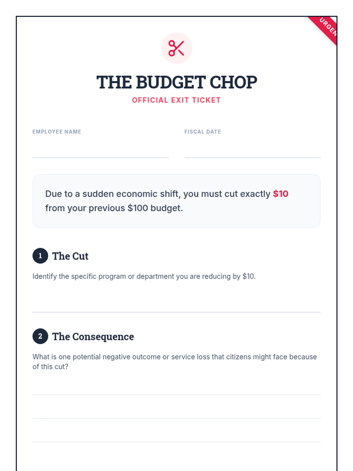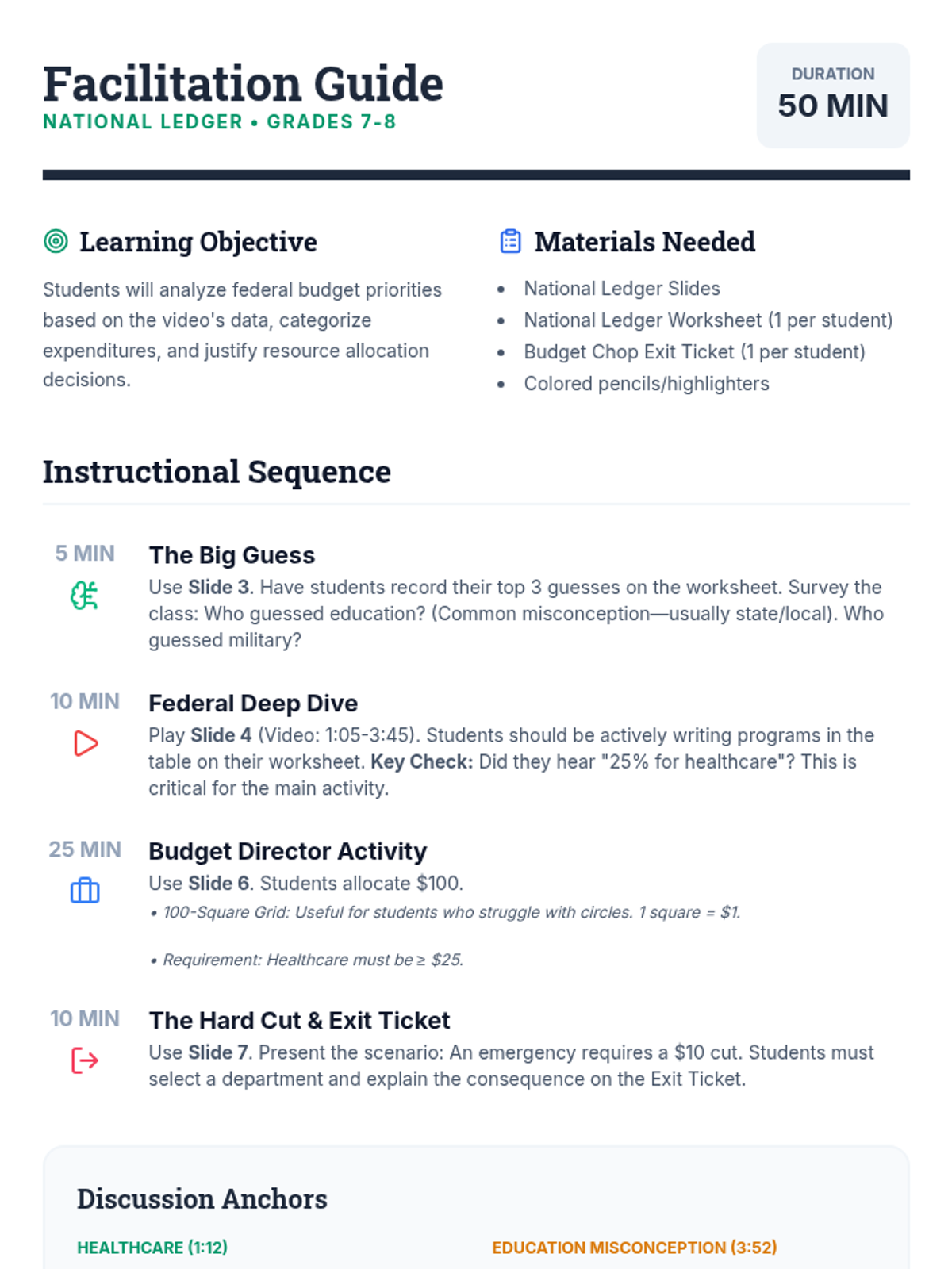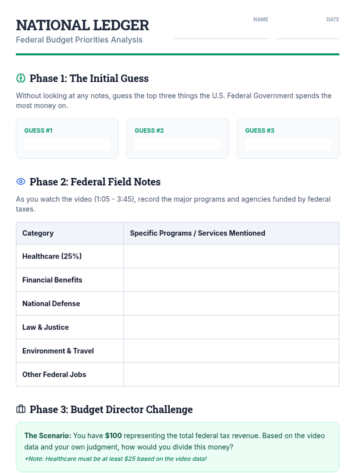 Students will investigate the federal budget by watching a detailed breakdown of government spending, then assume the role of 'Budget Director' to allocate tax revenue and justify their priorities.