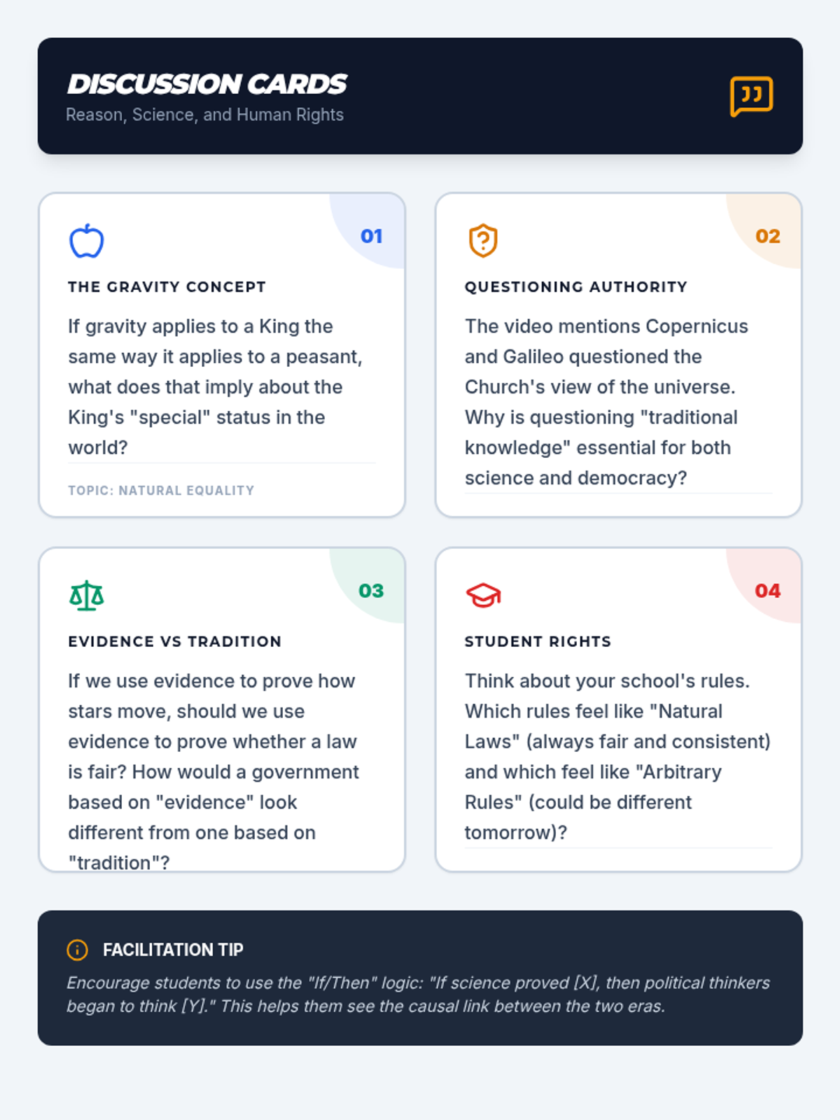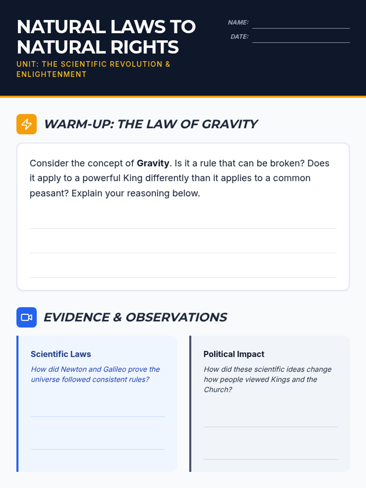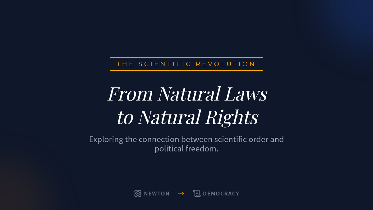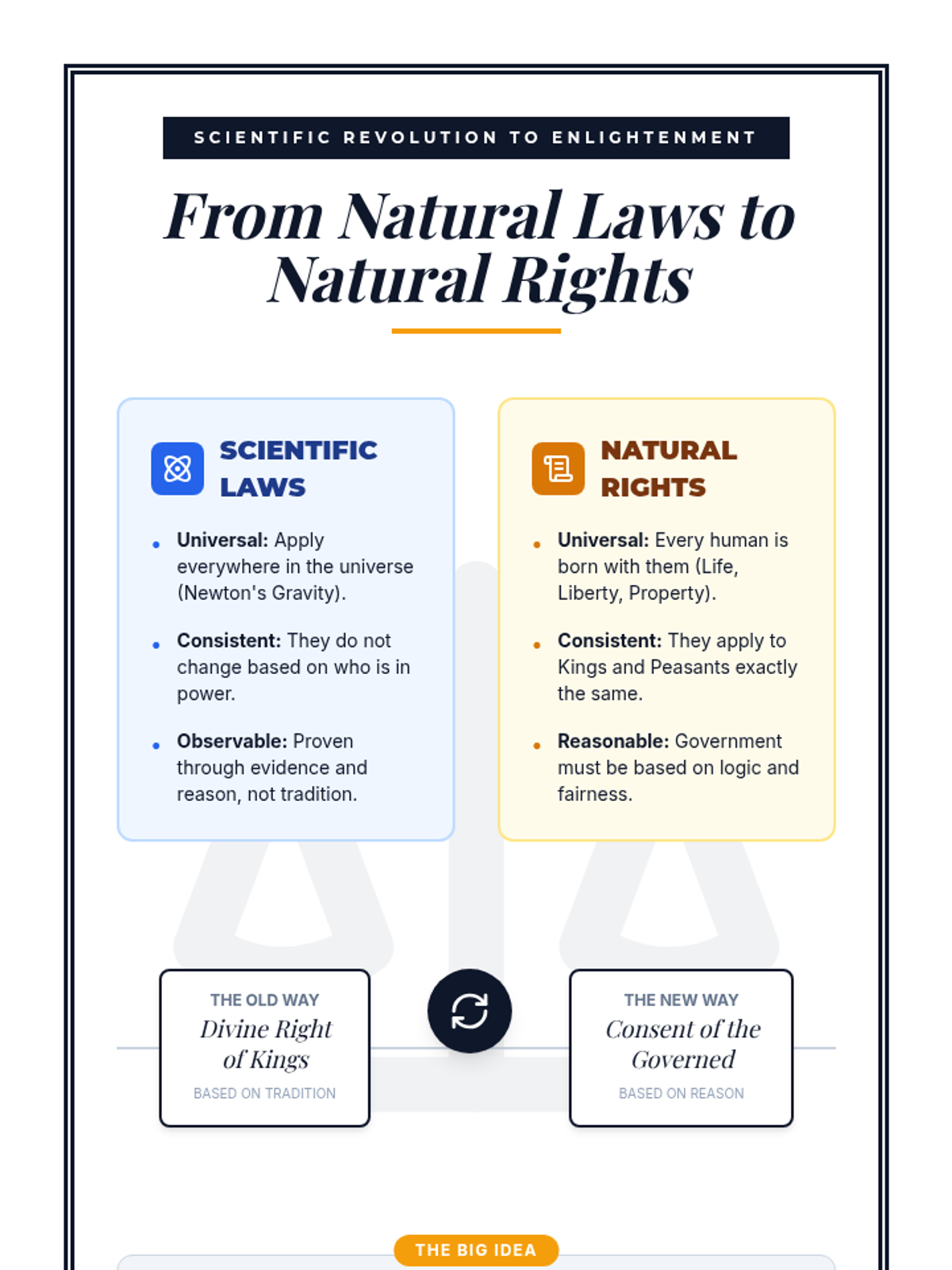 Students explore how the Scientific Revolution's discovery of universal natural laws, like Newton's gravity, inspired Enlightenment thinkers to develop concepts of natural rights and democracy, moving society from the 'Divine Right' of kings to the power of reason and evidence.