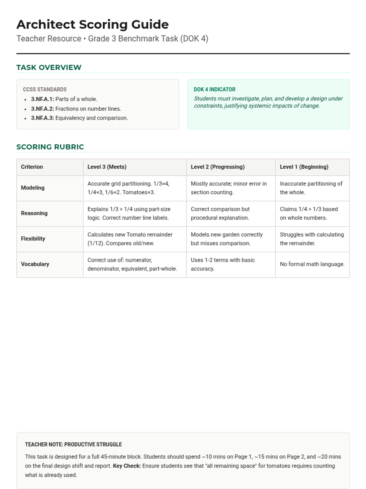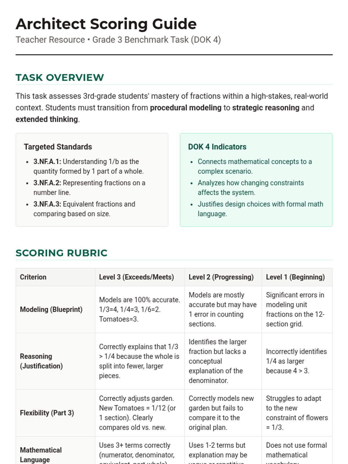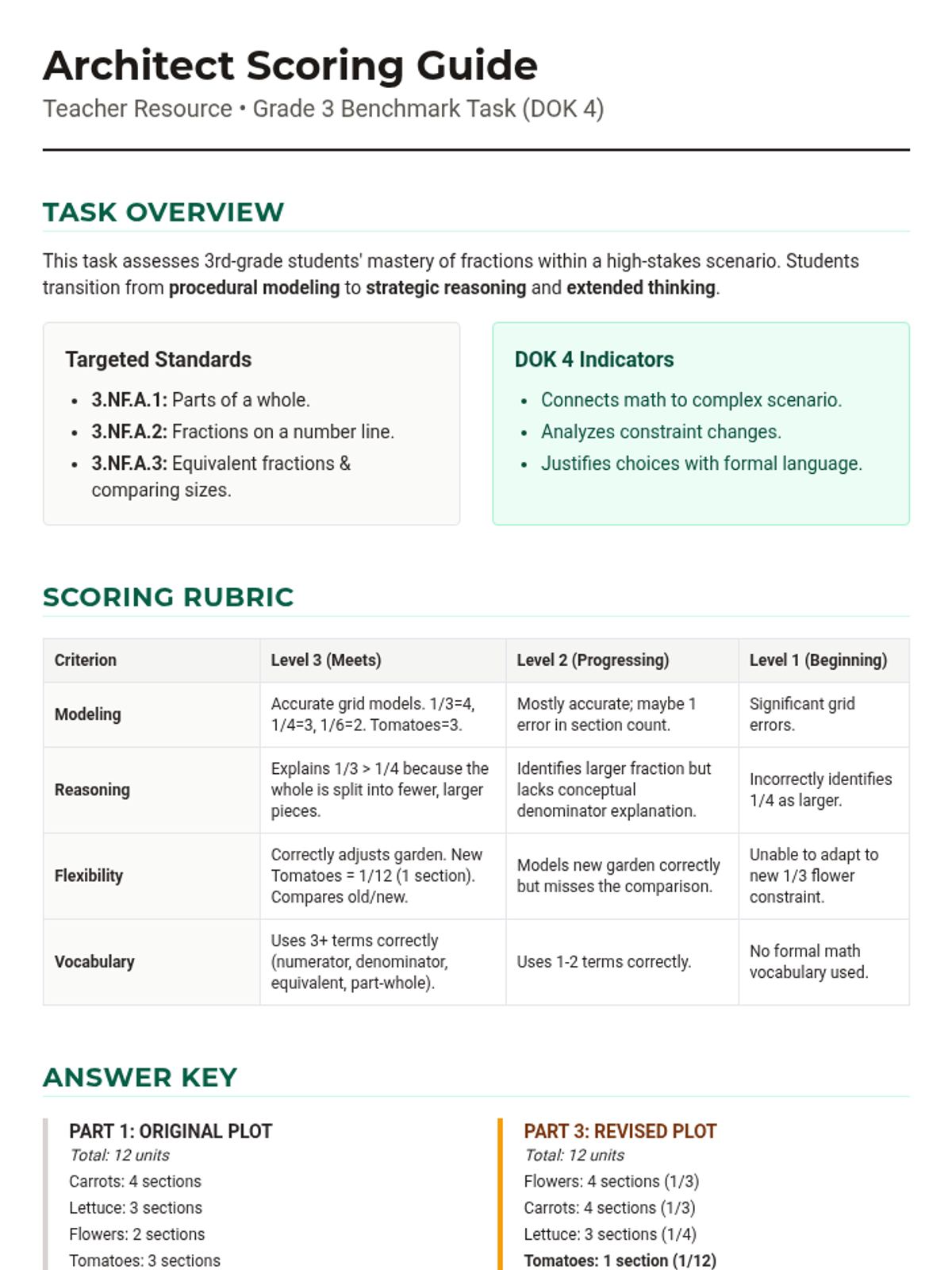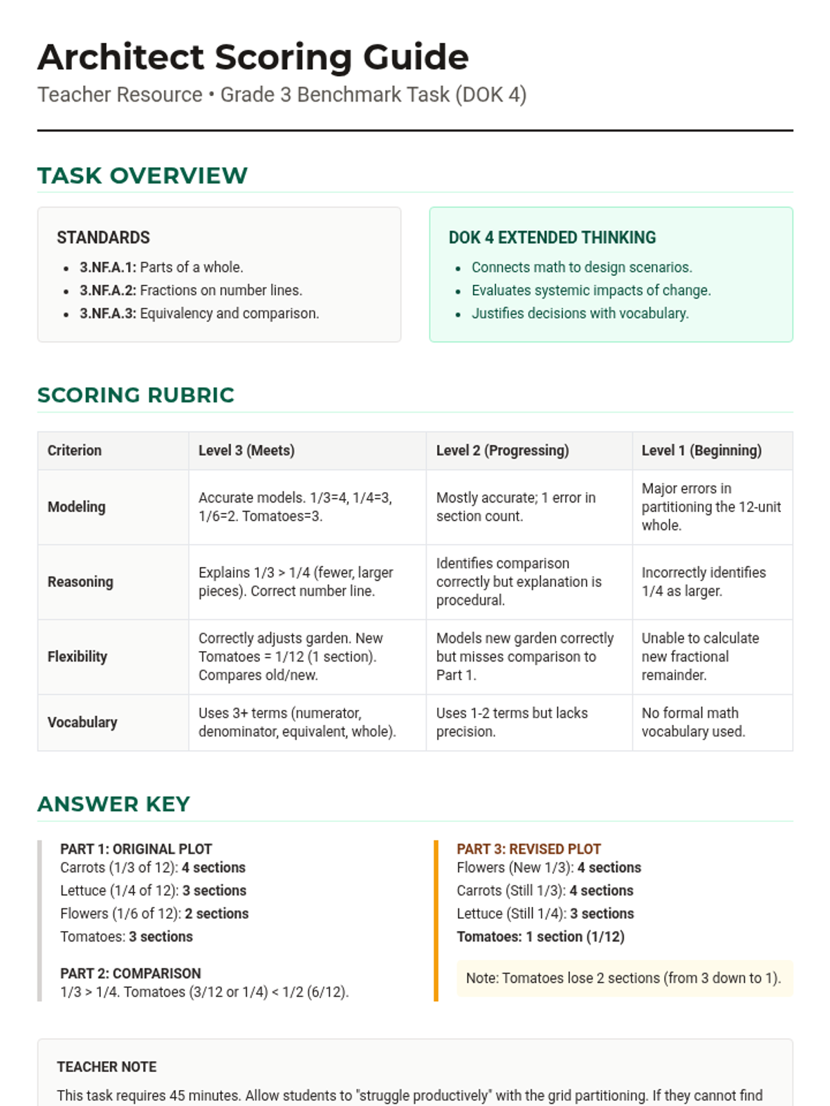 A 45-minute DOK 4 performance task where students act as garden architects. They must apply their knowledge of fraction parts, number lines, and equivalent fractions to design a community garden under specific constraints and justify their mathematical decisions.