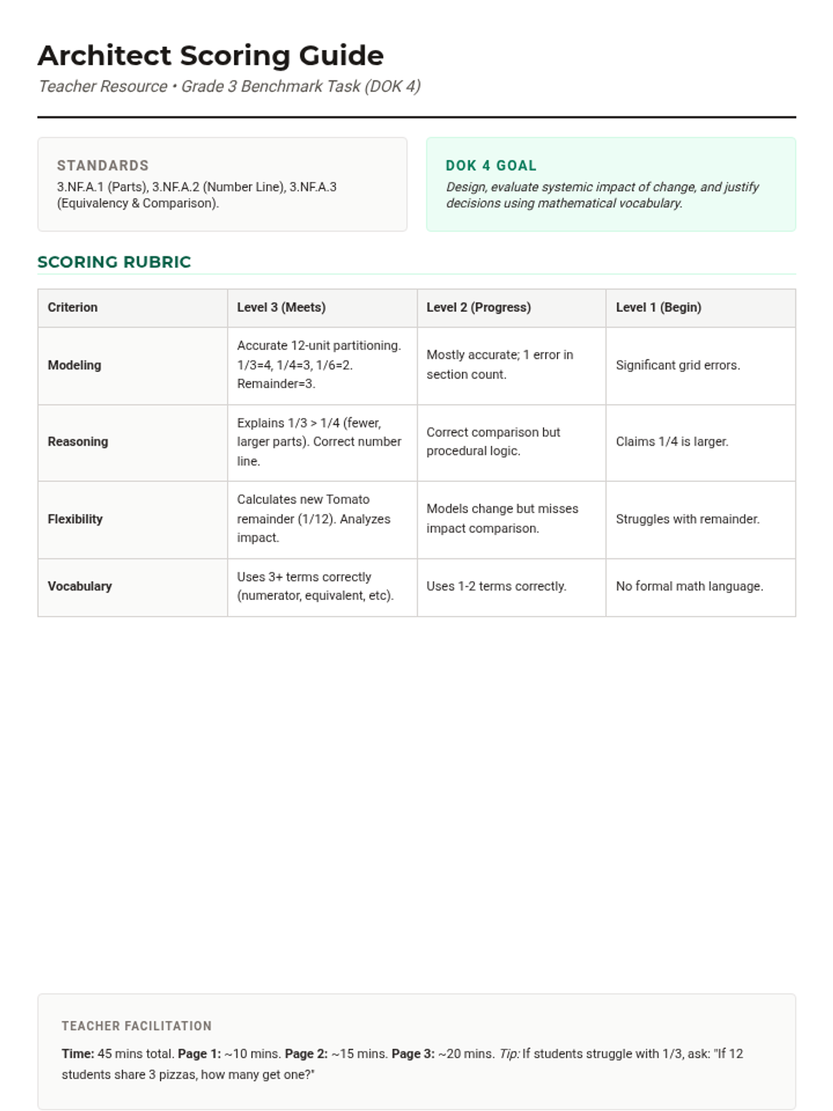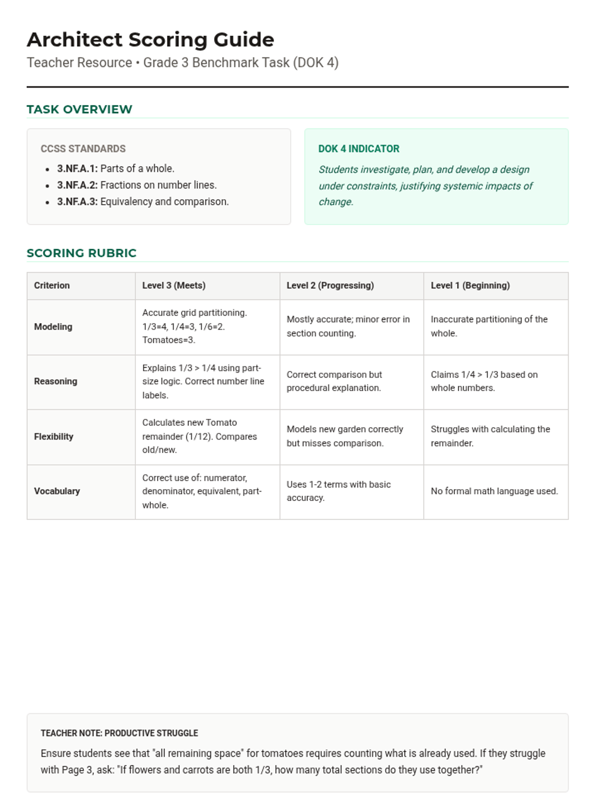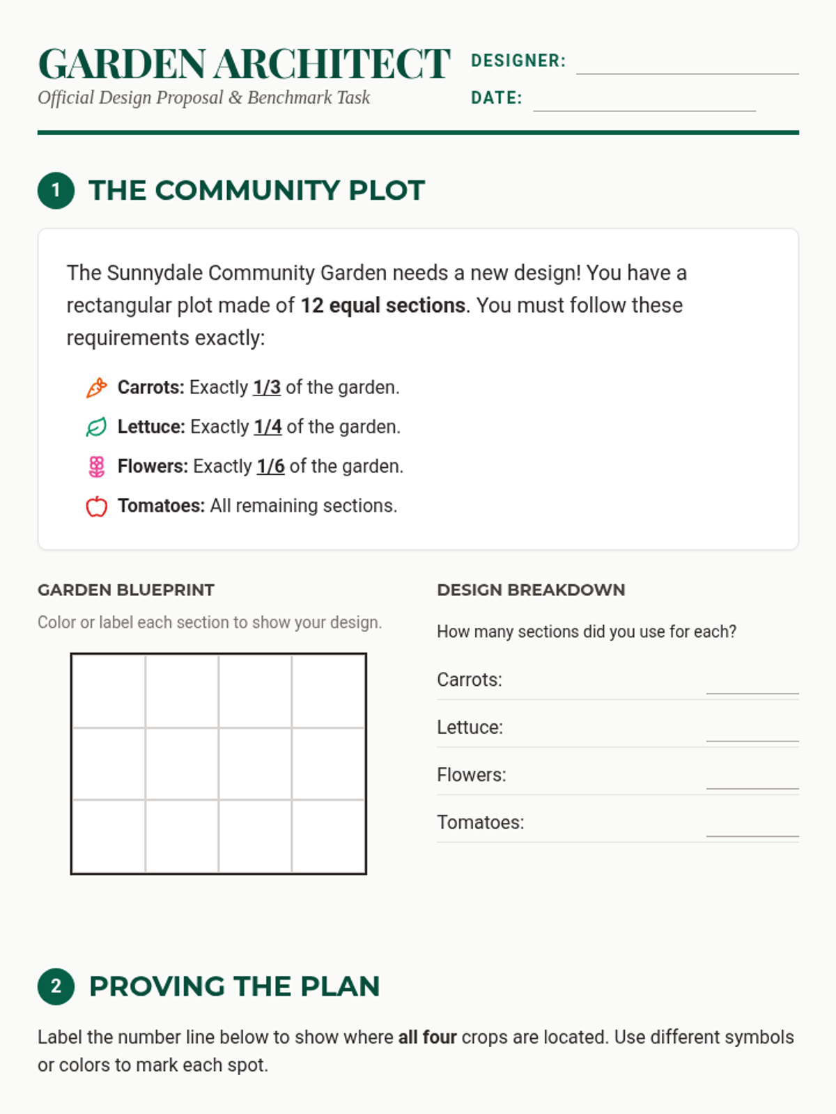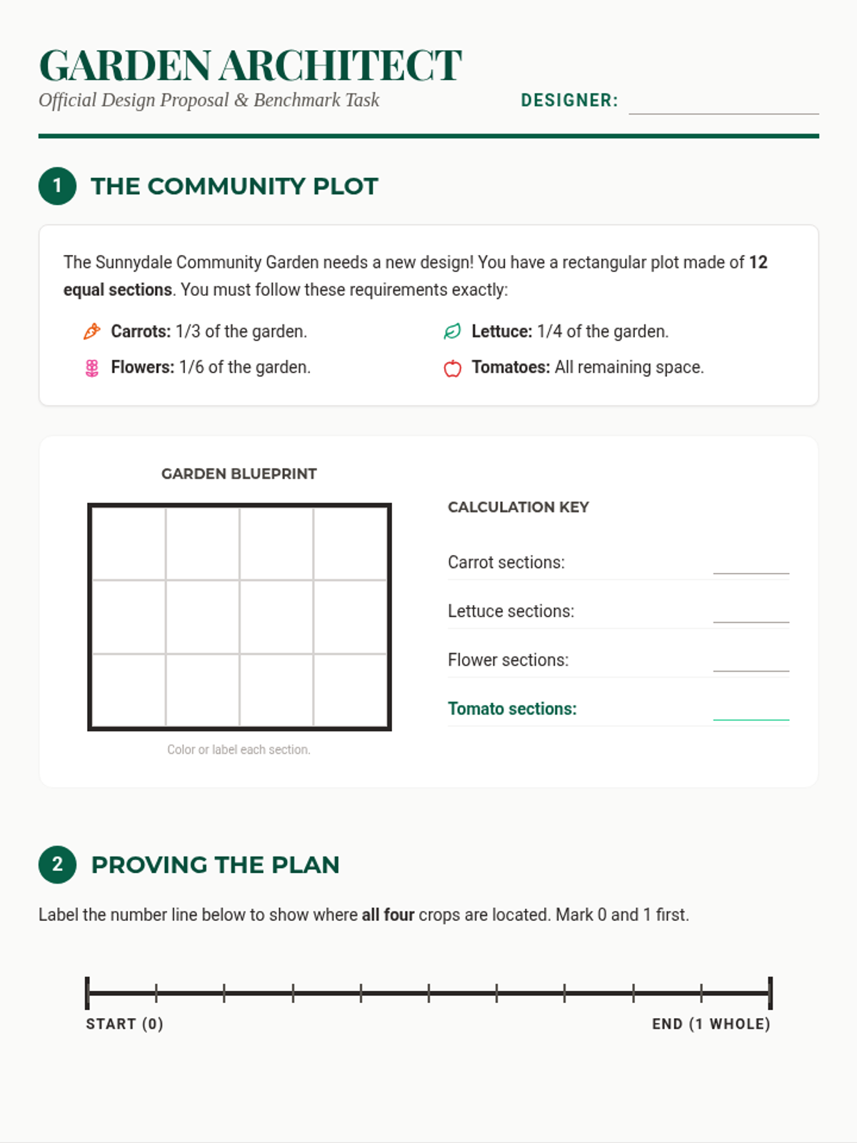 A 45-minute DOK 4 performance task where students act as garden architects. They must apply their knowledge of fraction parts, number lines, and equivalent fractions to design a community garden under specific constraints and justify their mathematical decisions.