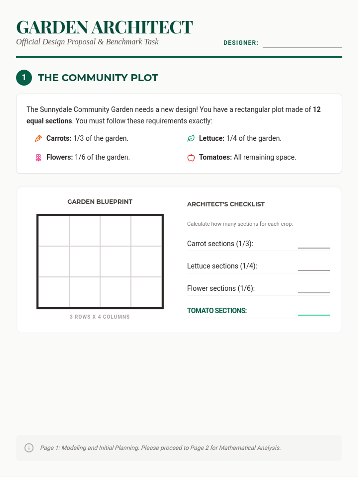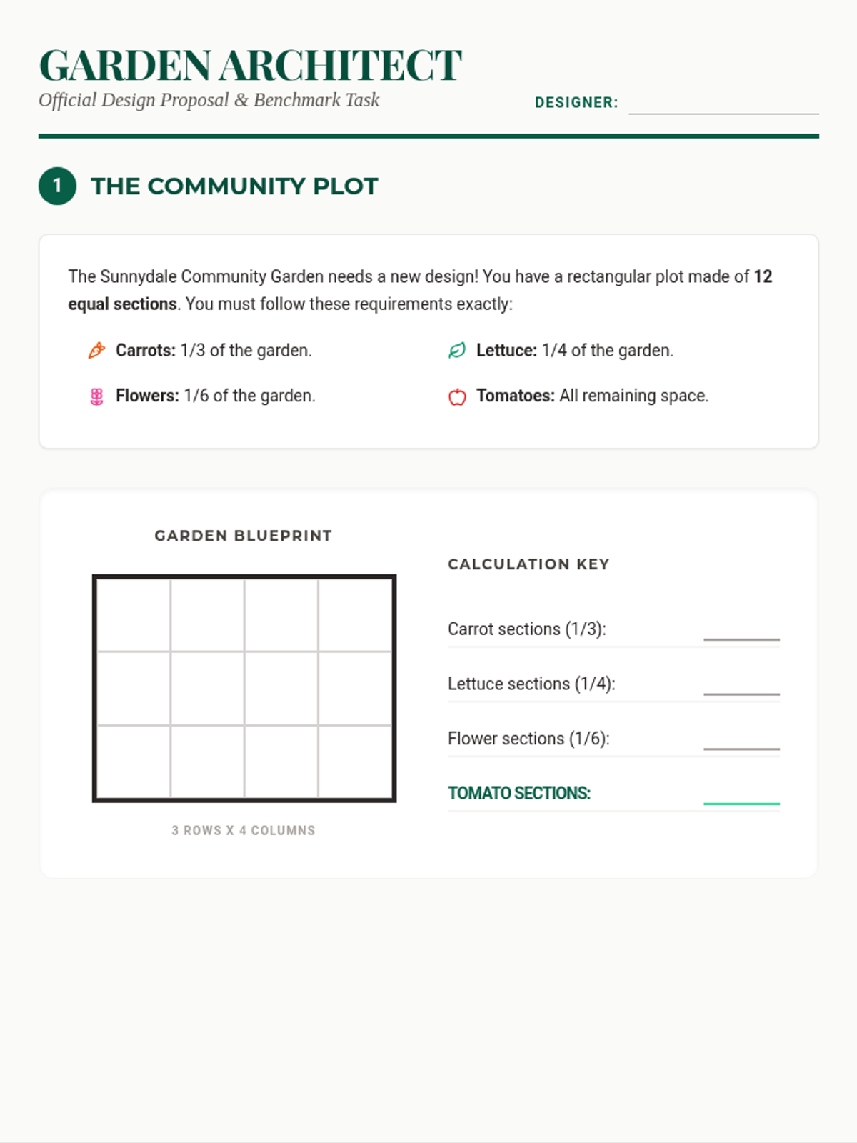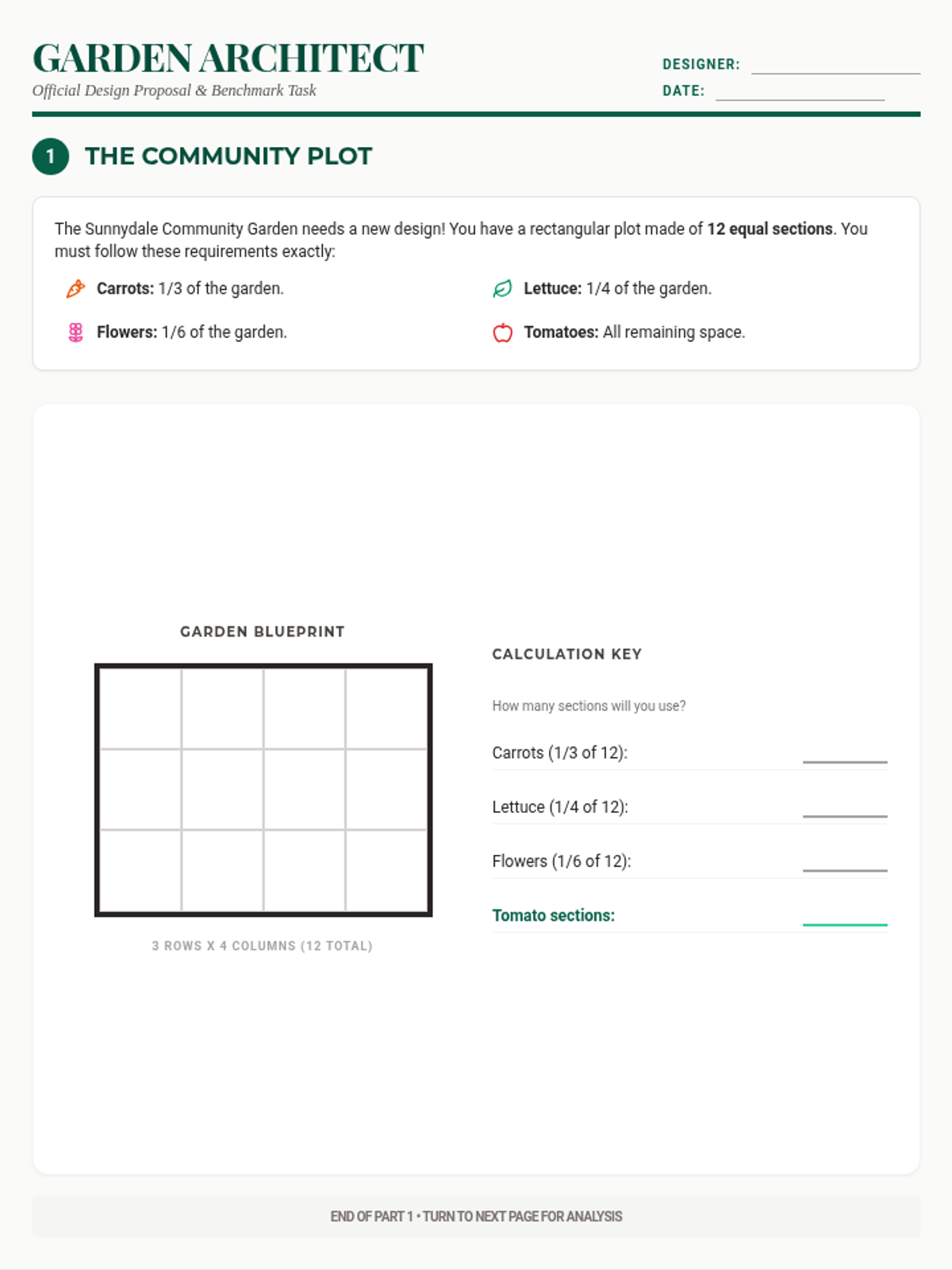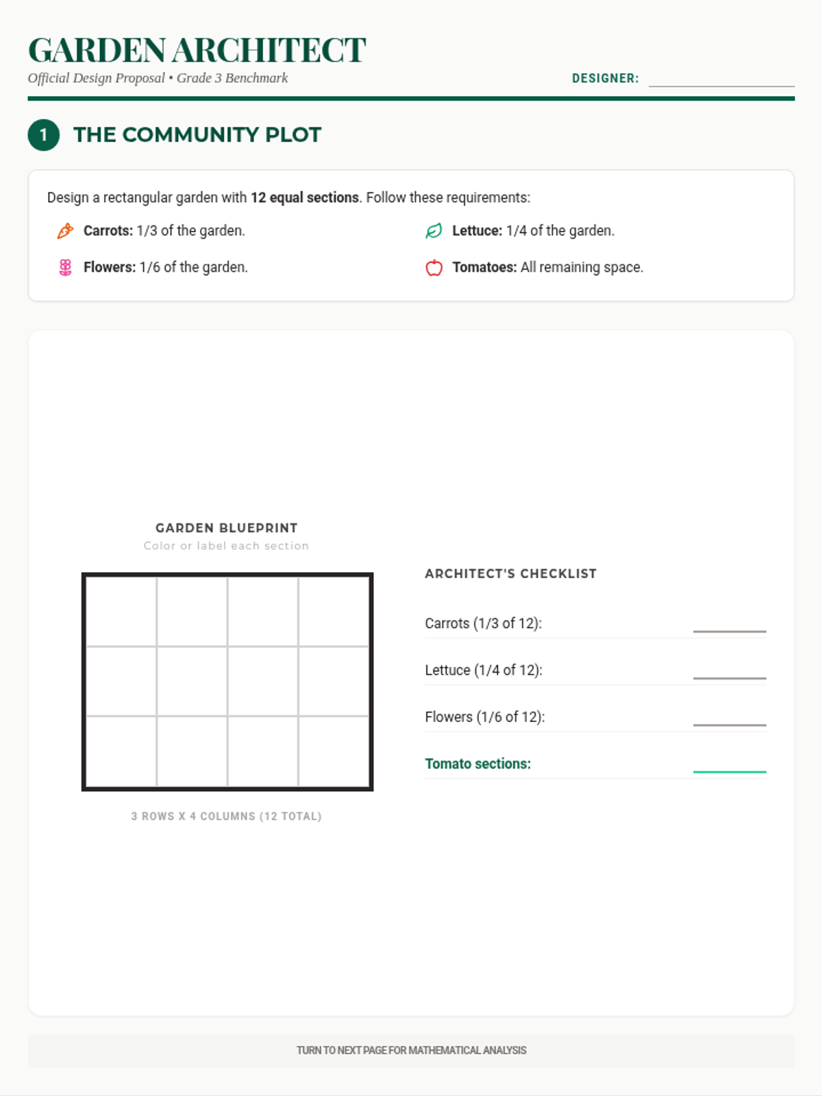 A 45-minute DOK 4 performance task where students act as garden architects. They must apply their knowledge of fraction parts, number lines, and equivalent fractions to design a community garden under specific constraints and justify their mathematical decisions.