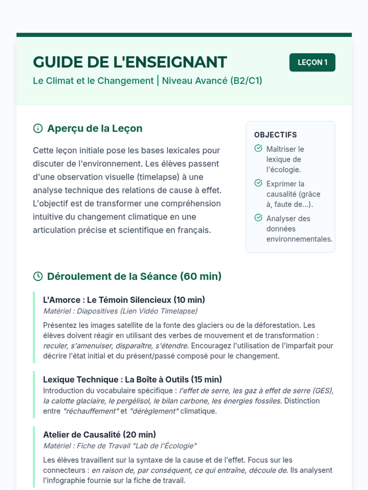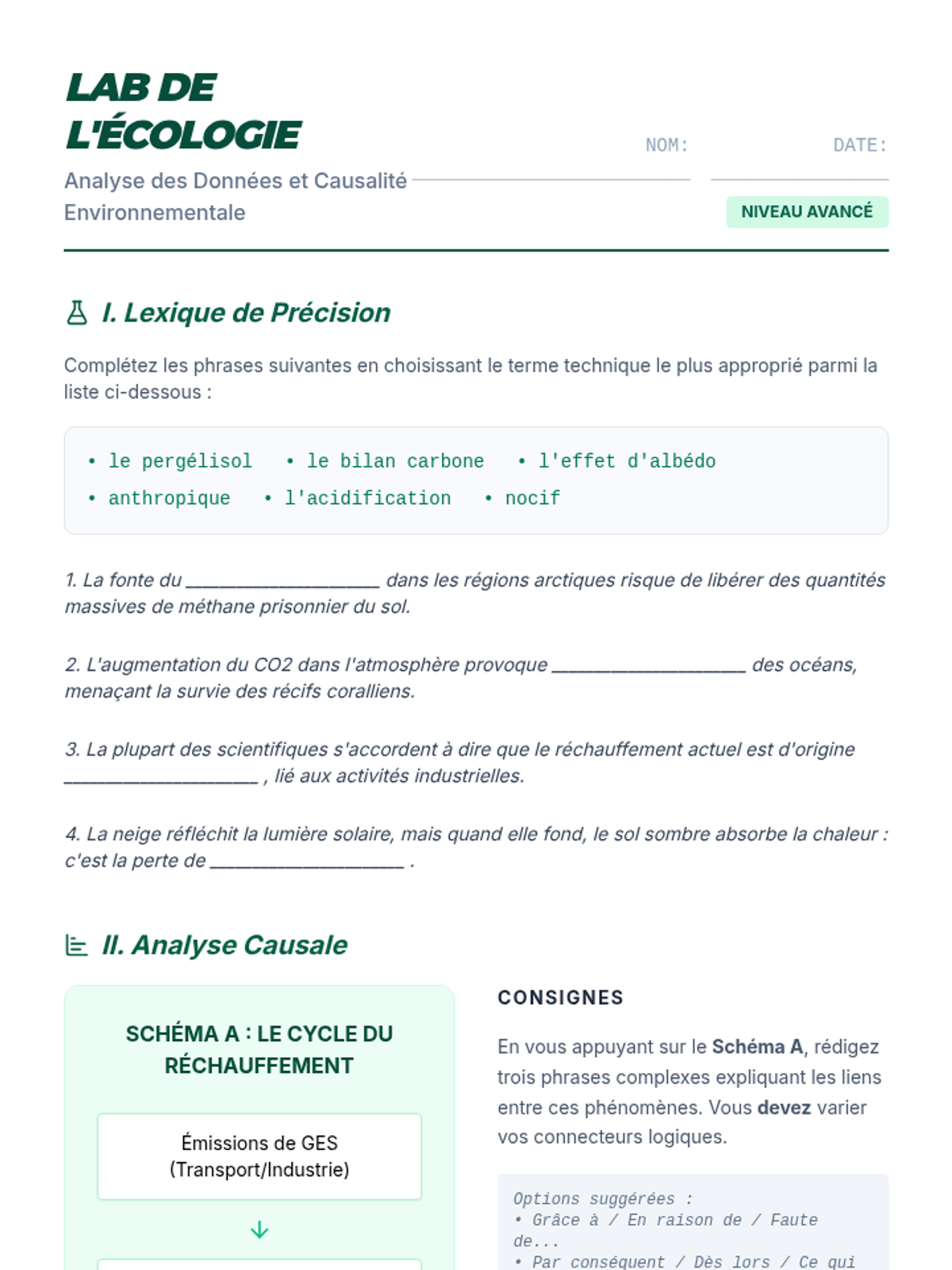 Students build a specialized lexicon for ecology and climate phenomena while practicing cause-and-effect syntax in French. They analyze environmental shifts through visual media and infographics to articulate the impact of human activity on the planet.