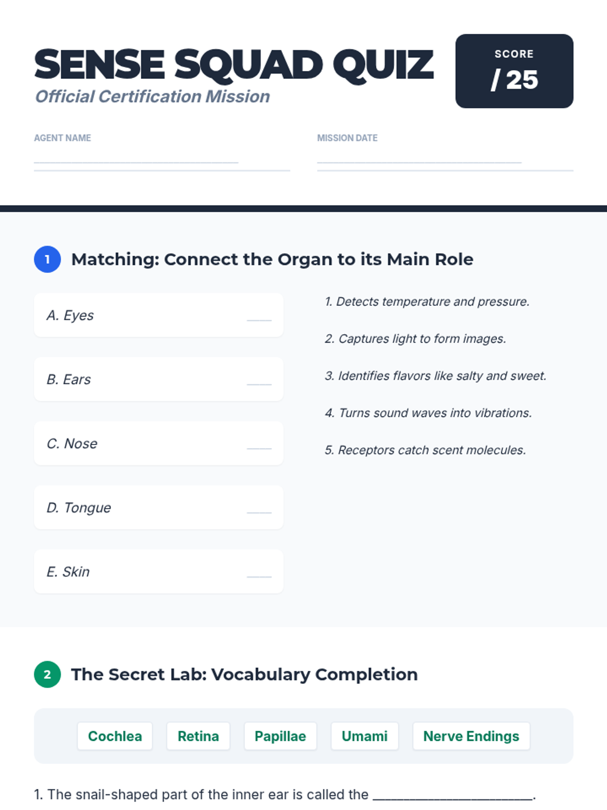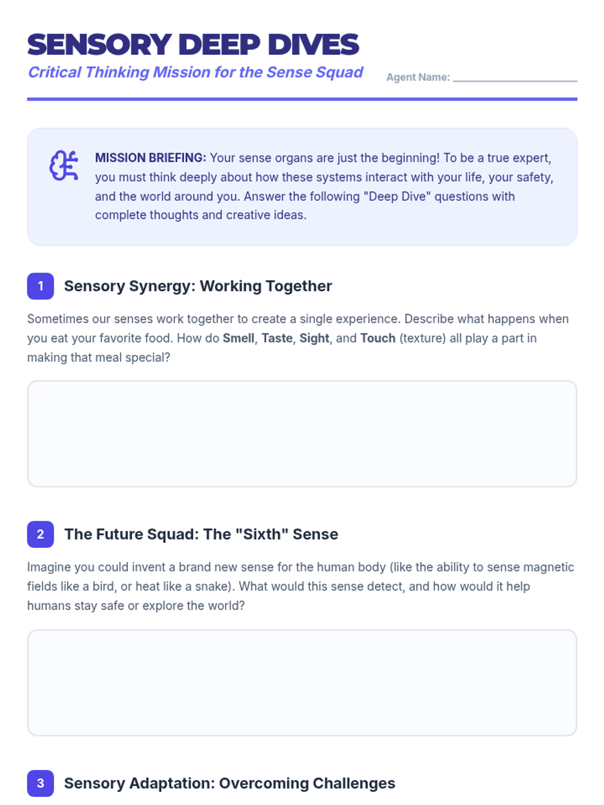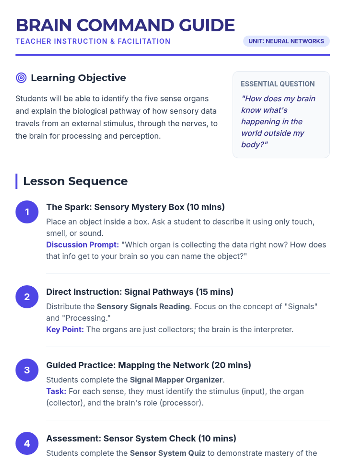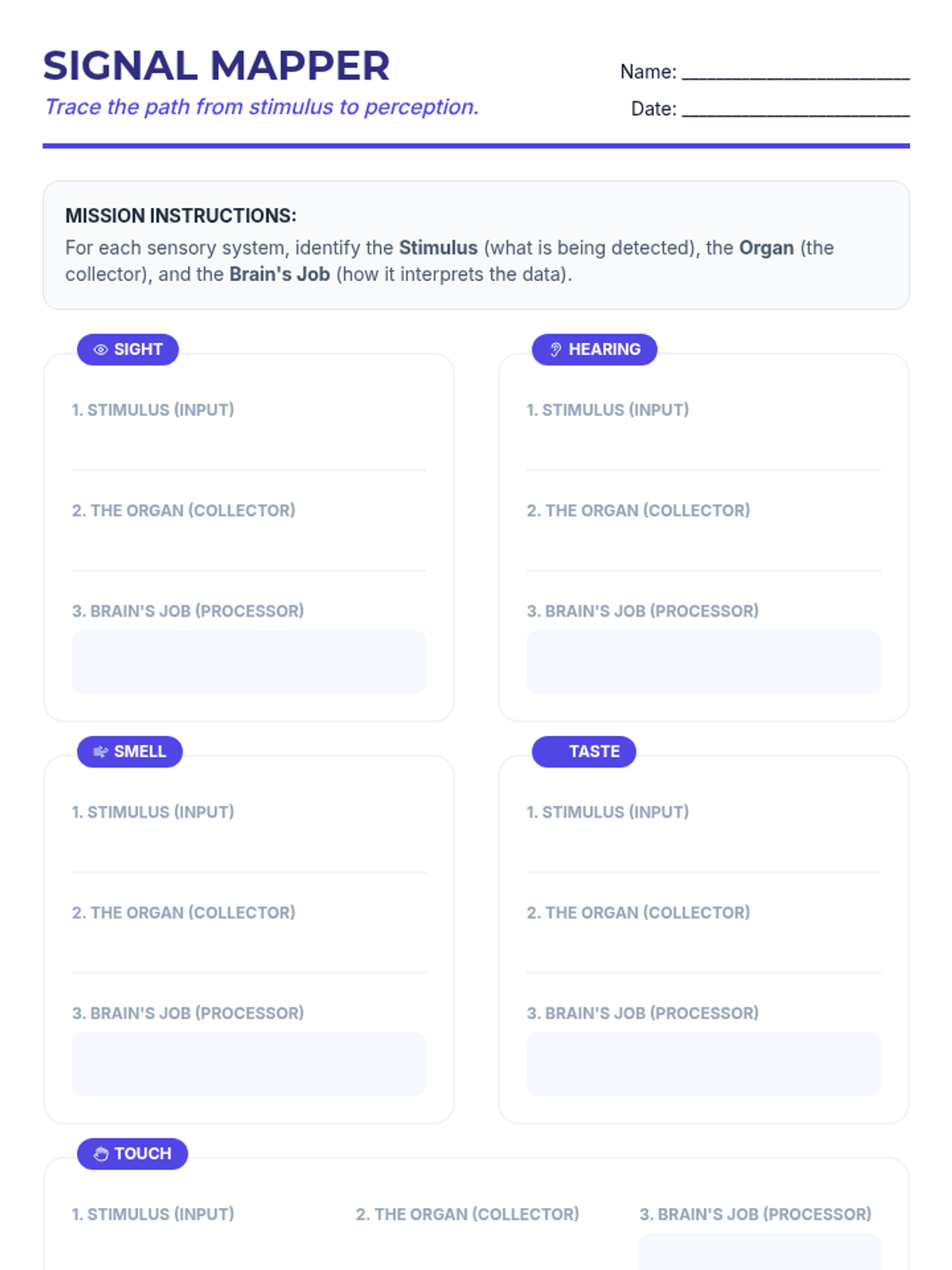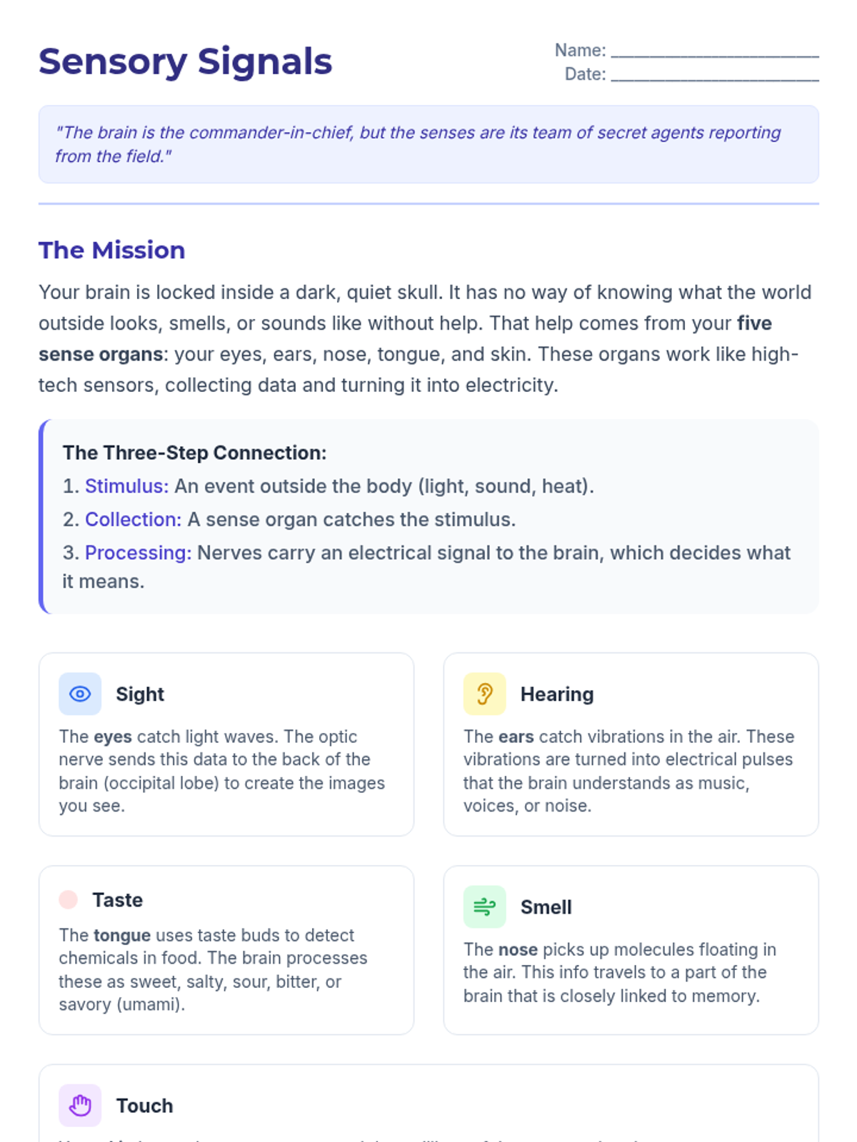 A comprehensive lesson exploring how the five sense organs collect data and send signals to the brain for processing. Students will learn the pathway from stimulus to perception through reading, mapping, and assessment.