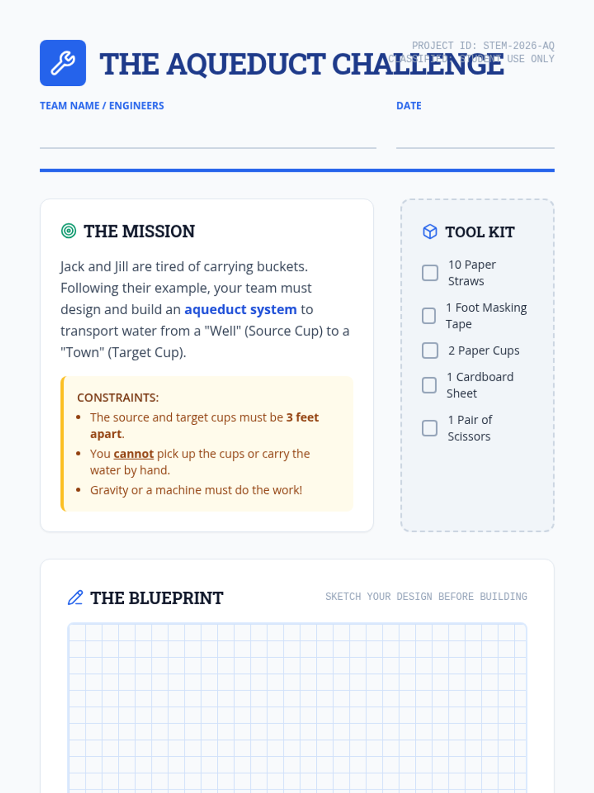 A 5th-grade STEM lesson where students explore the concept of neurodiversity and engineering through the lens of Jack and Jill's creative solution to a water transport problem. Students will design and build their own aqueducts to move water without carrying it, reflecting on how 'thinking outside the box' leads to innovation.