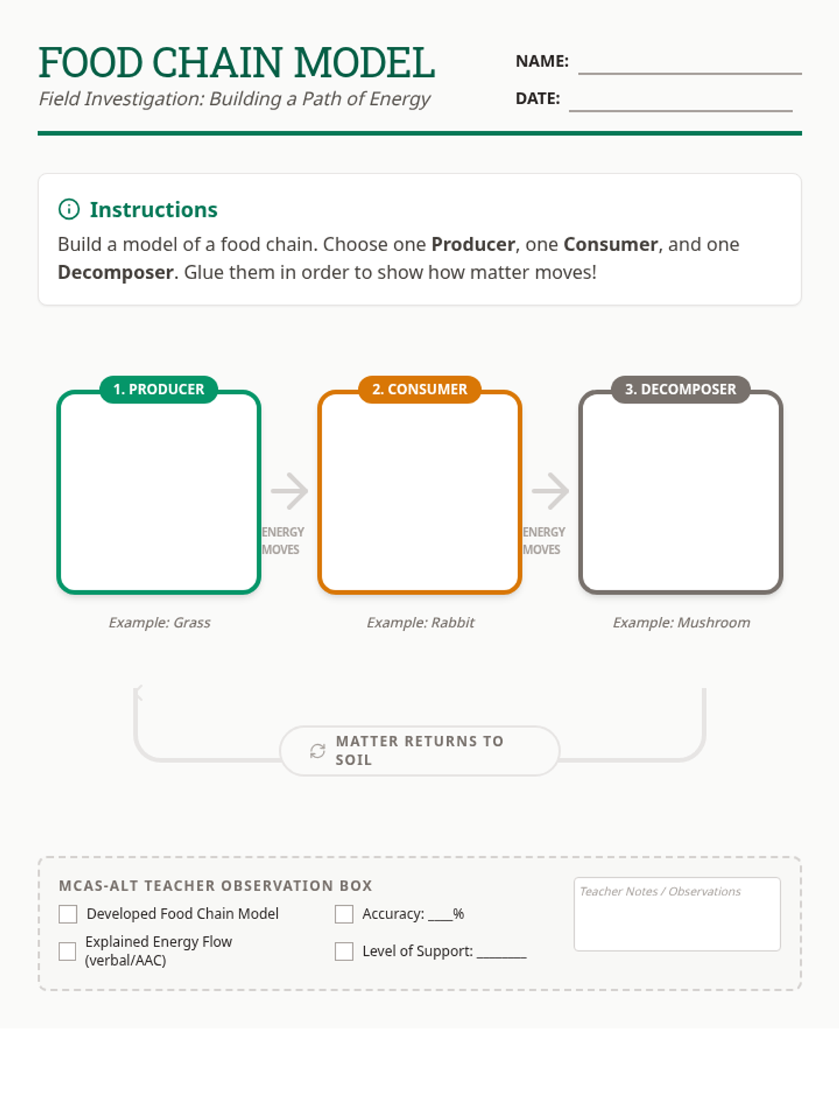 A comprehensive resource set for teaching and assessing the flow of matter in ecosystems, specifically designed for MCAS-Alt data collection. Students will identify roles (producer, consumer, decomposer) and build models of energy flow using food chains.