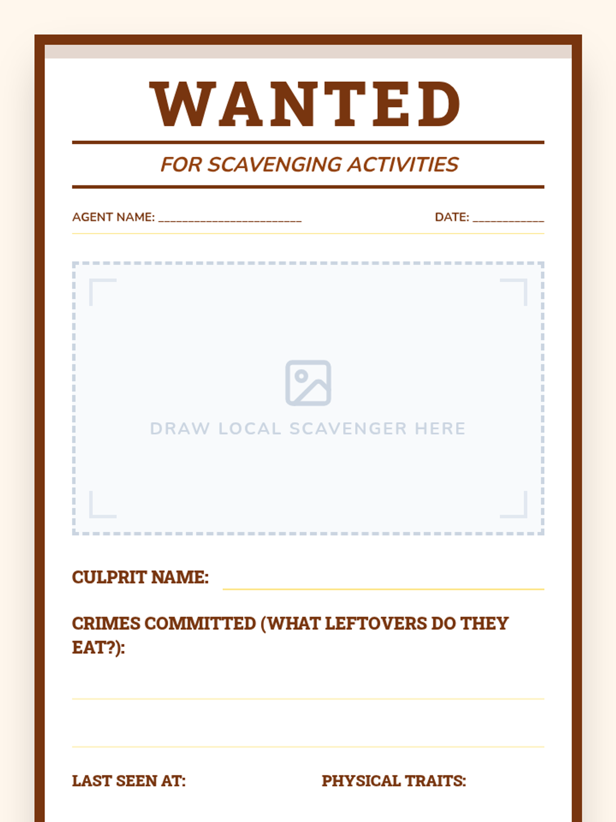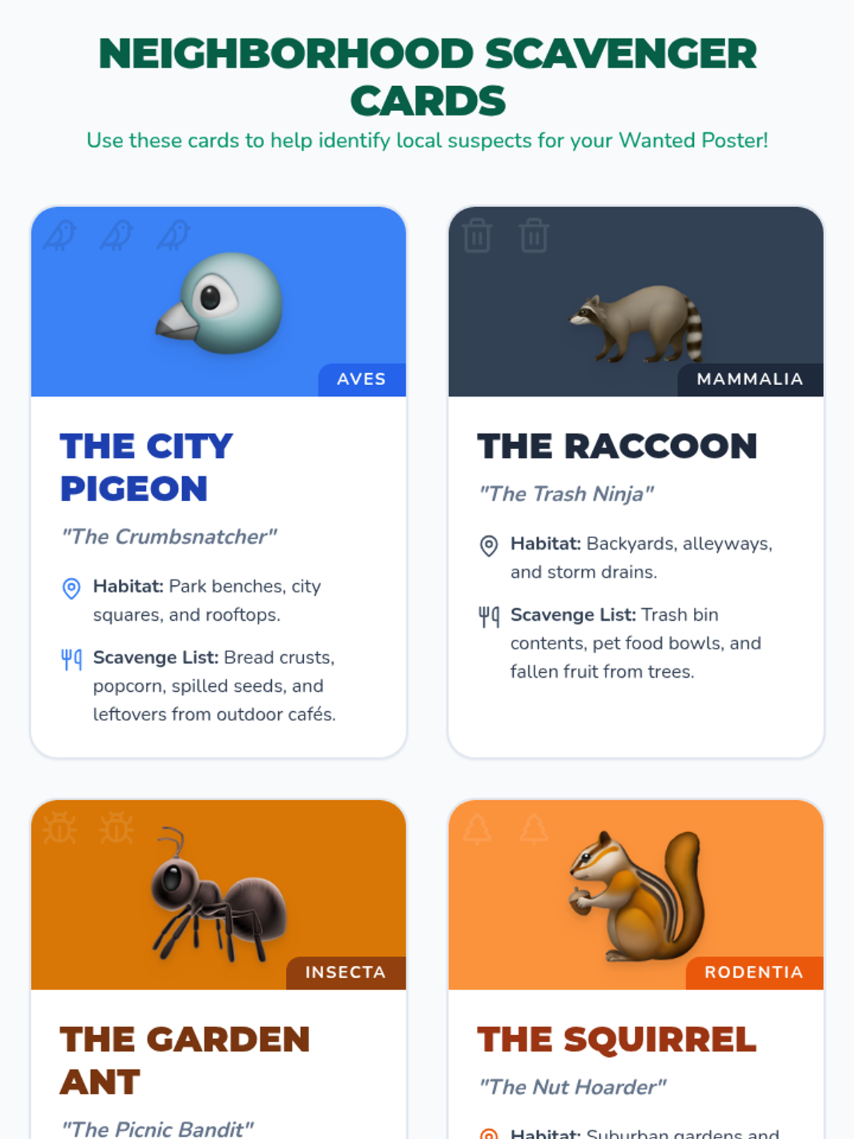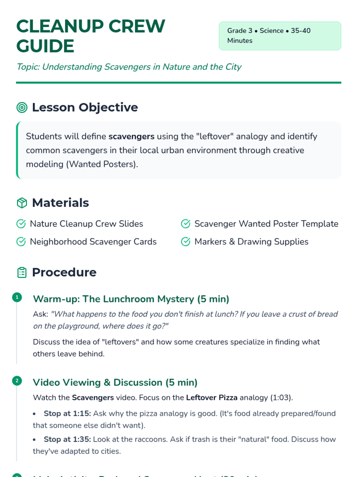 A 3rd-grade science lesson introducing the concept of scavengers as nature's 'cleanup crew' using a relatable pizza analogy and focusing on local urban wildlife. Students identify scavengers in their own neighborhoods and create creative 'Wanted' posters.