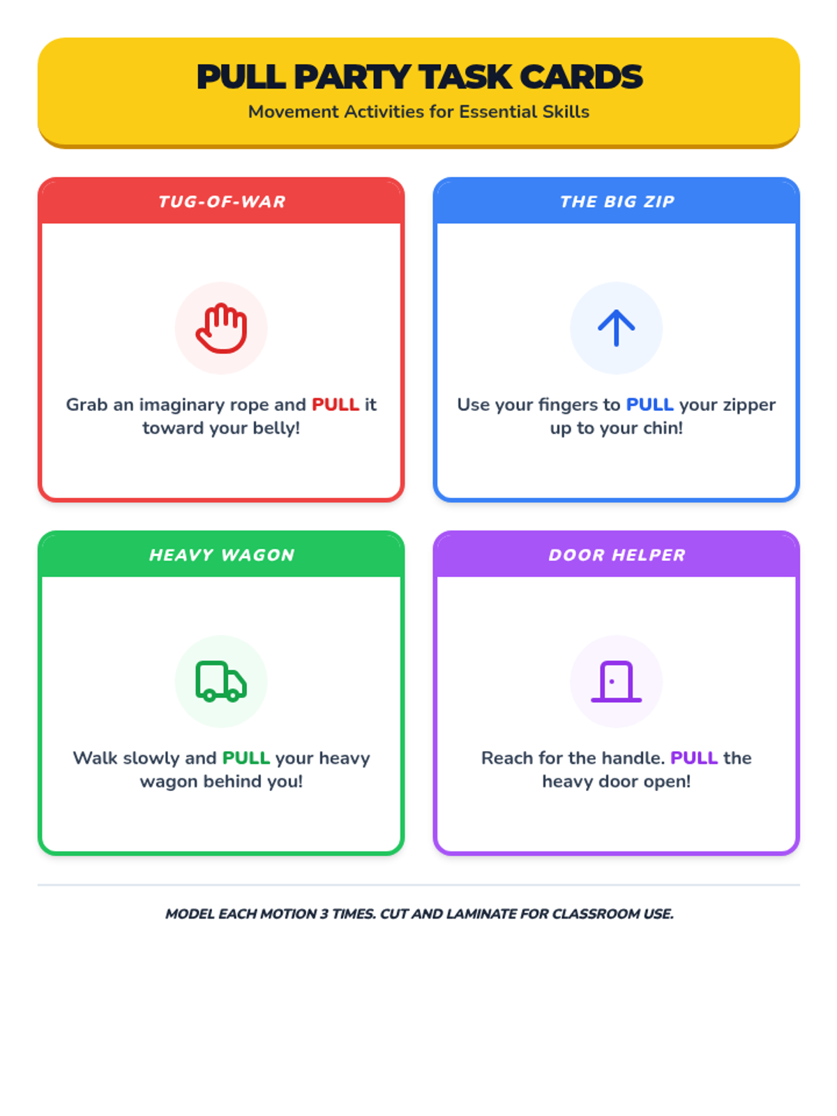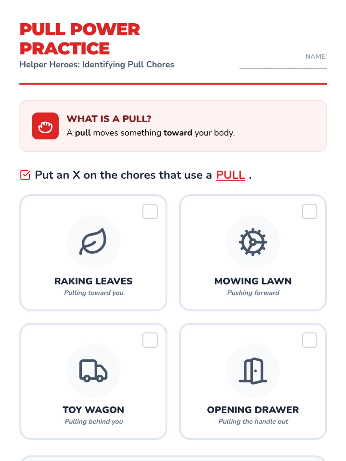 An introduction to the concept of 'Pull' through tasks like opening drawers, raking leaves, and pulling a wagon.